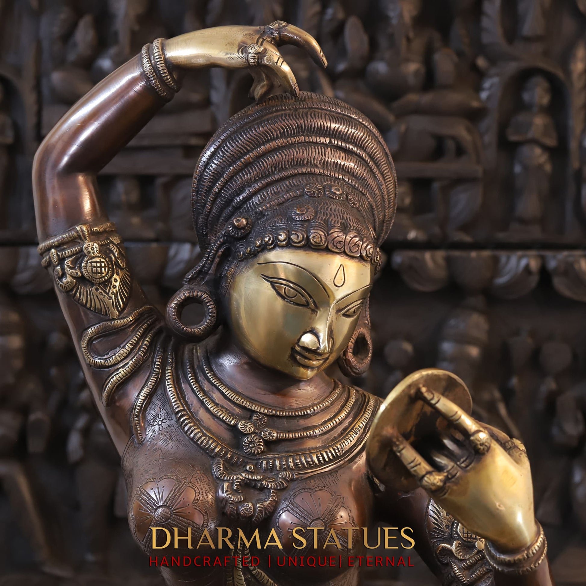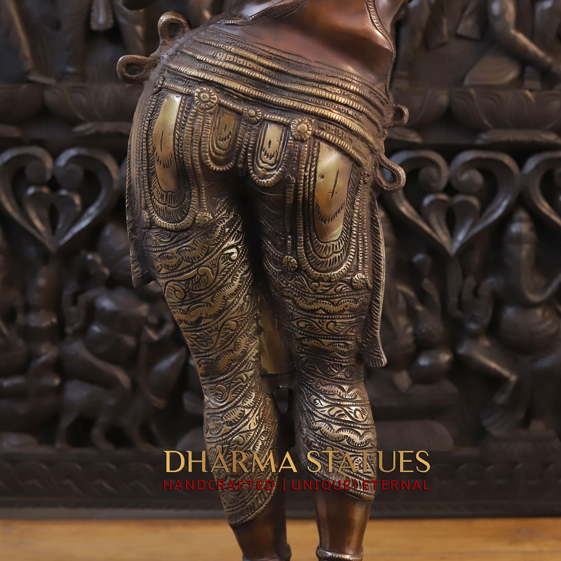 The Brass Mirror Lady Standing sculpture combines the elegance of copper and gold finishes. This piece showcases a lady standing gracefully, adorned with intricate detailing that highlights her beauty and poise. Crafted with meticulous artistry, it reflects the fusion of traditional craftsmanship and artistic expression. Ideal for enhancing interiors with its radiant colors and timeless appeal, this statue serves as a testament to the skilled artisan.