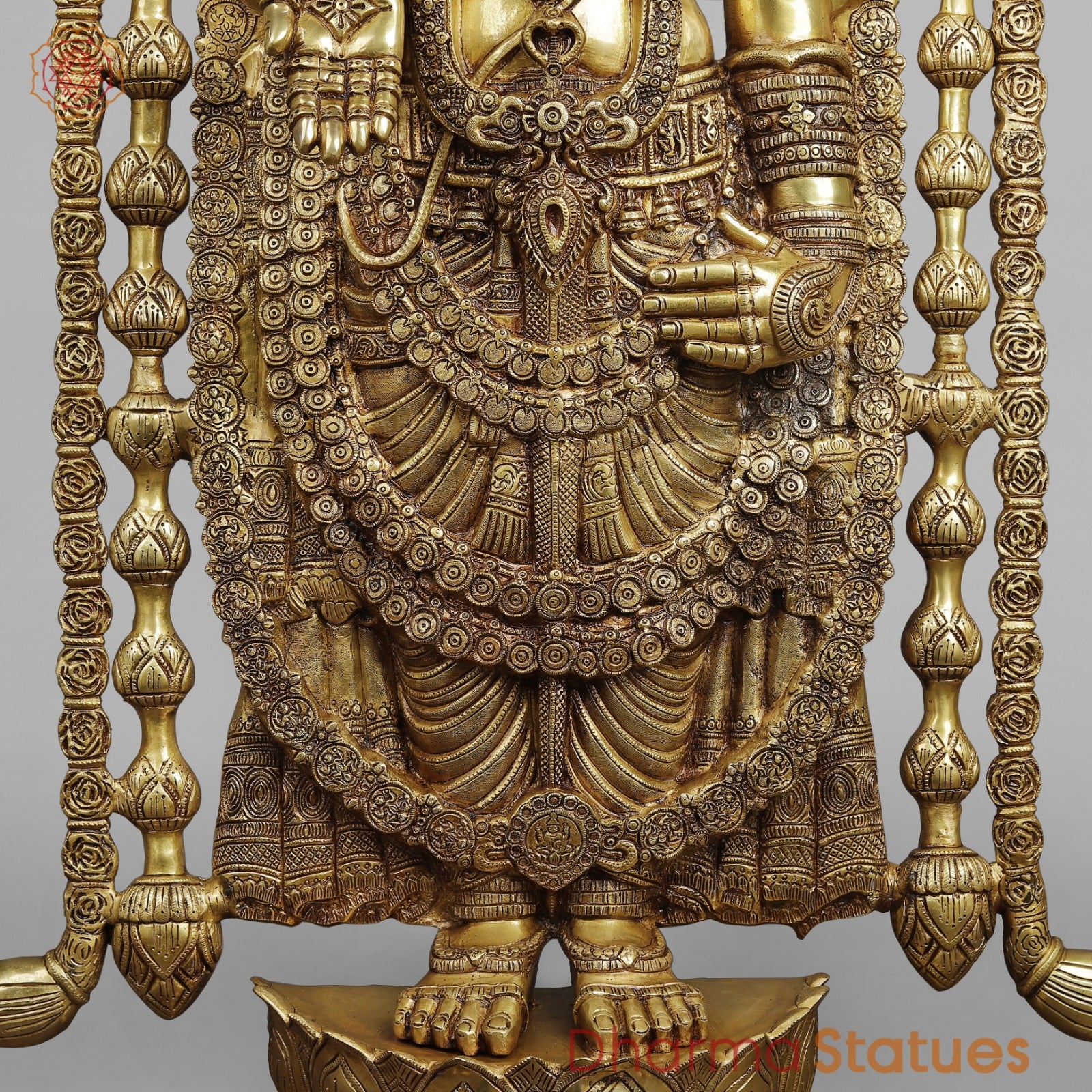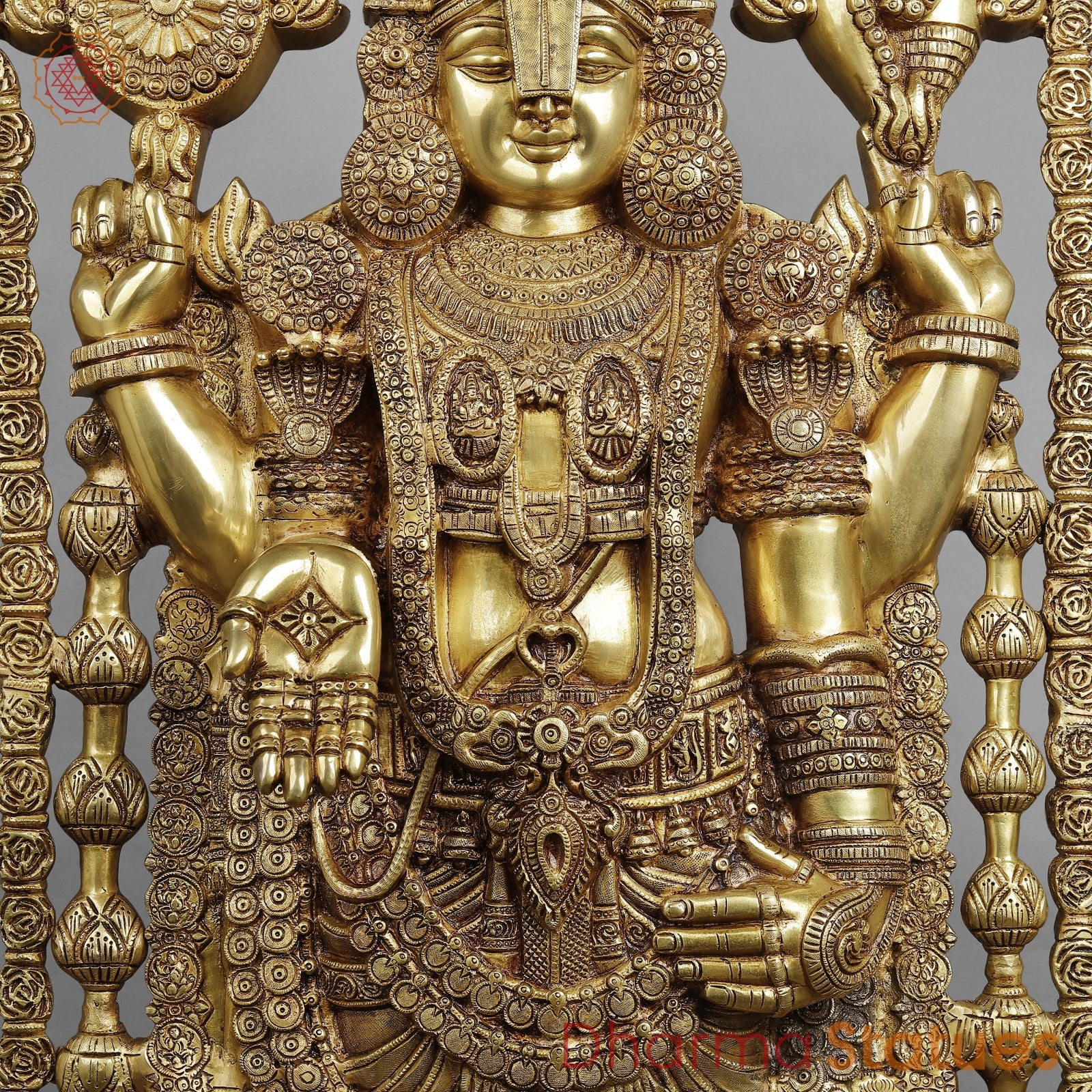 Elevate your sacred space with this magnificent 57.5-inch Brass Balaji Statue, a masterpiece of traditional craftsmanship and divine artistry. Hand-crafted by skilled artisans, this statue captures the serene and benevolent presence of Lord Balaji (Venkateswara) with exceptional detailing, from the ornate crown to the beautifully carved garlands and the traditional Shankha and Chakra.