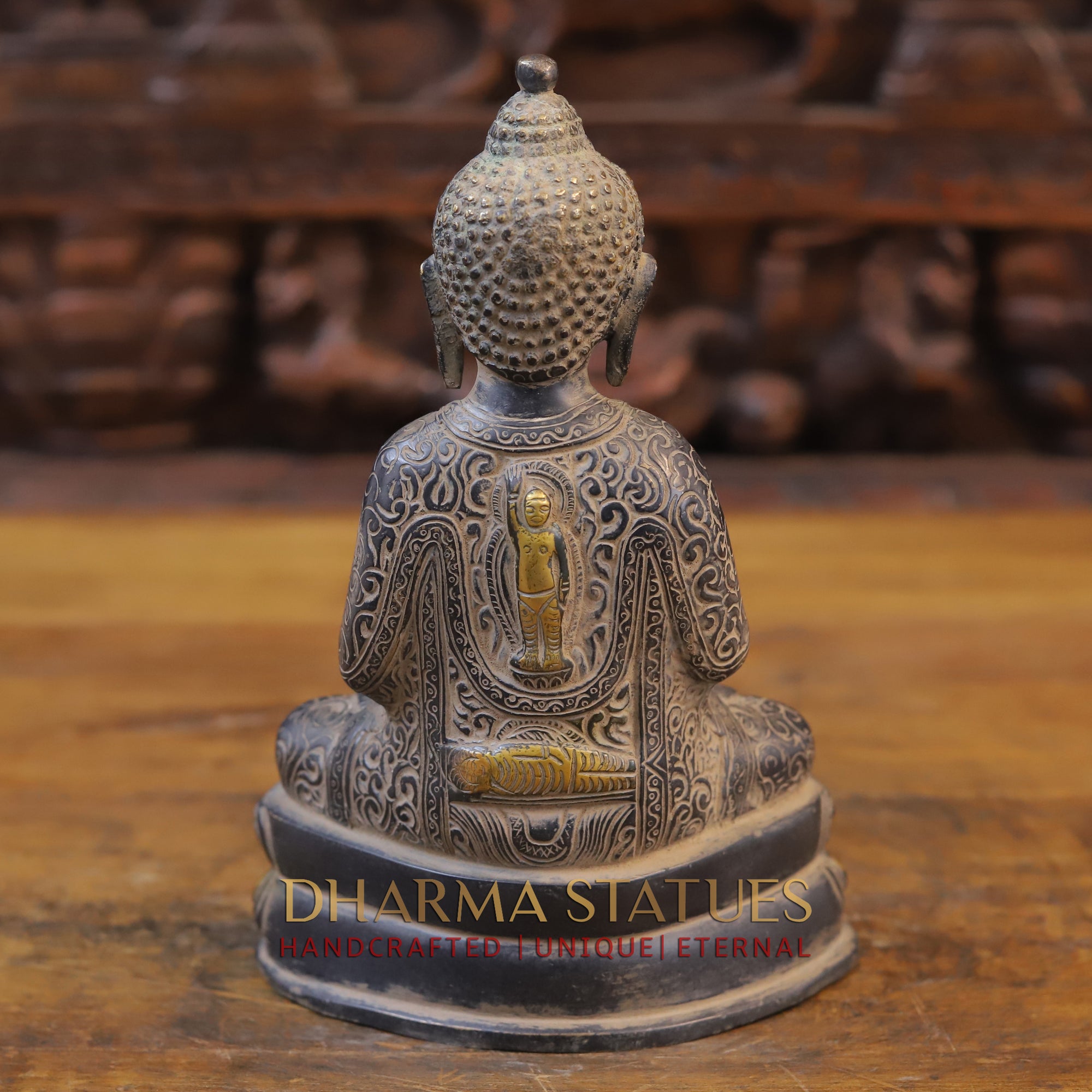 Experience inner peace and tranquility with our Brass Buddha figurine in Meditation Mudra. Crafted from brass with a black patina and golden finish, this 8" statue exudes an aura of serenity and wisdom. Perfect for adding a touch of spiritual inspiration to any space.