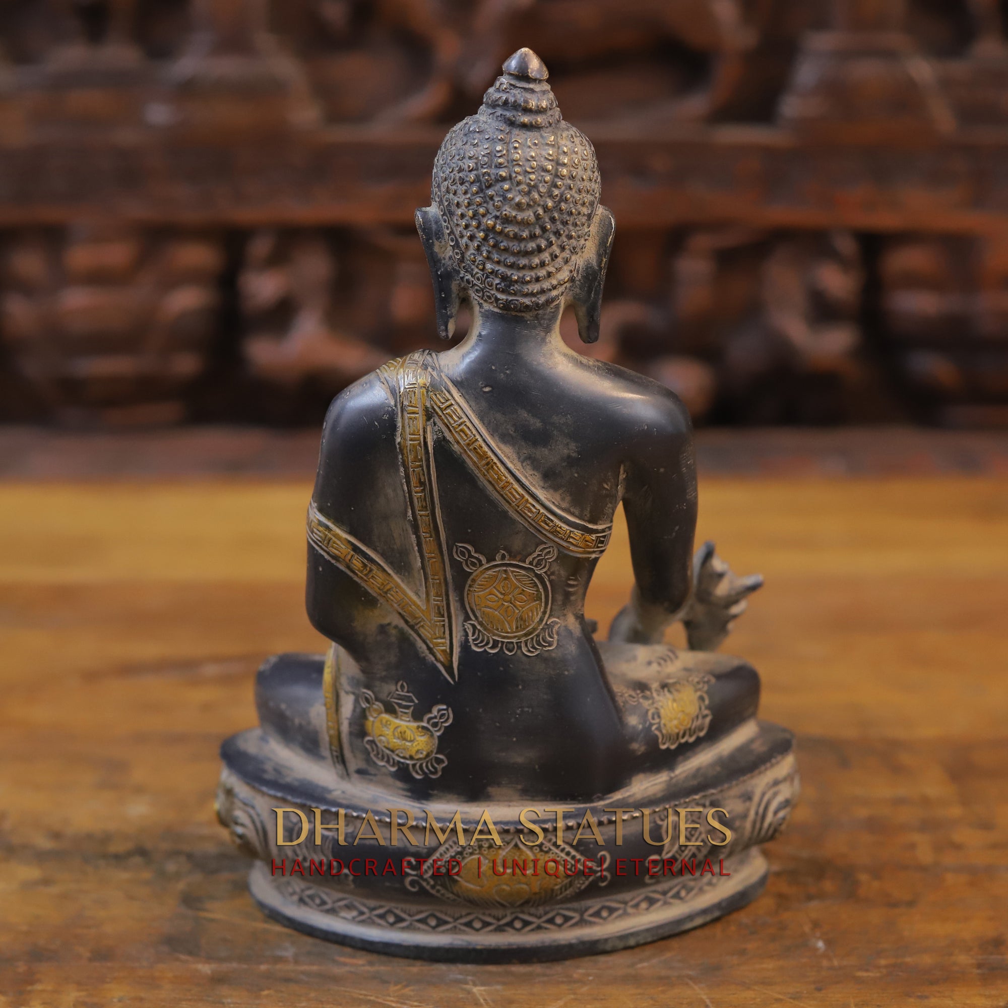 Crafted with expert precision, our 10" Brass Buddha statue brings a sense of tranquility to any space. The striking combination of a black patina and golden finish highlights the intricate details, adding a touch of elegance to your home or office. Embrace inner peace with this handcrafted masterpiece.
