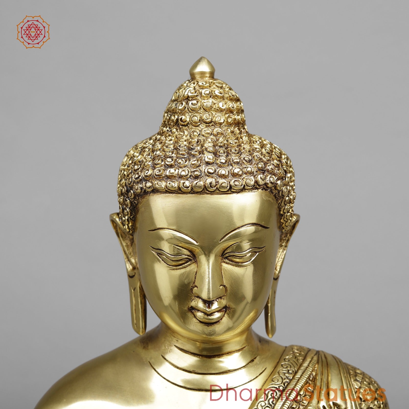 Brass Buddha Seated Full Robbed Blessing, Fine Golden Finish 22”