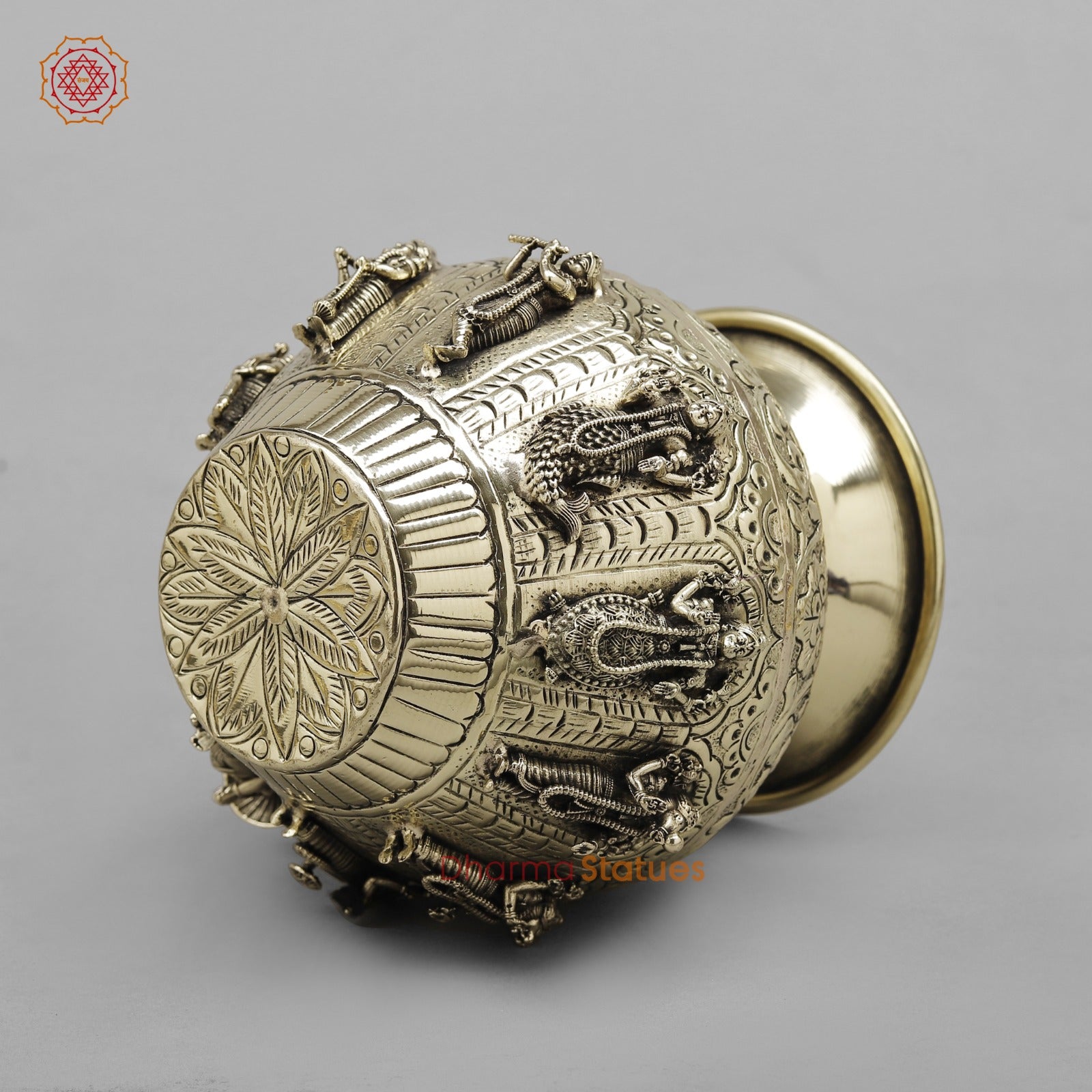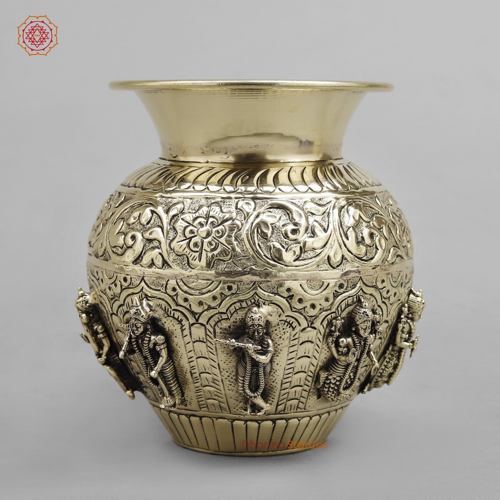 A beautifully handcrafted brass Kalash adorned with detailed carvings of the Dasavatara (ten incarnations of Lord Vishnu). Finished with a rich fine polish and traditional floral motifs, this sacred Kalash is ideal for pooja rituals, temple use, festivals, and auspicious ceremonies. It symbolizes protection, balance, and divine order, making it a meaningful addition to any spiritual space.