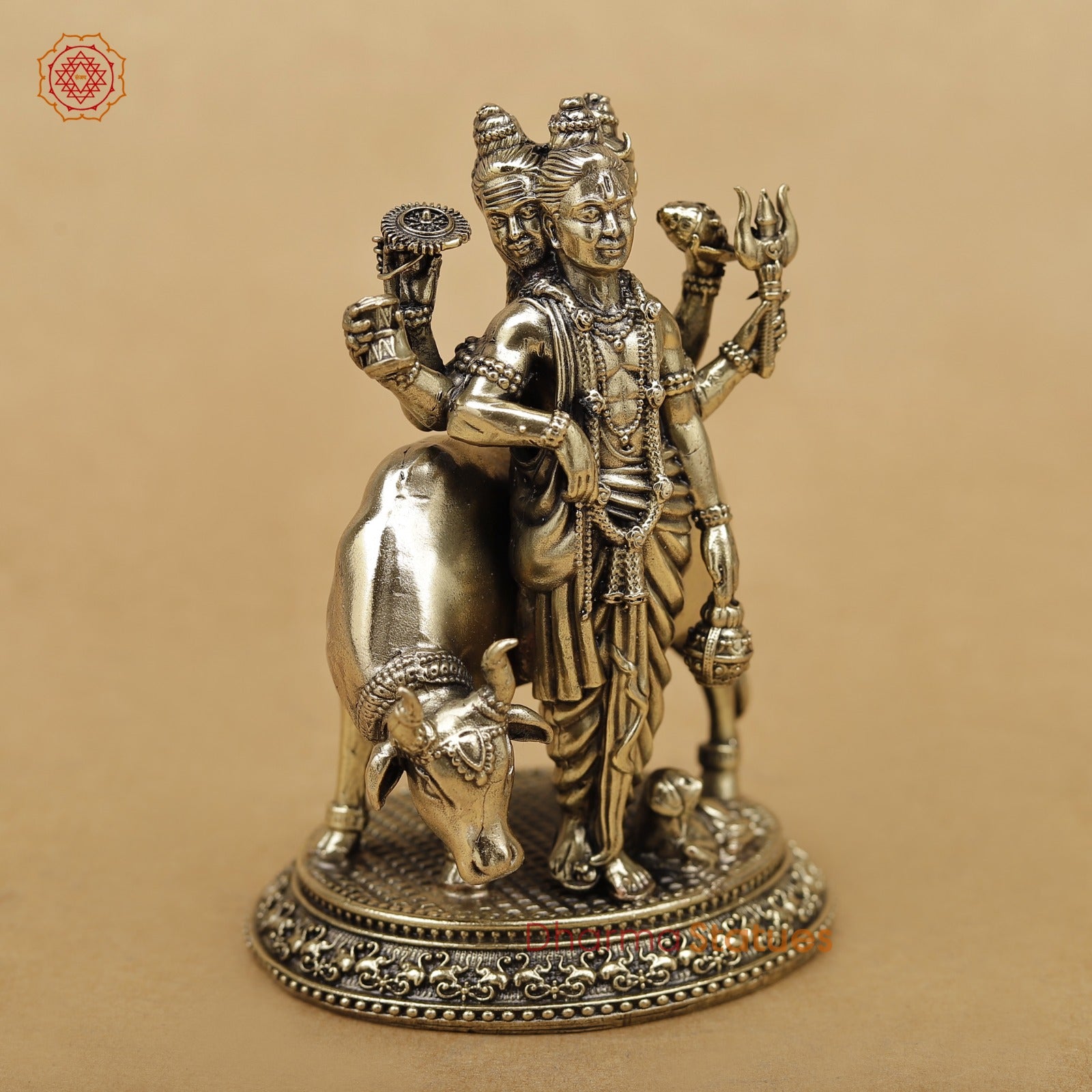 This finely crafted brass statue of Lord Dattatreya represents the divine trinity of Brahma, Vishnu, and Shiva in a single form. Accompanied by the sacred cow and dog, the idol symbolizes harmony, wisdom, and the balance of nature. Ideal for home temples, meditation spaces, or gifting, this statue brings spiritual balance, knowledge, and divine blessings into any environment.
