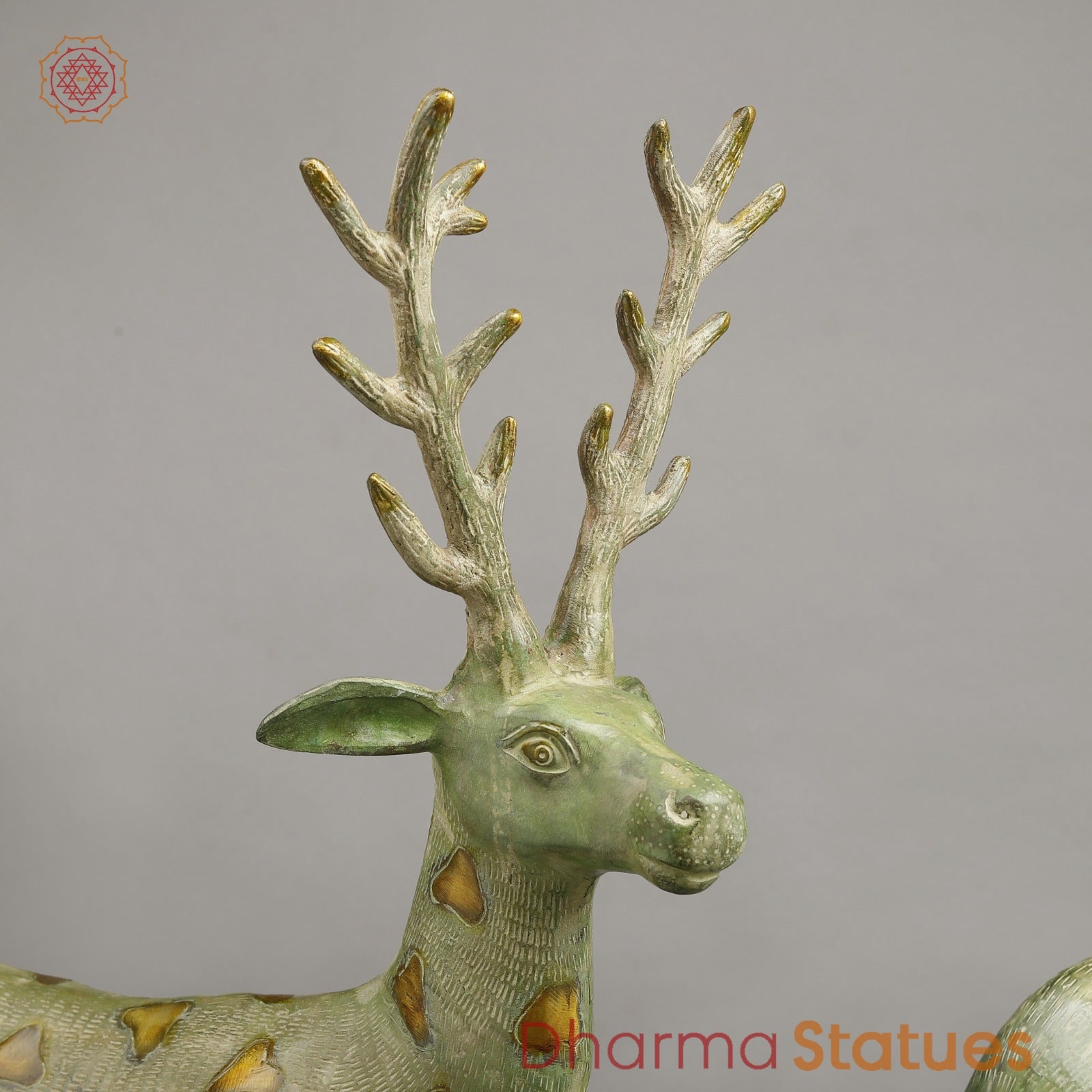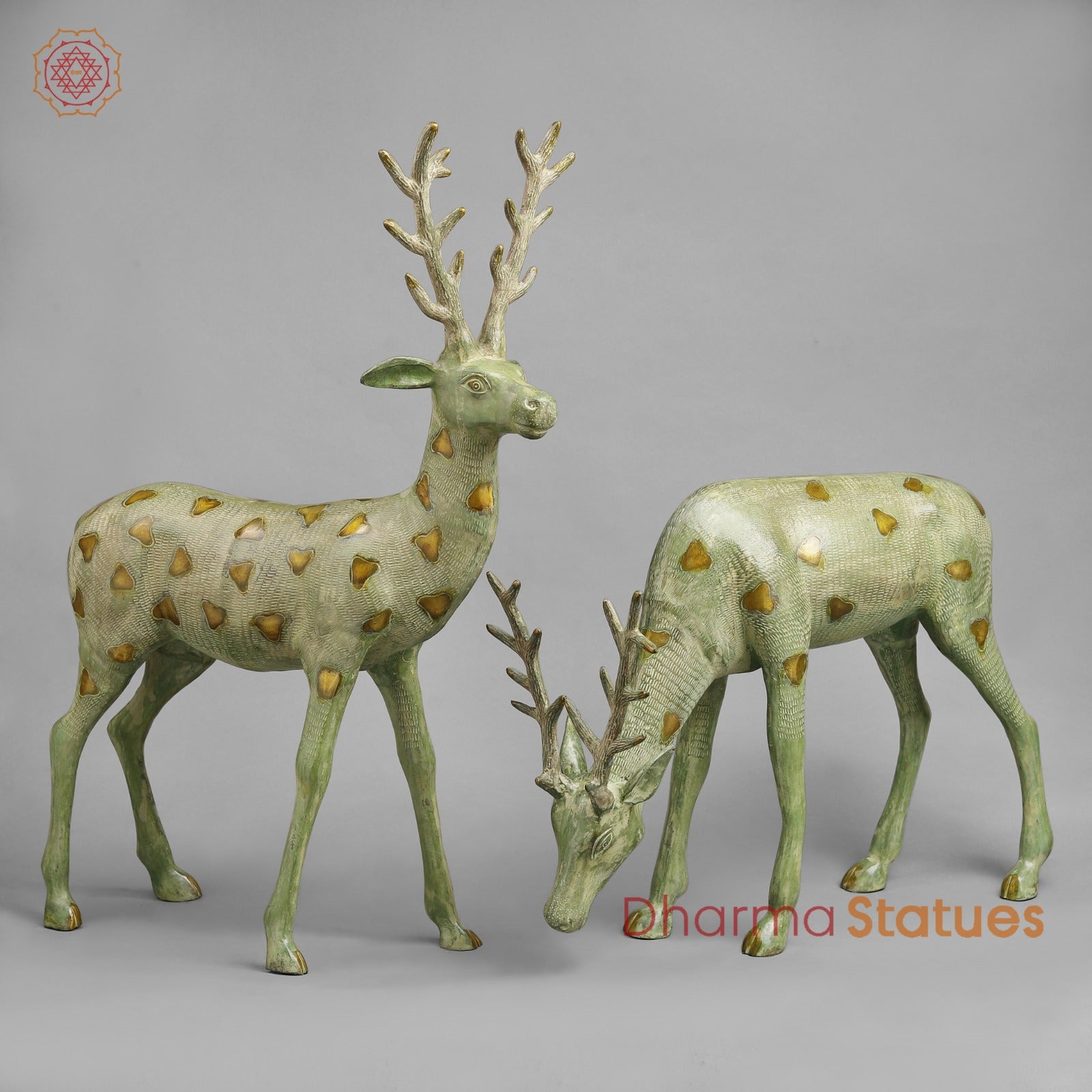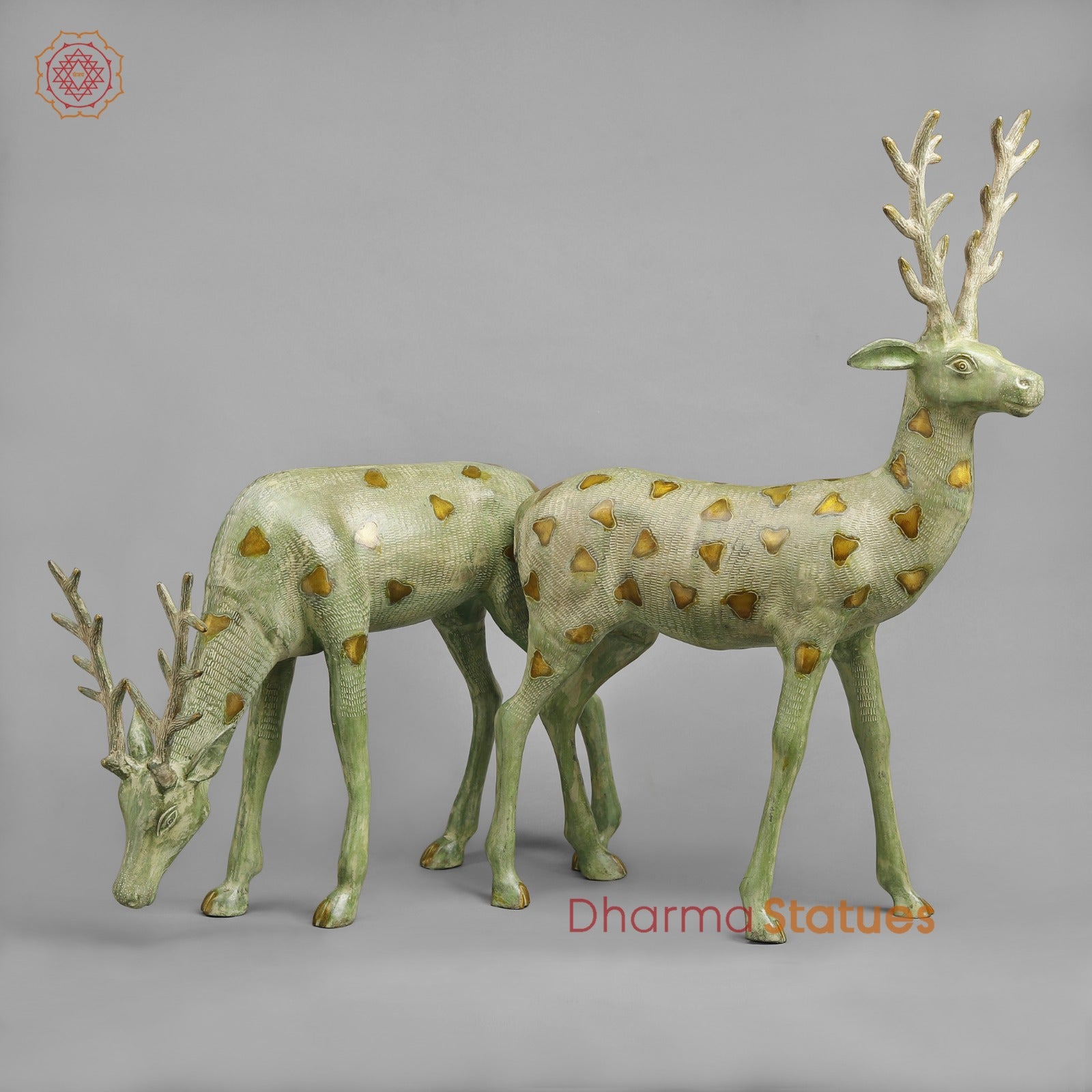 A beautifully handcrafted brass deer sculpture with an elegant leaf green finish and subtle golden accents. Symbolizing grace, peace, and harmony with nature, this tall standing deer makes a striking statement piece for gardens, entrances, or refined interior décor.
