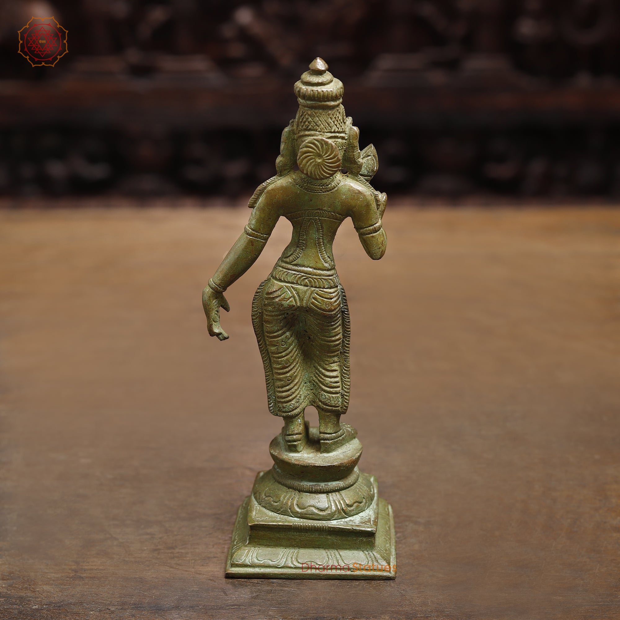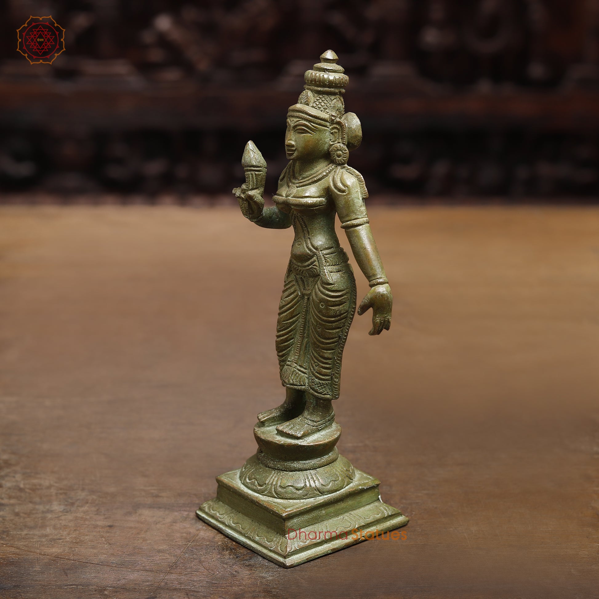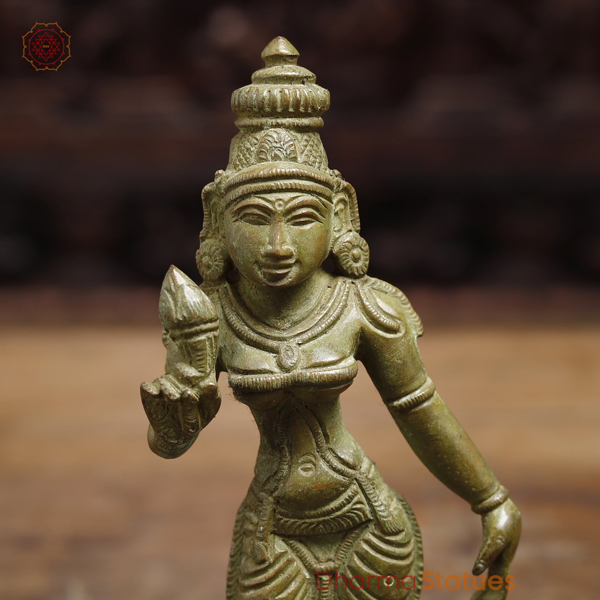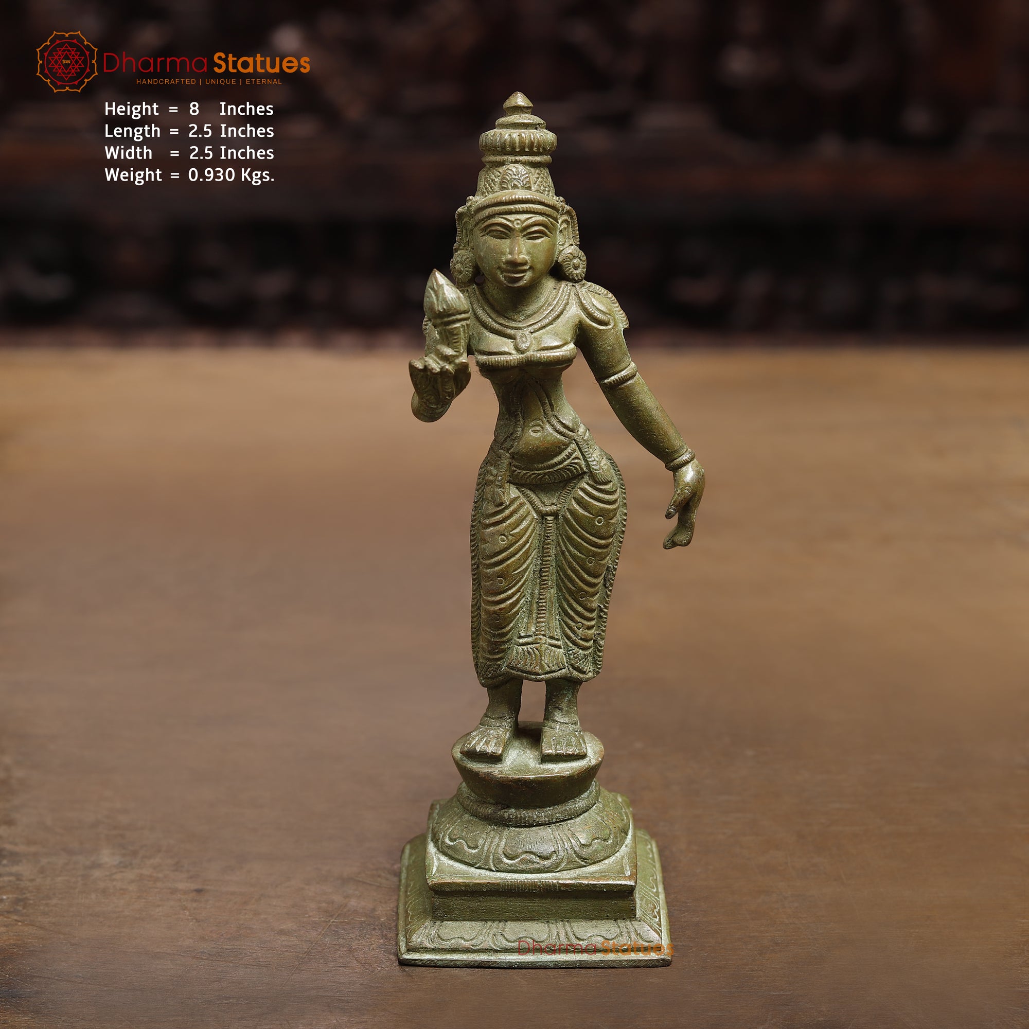 Expertly crafted from brass and finished with a fine green coating, this 8" Devi Meenakshi statue exudes elegance and beauty. Enhance your home decor with its intricate details and bring a sense of divine energy into your space. Perfect for spiritual or decorative purposes.