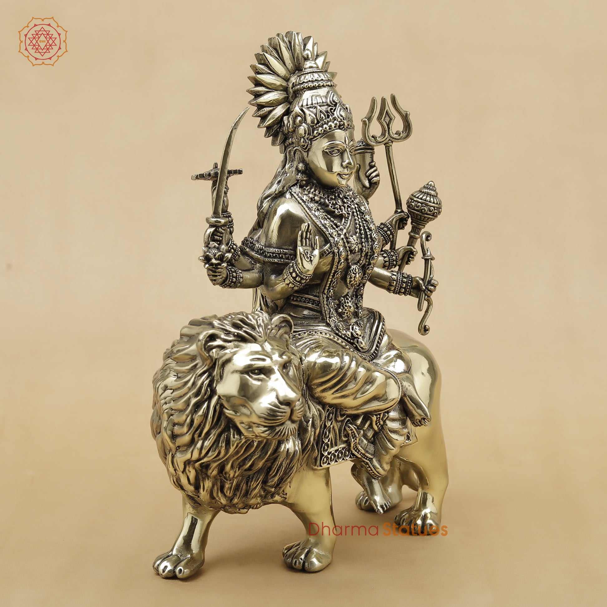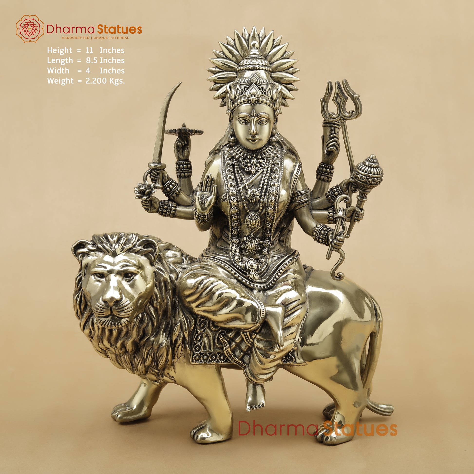 Invoke strength, protection, and divine energy with this magnificent Brass Goddess Durga Statue, exquisitely crafted in a grand 11-inch design. Seated majestically on her lion, Maa Durga is depicted with her iconic weapons—symbolizing the triumph of good over evil. The fine-casted detailing and glossy antique finish make this idol a stunning centerpiece for home temples, living spaces, and spiritual décor.