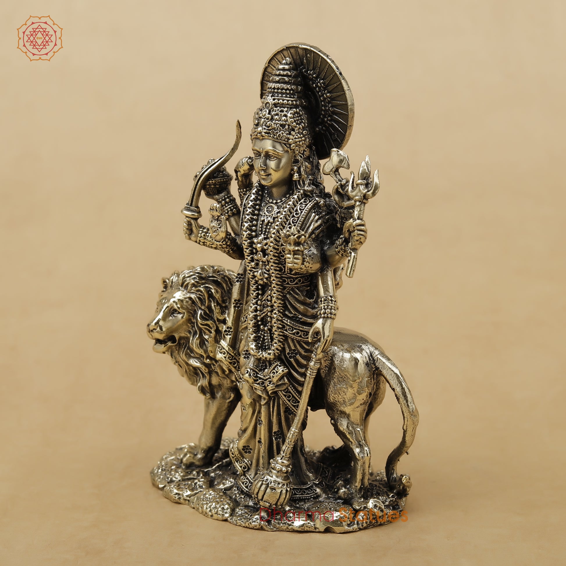 This beautifully crafted brass Durga Maa idol features the Goddess standing in divine grace with her lion beside her. Detailed with intricate ornaments and an antique finish, it symbolizes strength, protection, and victory over negativity. A perfect piece for home décor, spiritual spaces, and meaningful gifting.