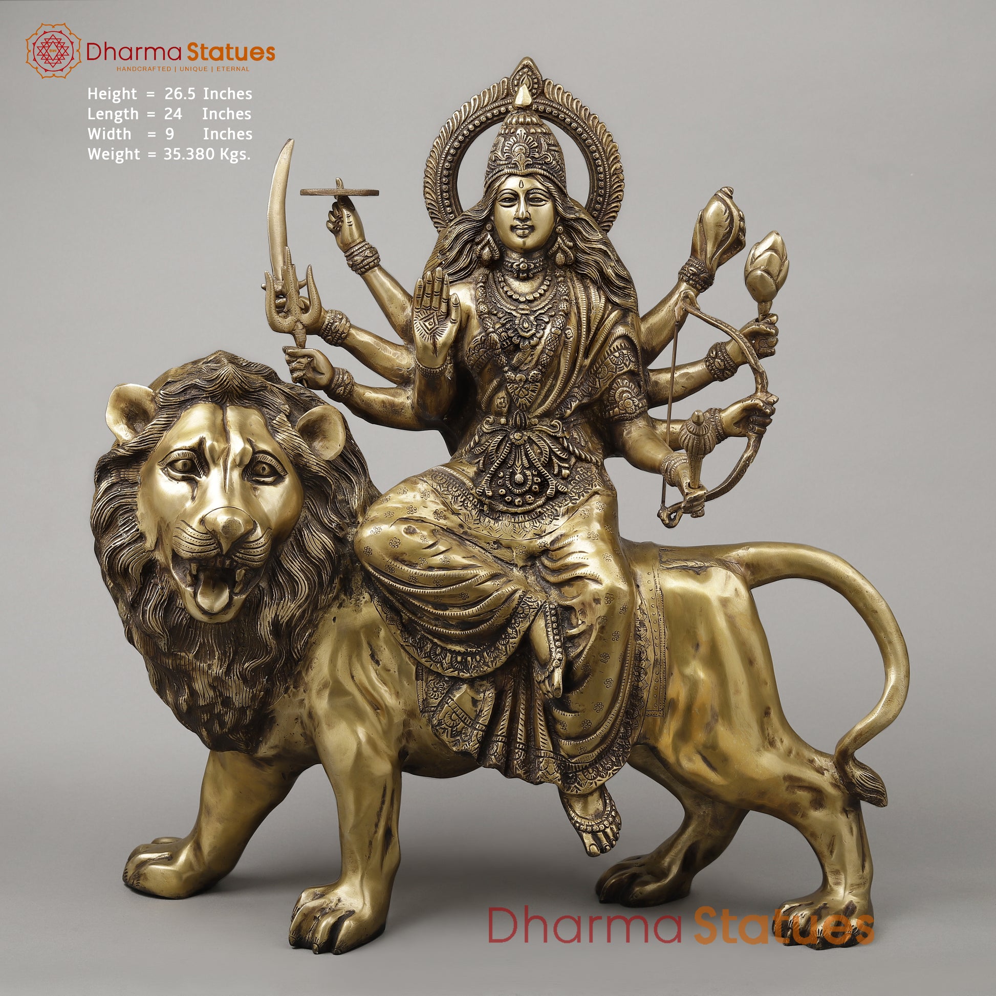 Honor strength and courage with this majestic Brass Durga statue. Measuring 26.5 inches, it portrays Goddess Durga with 8 arms, seated gracefully on a lion, symbolizing power and protection. The golden finish enhances its intricate detailing, making it a captivating addition to your décor or a meaningful gift.