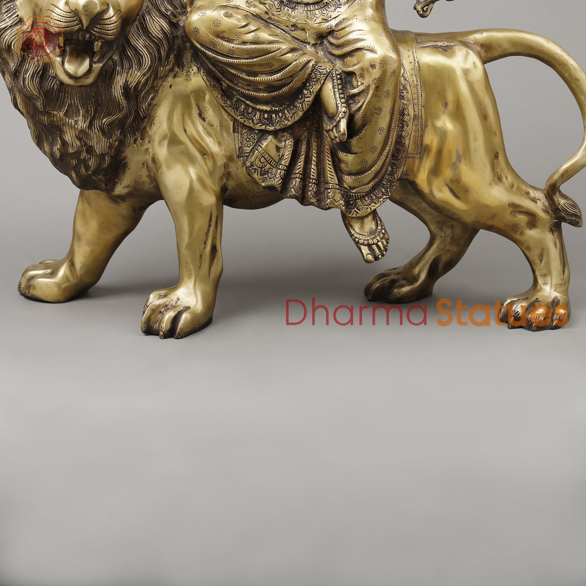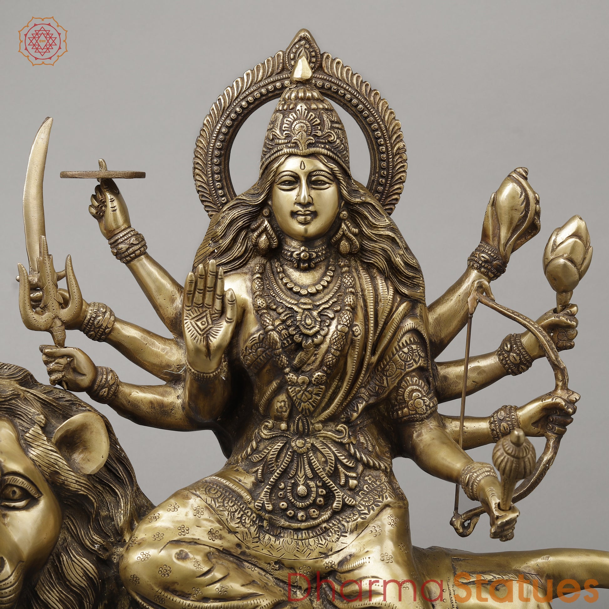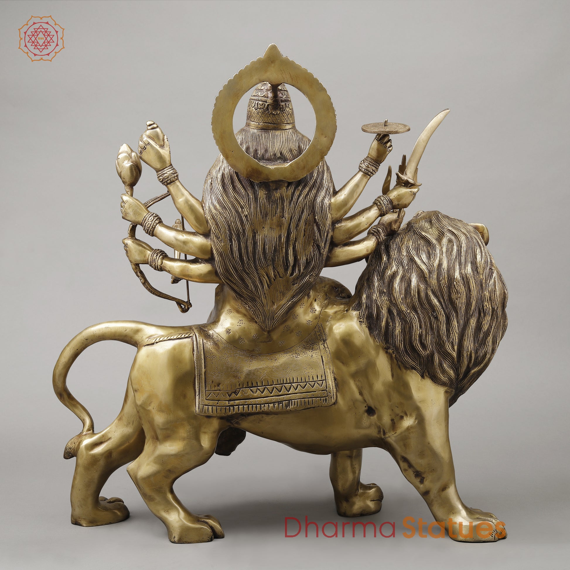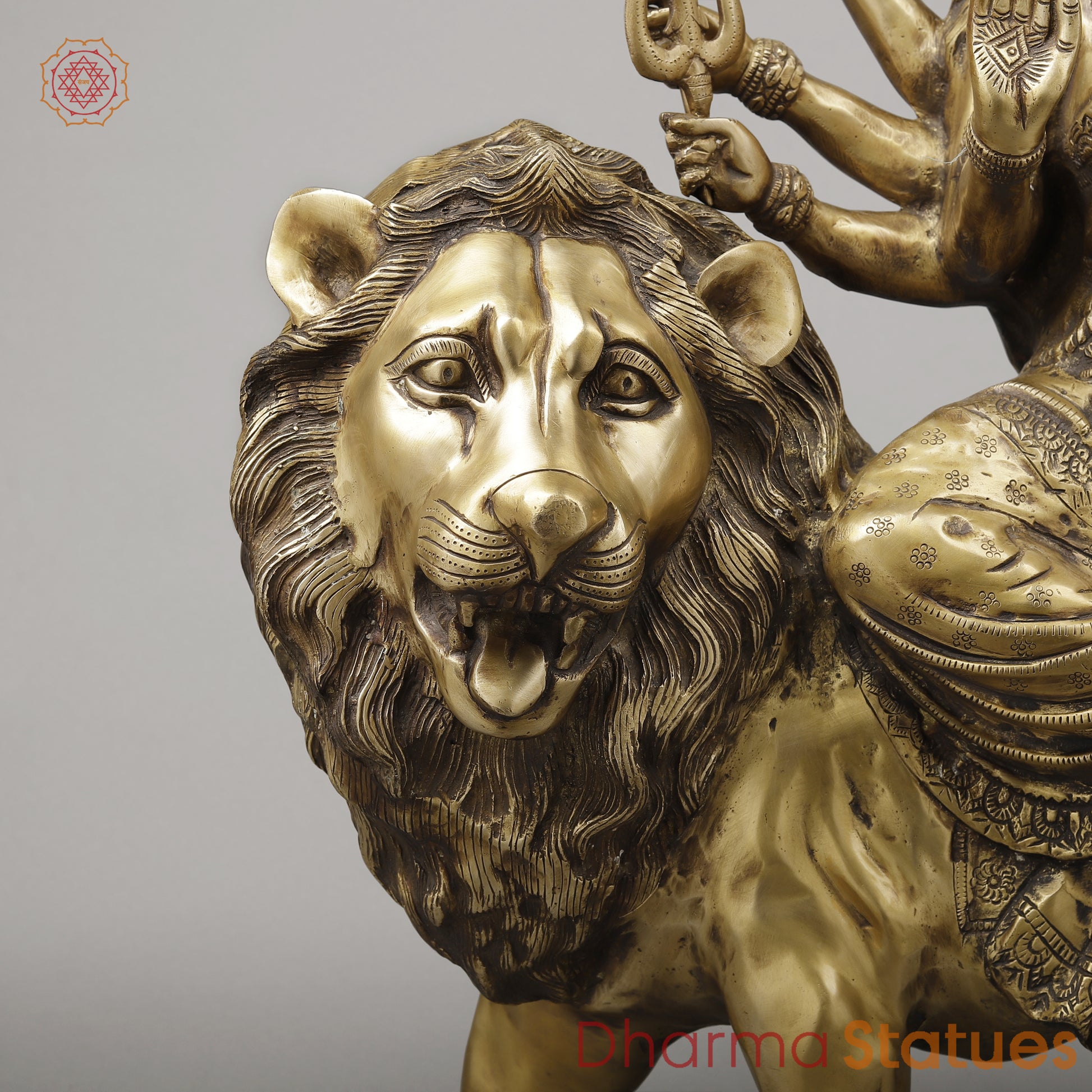 Brass Durga with 8 Arms Seated on Lion, Dark Golden Finish, 26.5"