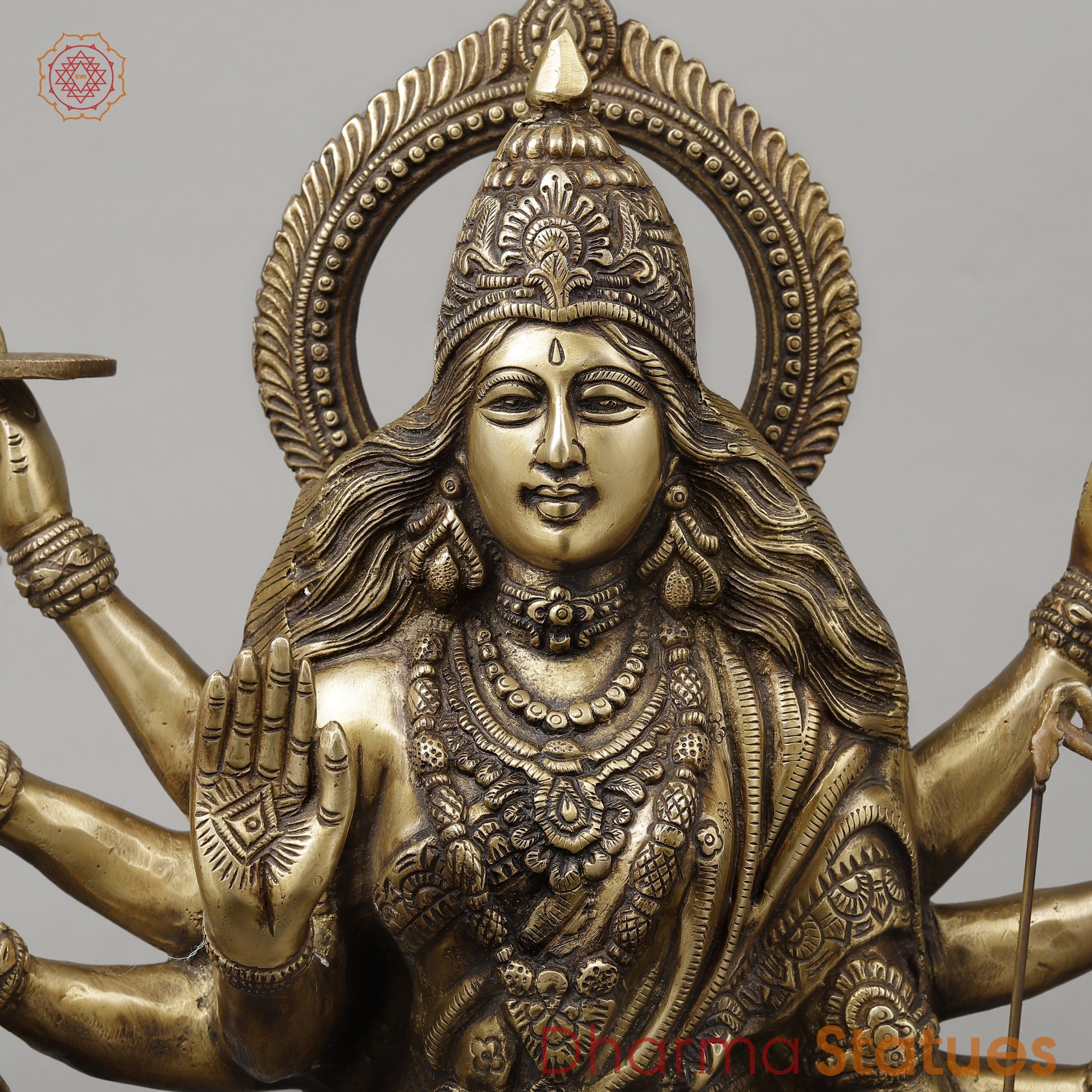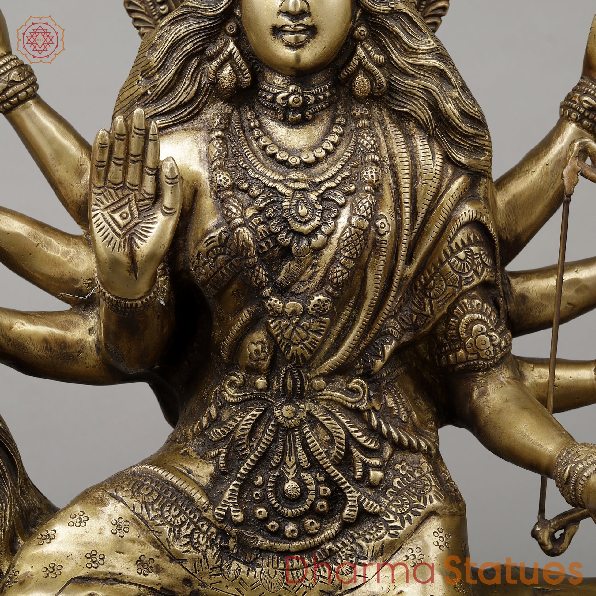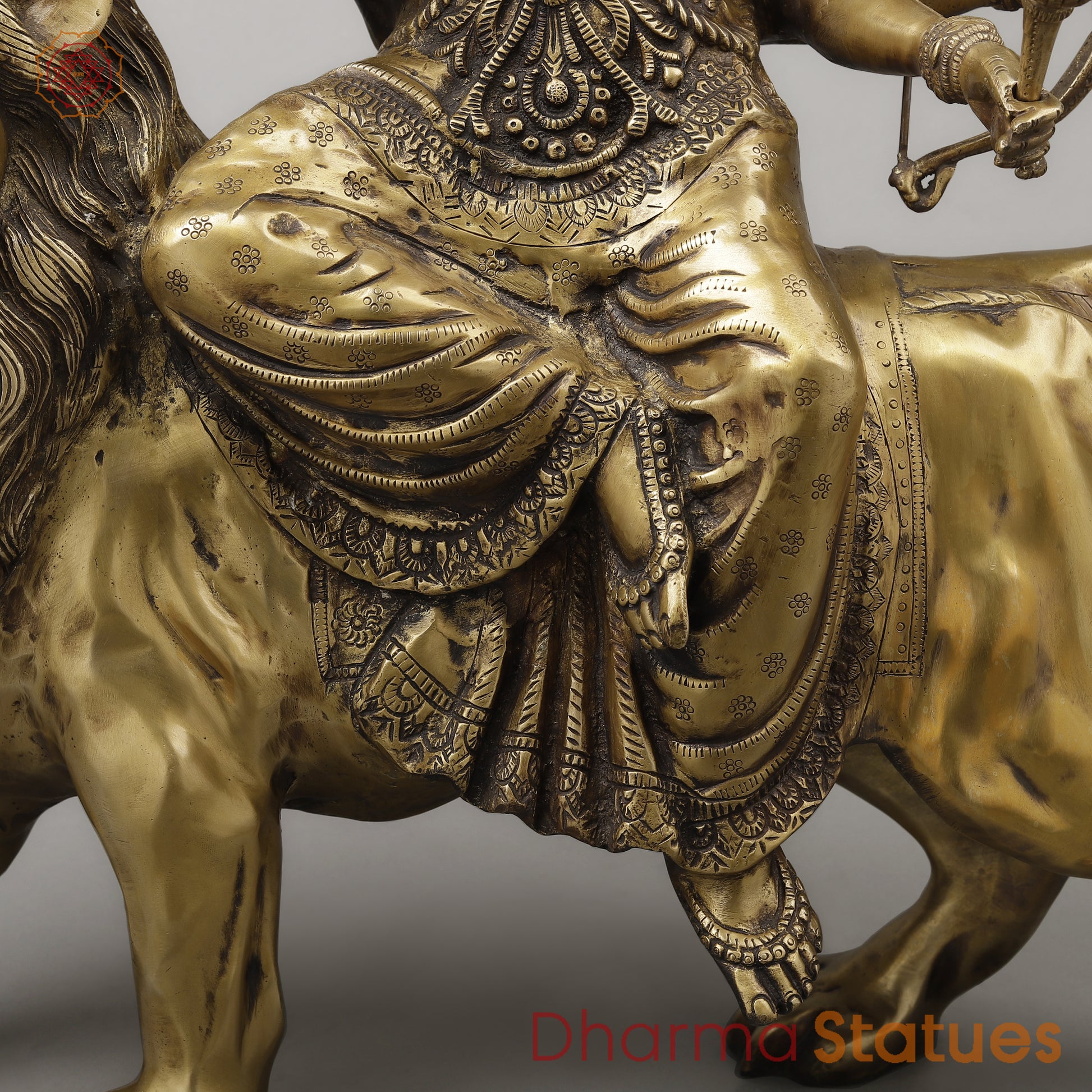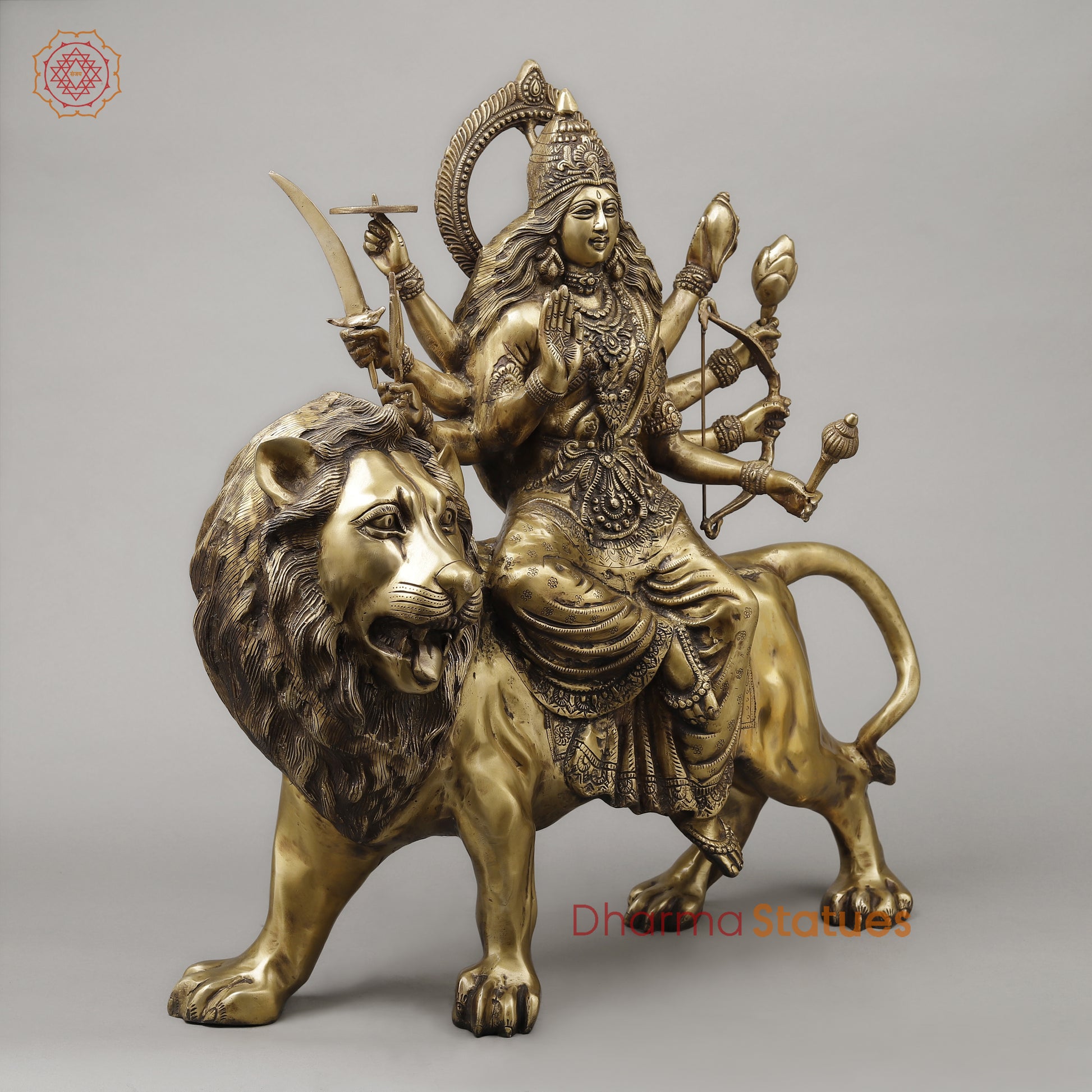 Brass Durga with 8 Arms Seated on Lion, Dark Golden Finish, 26.5"