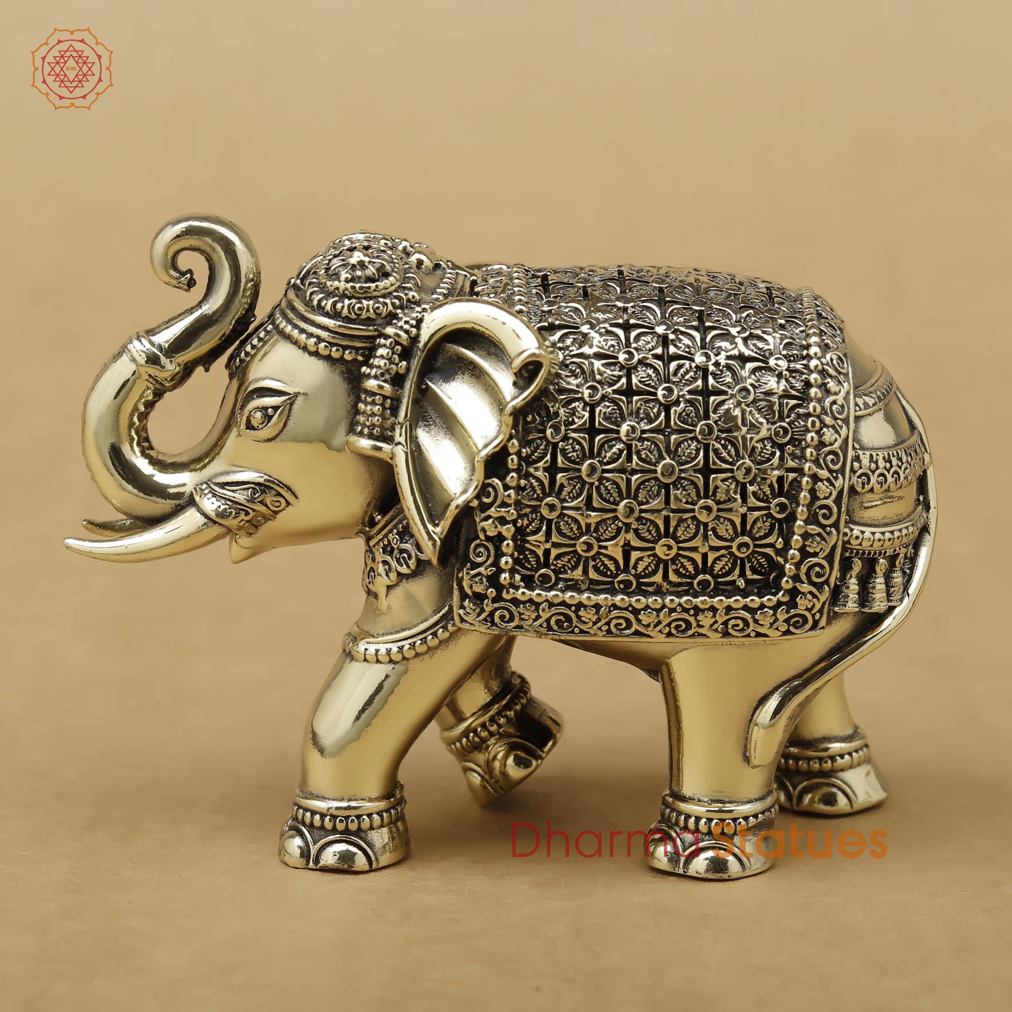 Celebrate timeless craftsmanship with this exquisite brass elephant statue from Dharma Statues. Every curve, carving, and motif is lovingly hand-crafted, reflecting the artistry of traditional metalwork. The elephant, adorned in ornate ceremonial attire, stands as a symbol of wisdom, prosperity, and protection. Compact yet captivating, it adds richness and cultural depth to any living space or office. Featuring intricate detailing and an elegant antique finish, it’s a perfect décor accent for desks, shelves, and gift-giving.