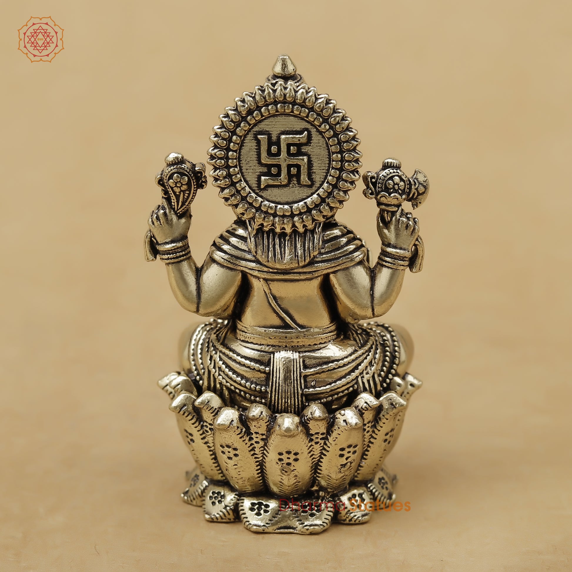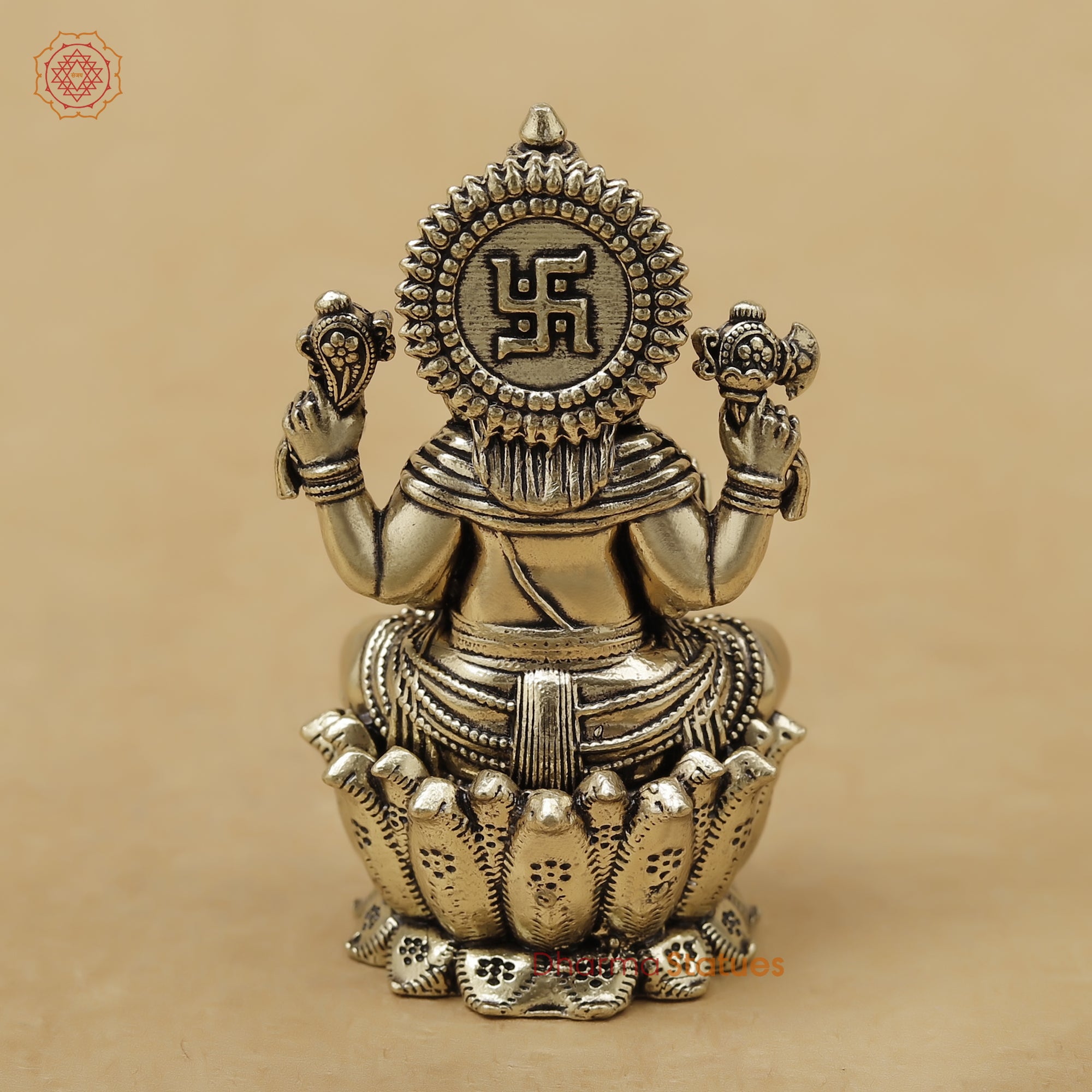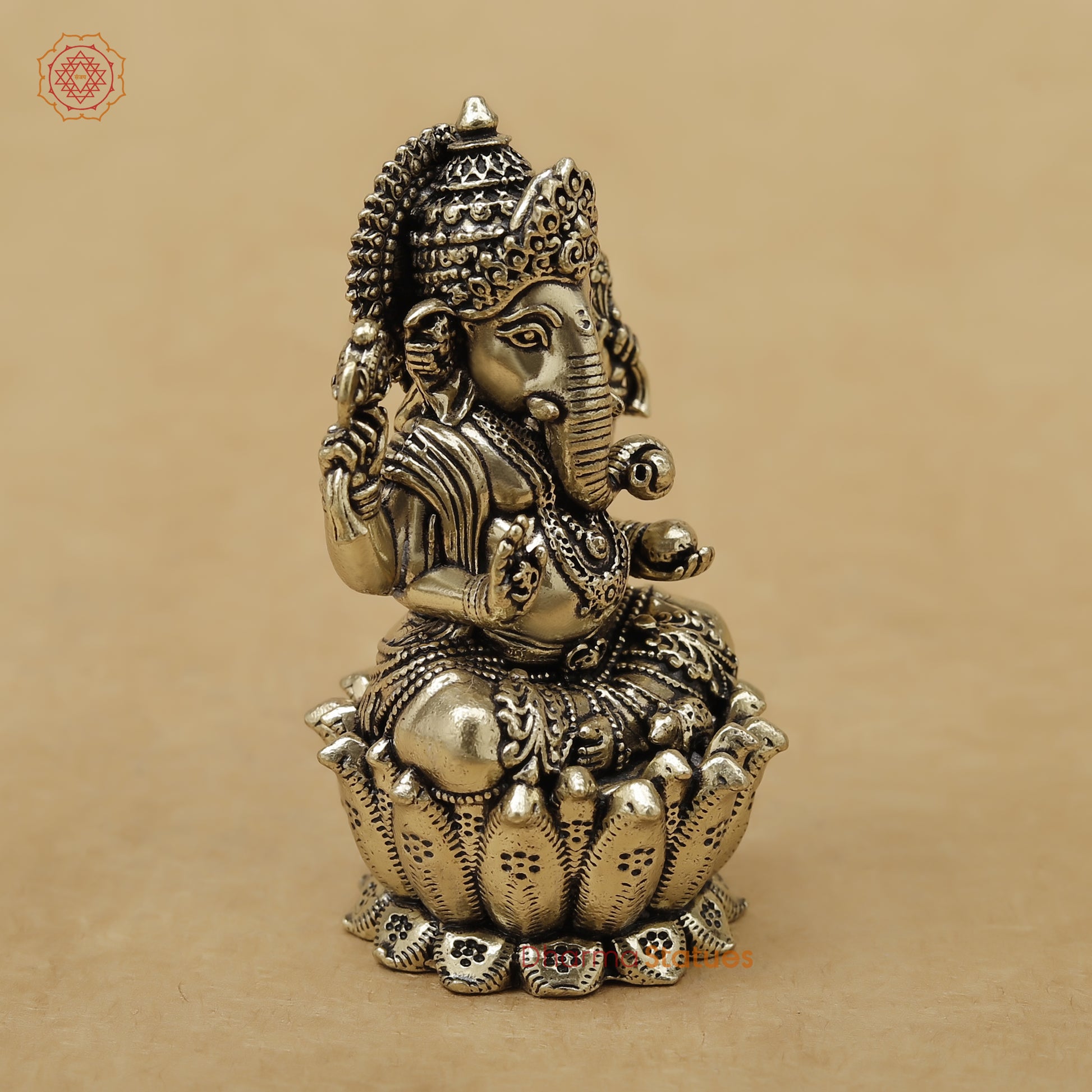 A finely crafted brass Ganesha idol seated on a lotus, radiating divine grace and auspicious energy. Its detailed carvings and antique finish enhance any pooja room or décor space. Ideal for daily worship, festive rituals, or gifting blessings of prosperity and protection.