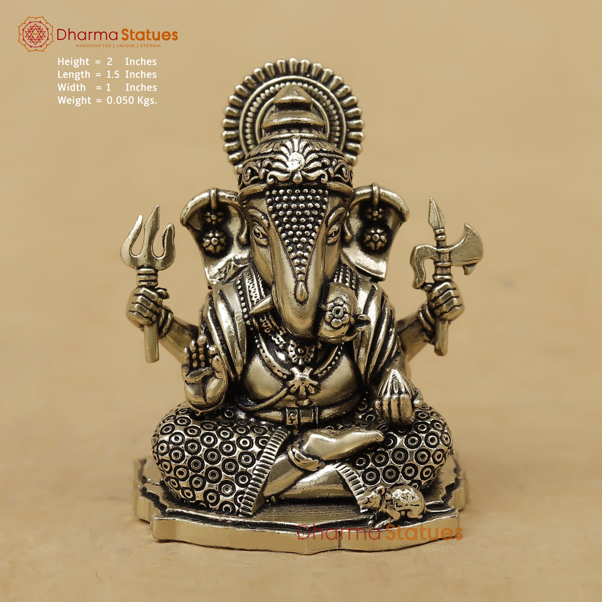 This finely crafted 2-inch brass Ganesha idol shows the idol seated in blessing pose, holding a trishul, axe, modak, and blessing hand. Compact yet detailed, it symbolizes wisdom, protection, and prosperity—perfect for car dashboards, desks, pooja spaces, and thoughtful gifting.