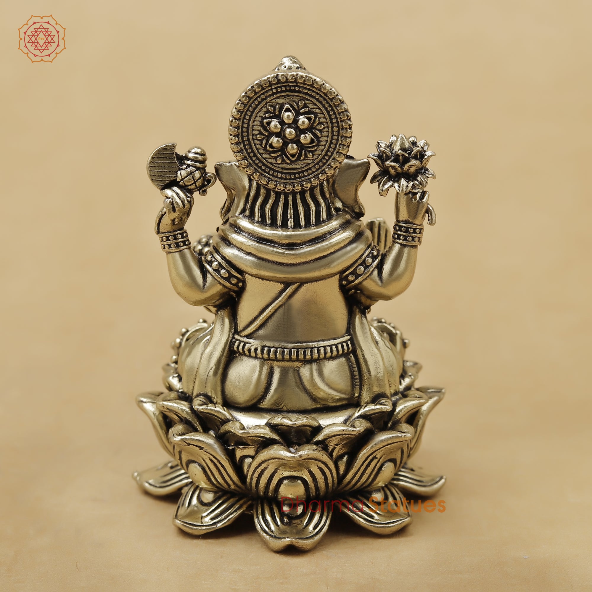 This 3-inch brass Ganesha idol sits gracefully on a blooming lotus, symbolizing purity and prosperity. Featuring intricate detailing, with modaks, lotus, and blessing hand, it radiates divine positivity. Perfect for home temples, office desks, car dashboards, and gifting on festive occasions.