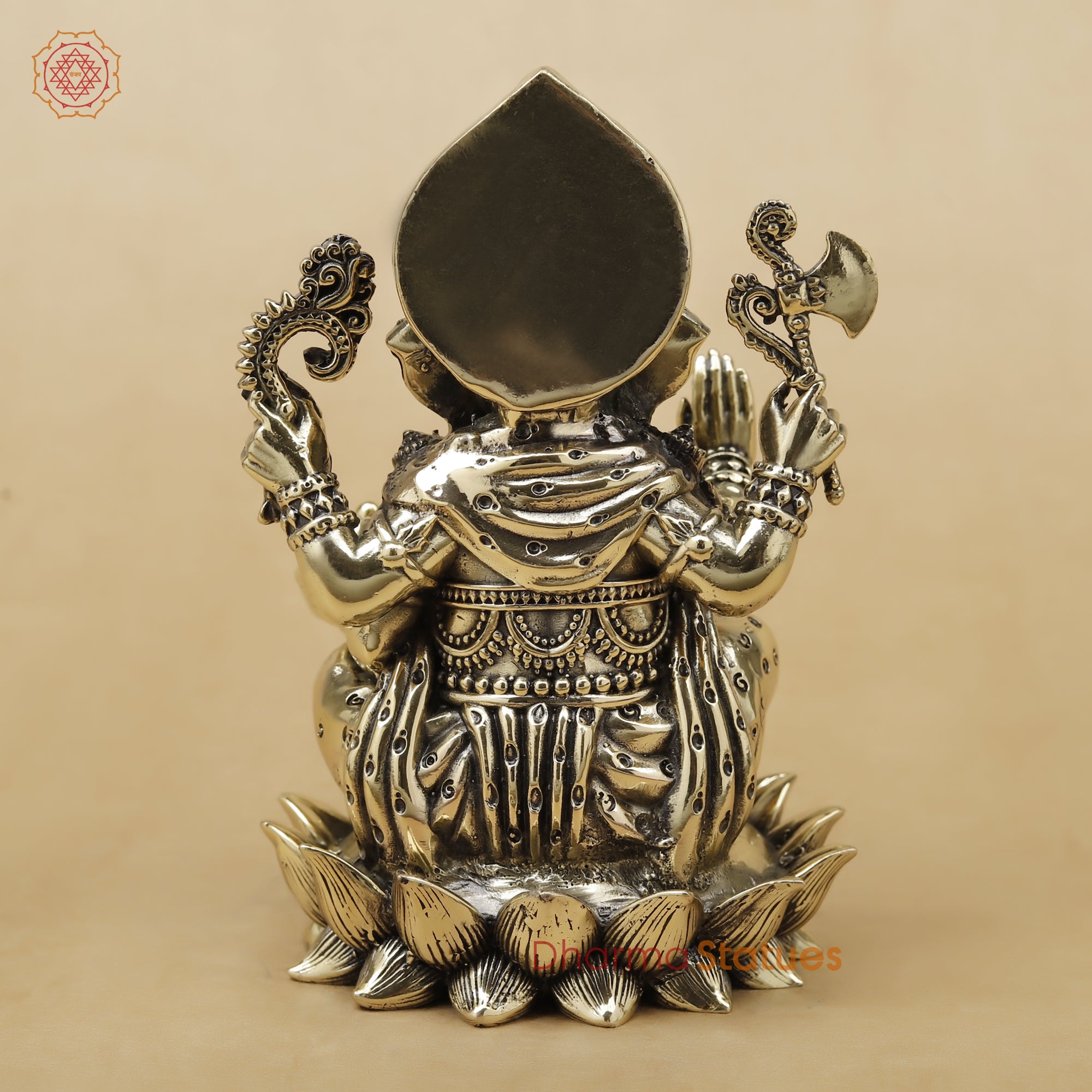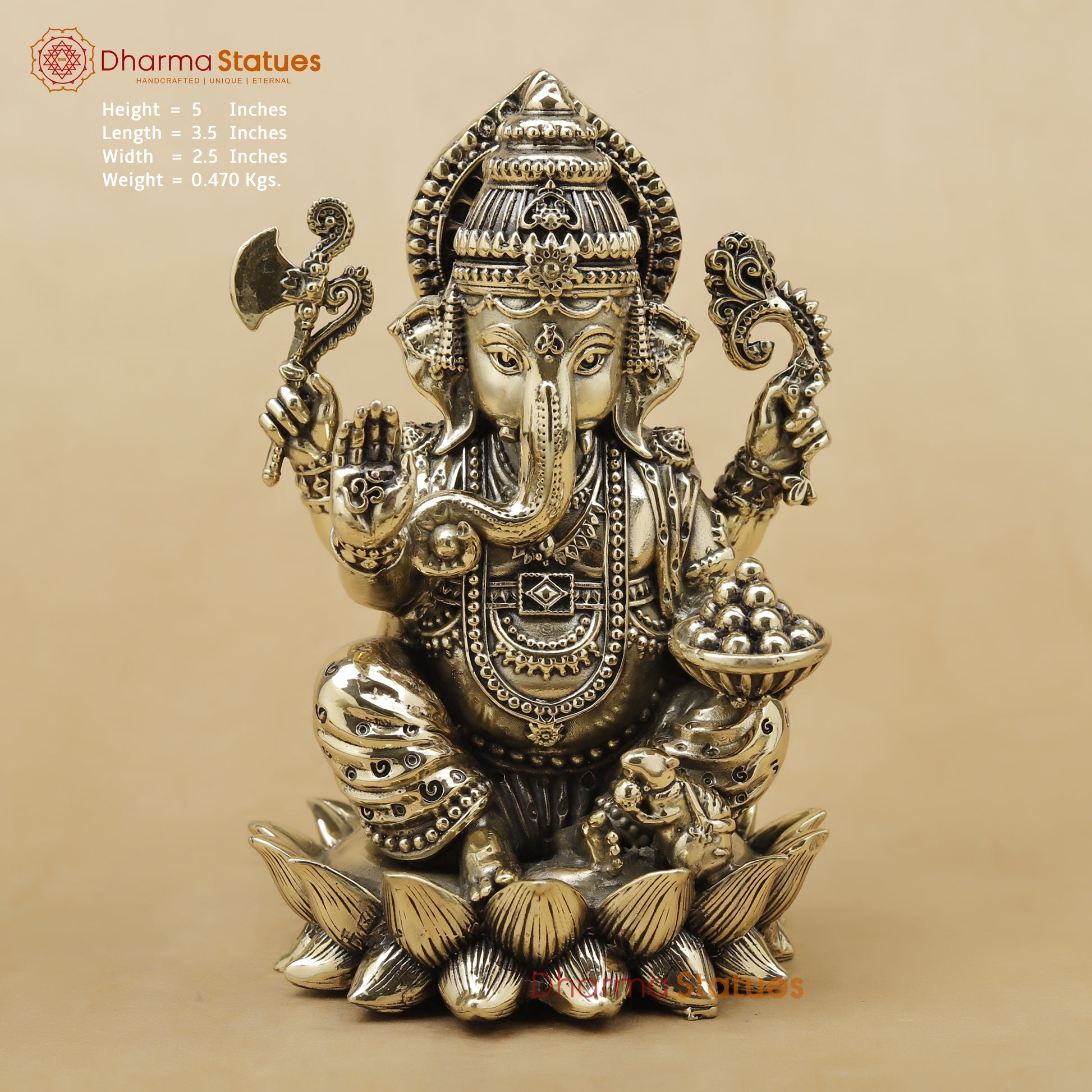 This 5-inch brass Ganesha idol exudes divine elegance, seated gracefully on a detailed lotus base. Crafted with fine traditional carvings, it features symbolic attributes like the axe, modak bowl, and blessing hand. A perfect piece for pooja rooms, desks, and gifting, it brings wisdom, prosperity, and spiritual positivity to any space.