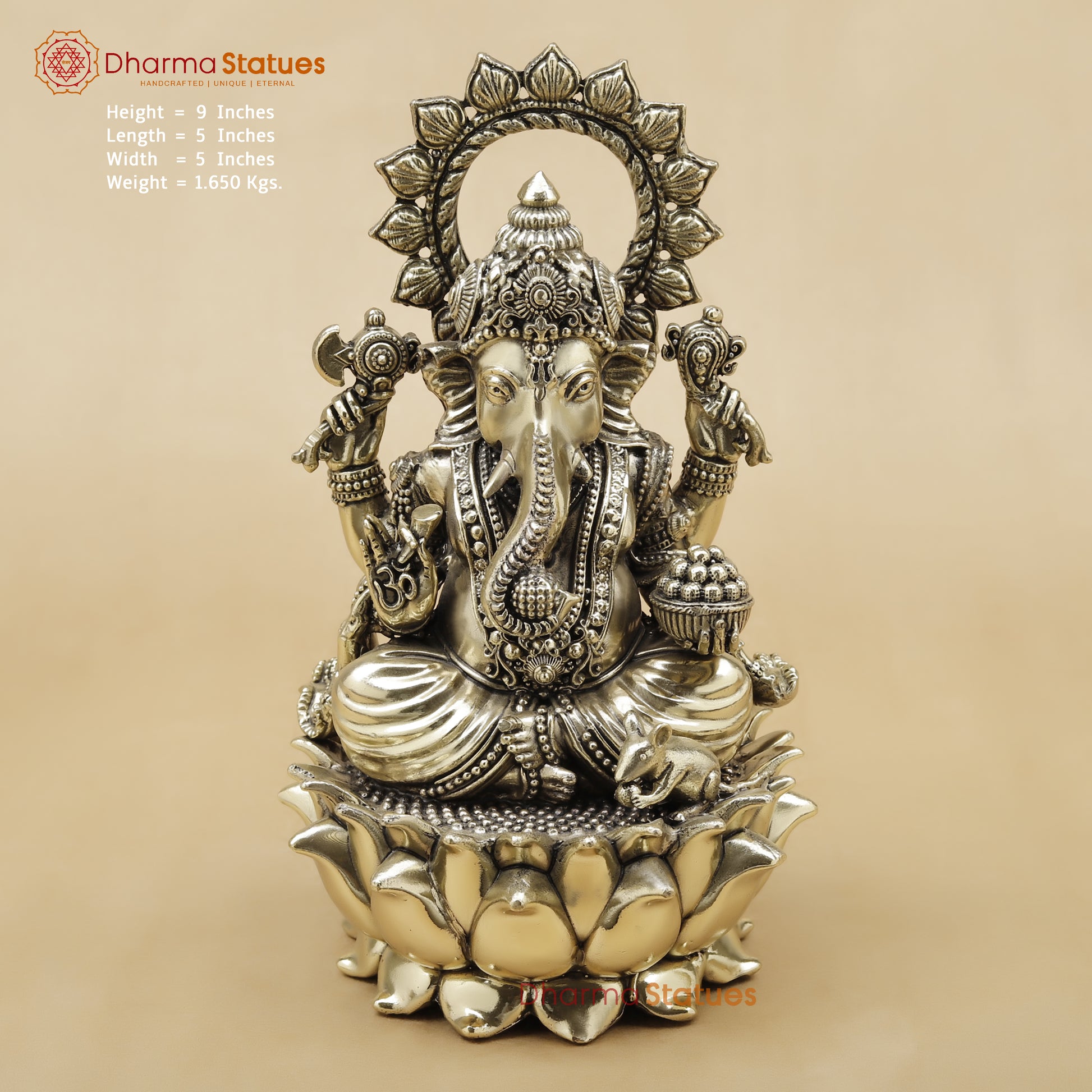 Invite prosperity, wisdom, and divine blessings into your home with this exquisitely crafted Brass Lord Ganesha Statue. Seated beautifully on an ornate lotus pedestal, Ganesha is depicted with intricate fine-casted detailing, holding symbolic items that represent protection, success, and abundance. The antique brass finish adds a regal charm, making it a perfect centerpiece for your home temple or living space.