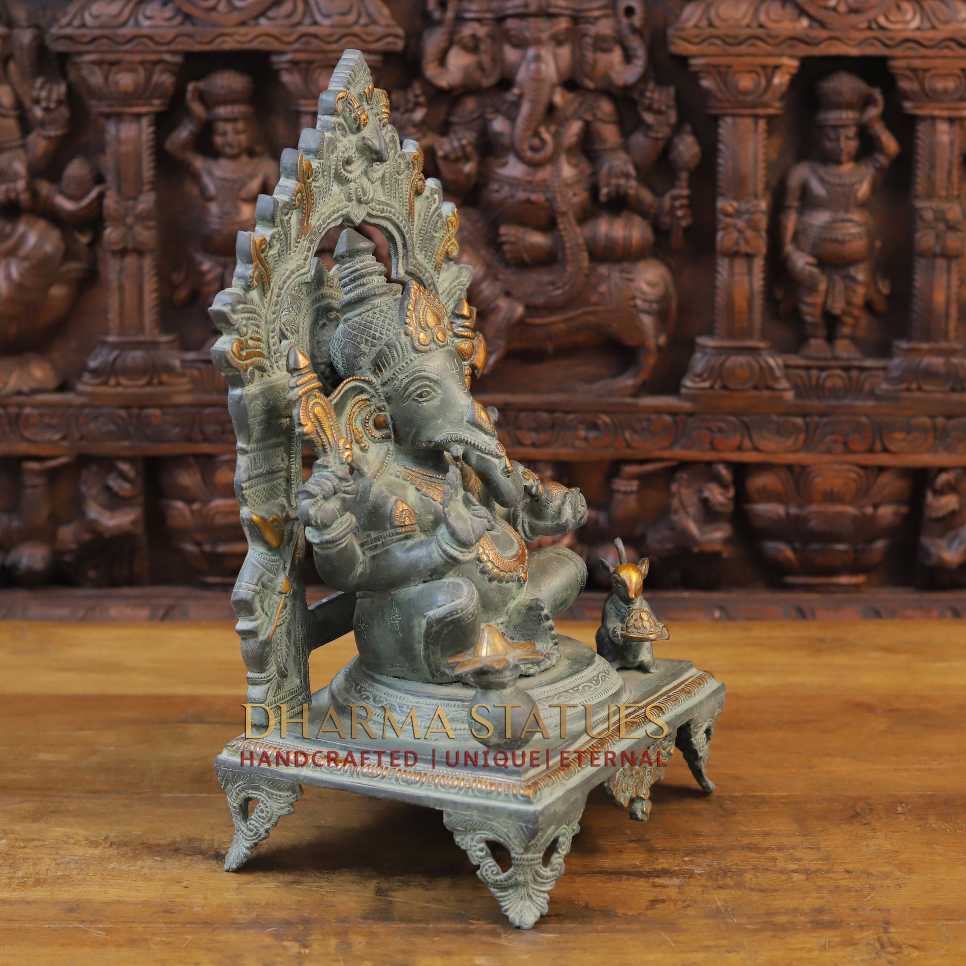 Brass Ganesh Idol, Seated on a Chowki, Green Patina Finish 17.5"