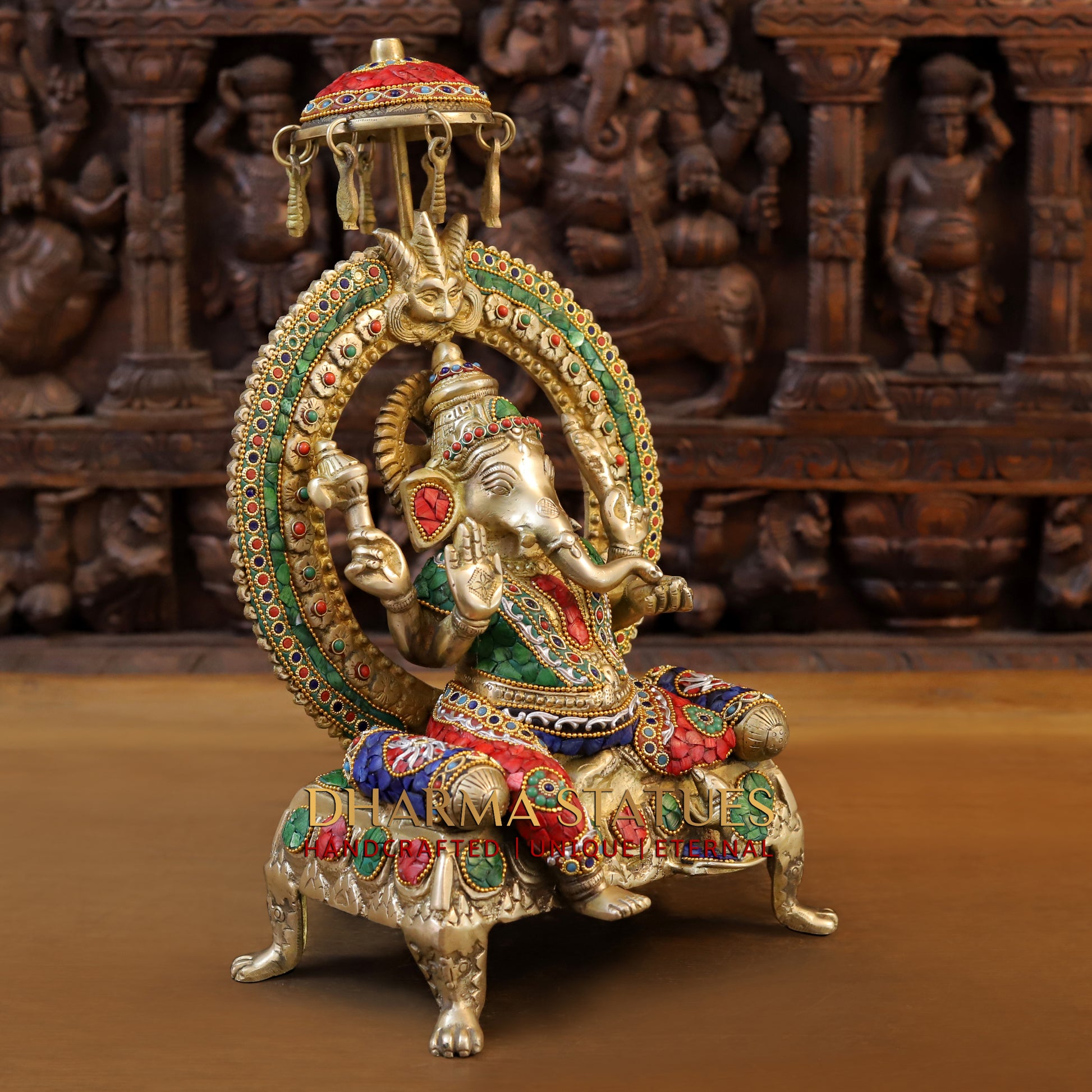 Brass Ganesh & Lakshmi seated on Throne, Stonework & Golden Finish, 18"