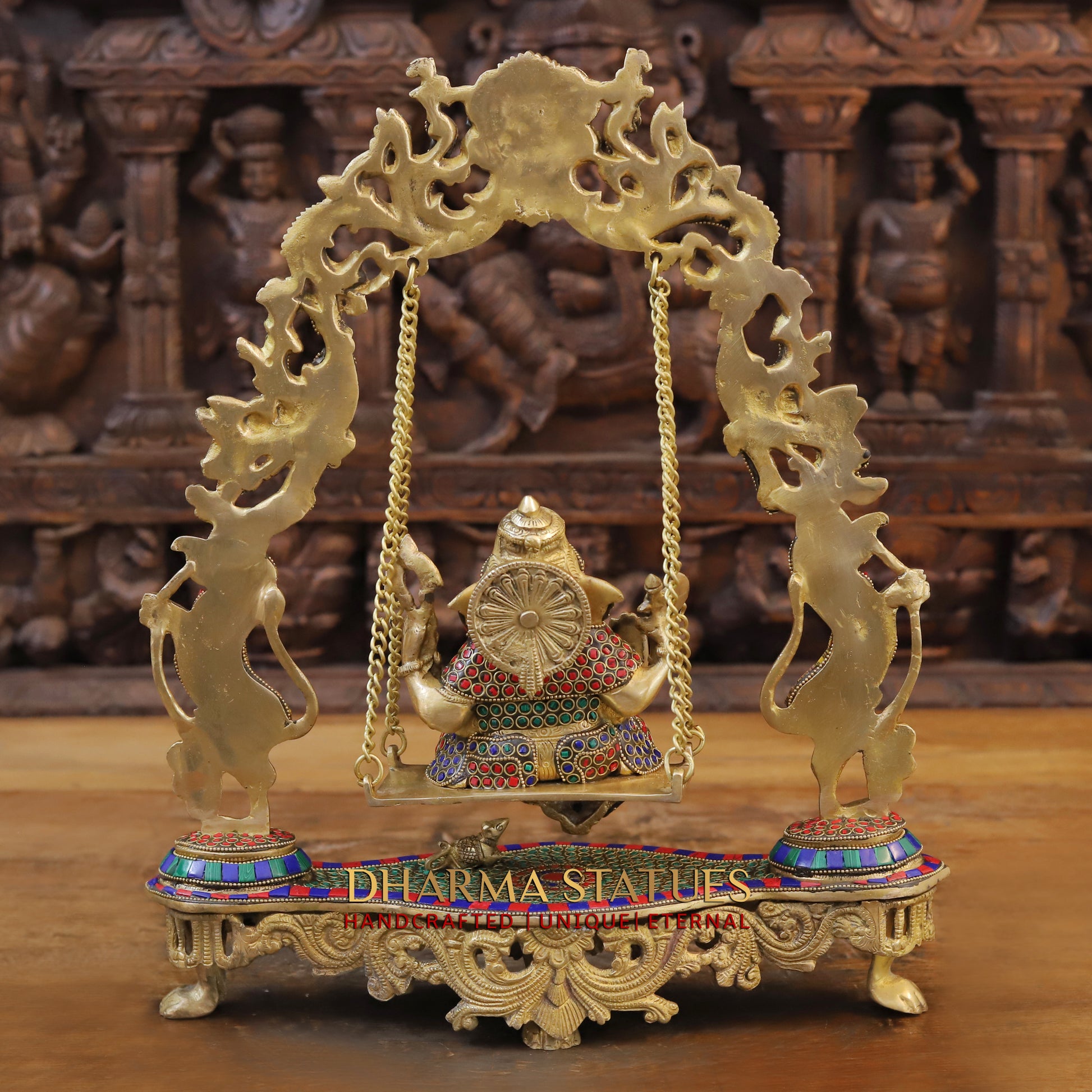 Brass Ganesh on Swing, Blessing Posture, Golden & Stonework, 18"