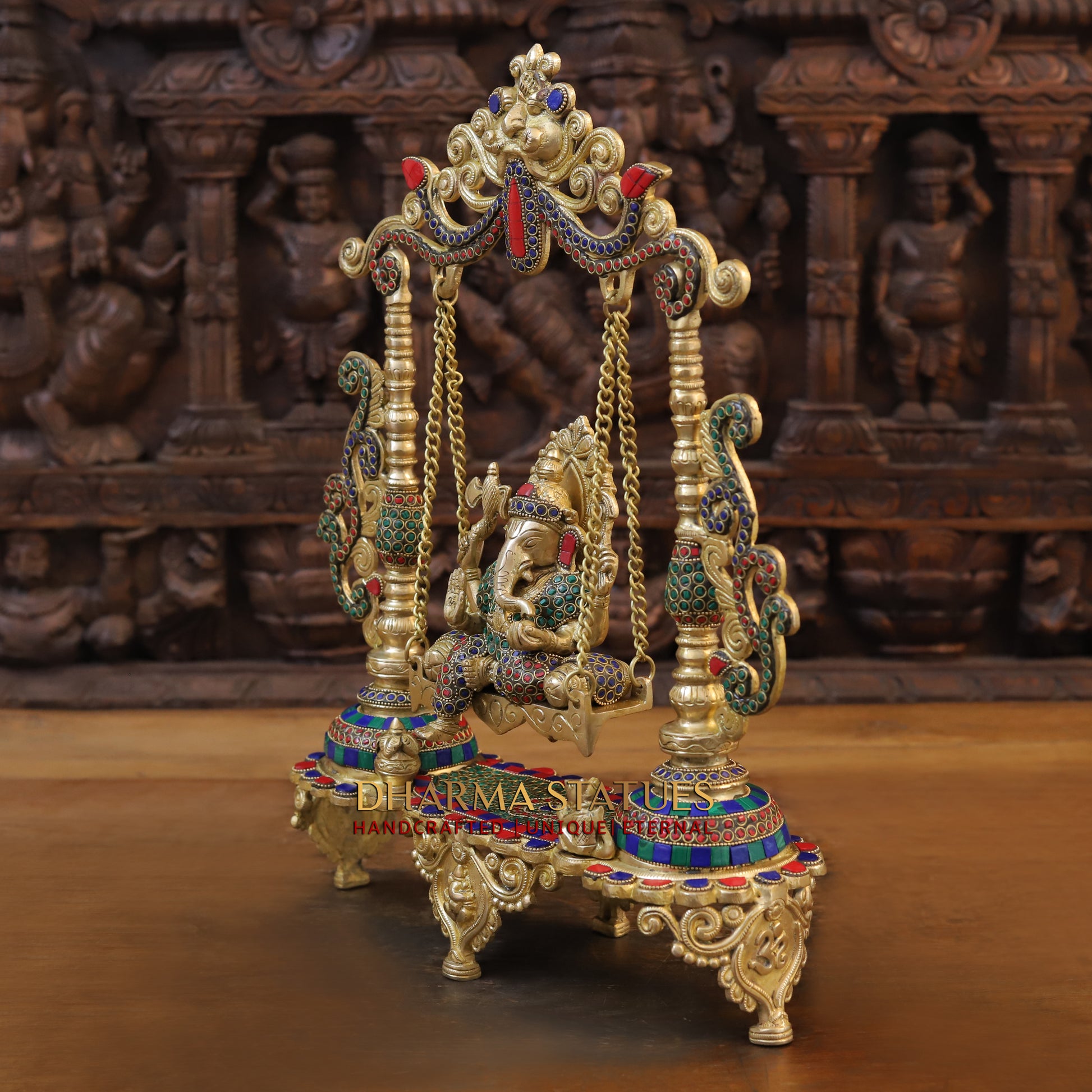 Brass Ganesh on Swing, Blessing Posture, Golden & Stonework, 19"