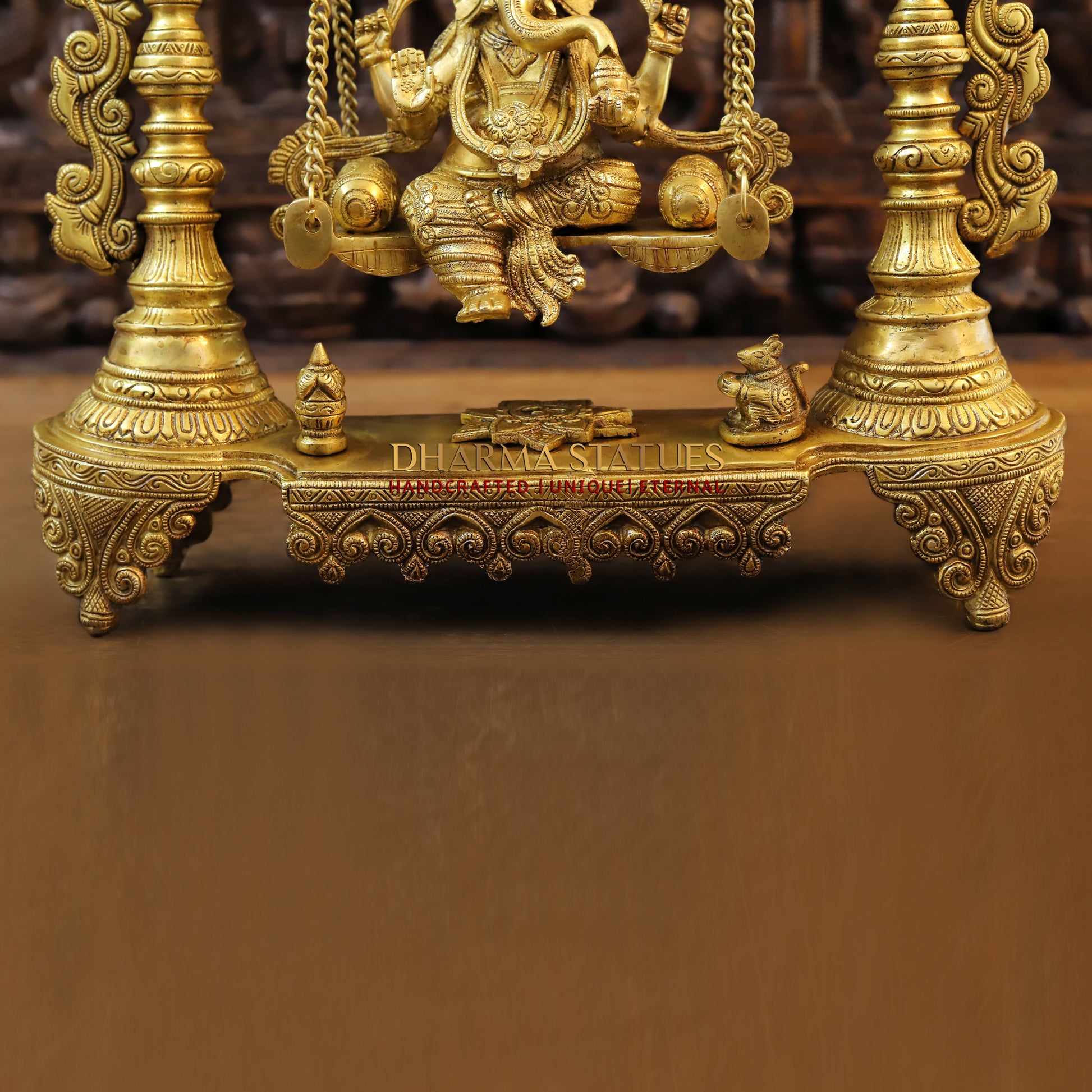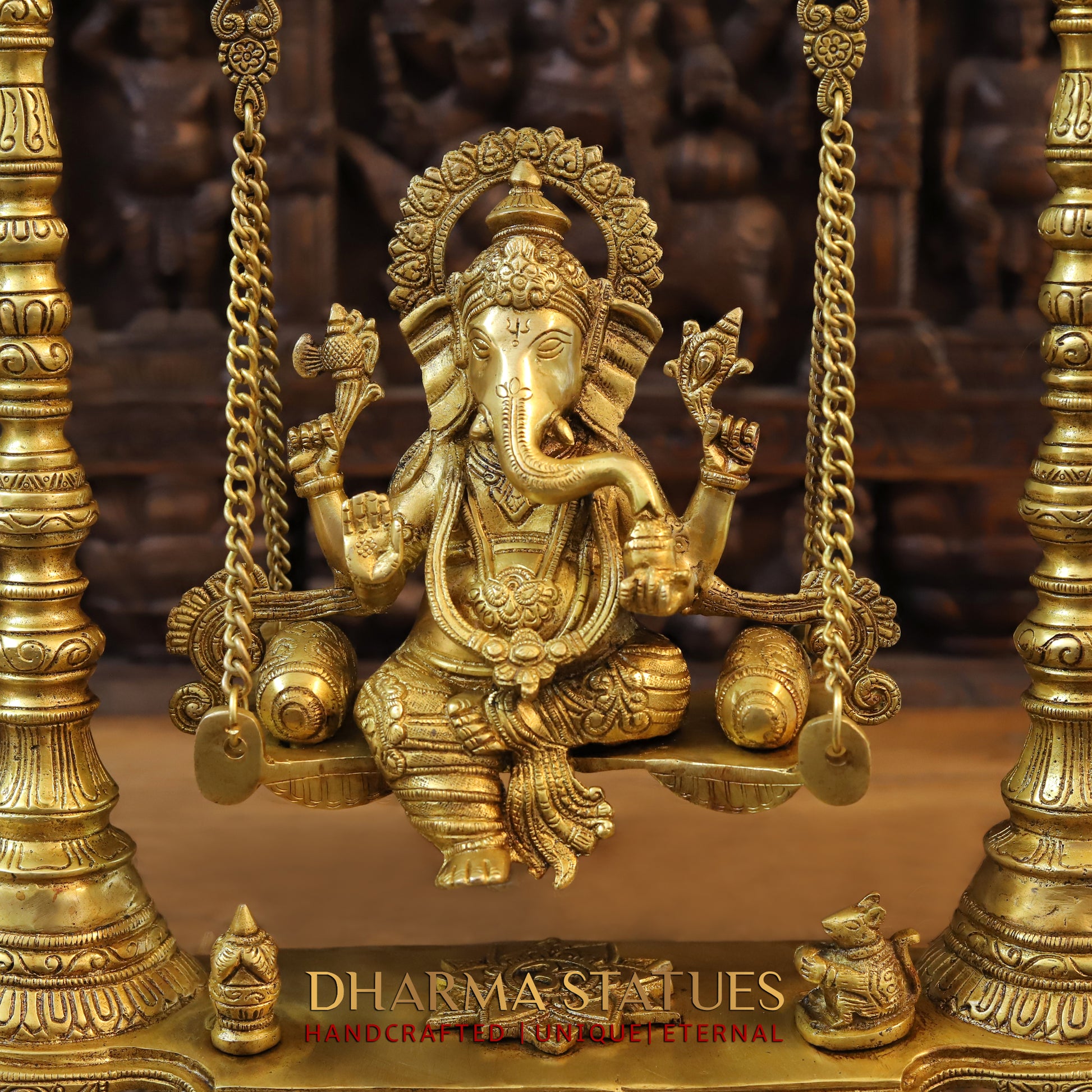 Expertly crafted from brass, this stunning 26" Ganesh figurine sits atop a golden swing in a blessing posture. Meticulous stonework adds a touch of elegance and charm. Perfect for bringing good fortune and prosperity into any space.