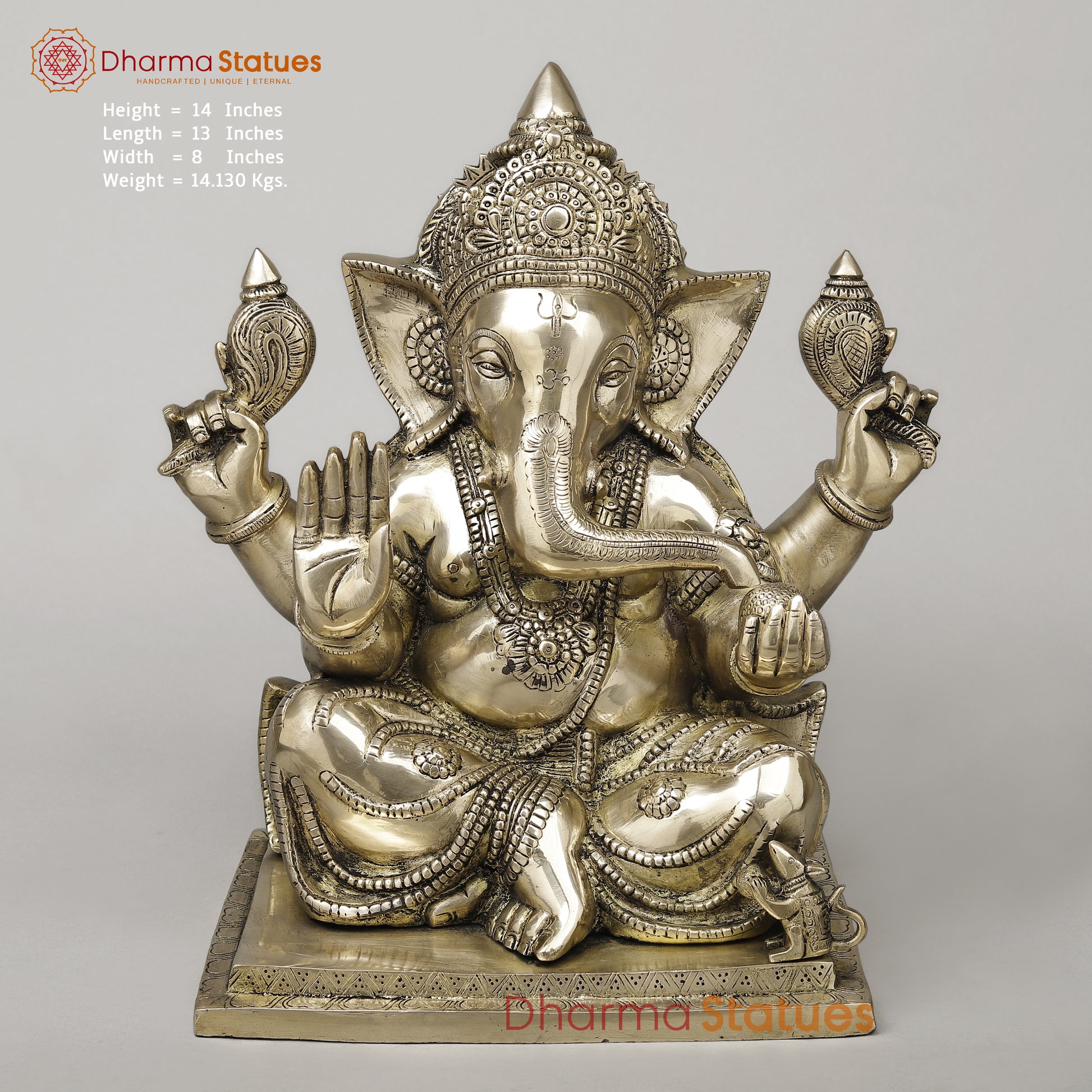 Invite prosperity and wisdom into your space with this beautifully crafted Brass Ganesh statue. Standing 14 inches tall, it features Lord Ganesh seated in a peaceful blessing posture, symbolizing protection and positivity. The fine golden finish accentuates its intricate details, making it a timeless addition to any décor or a meaningful gift.