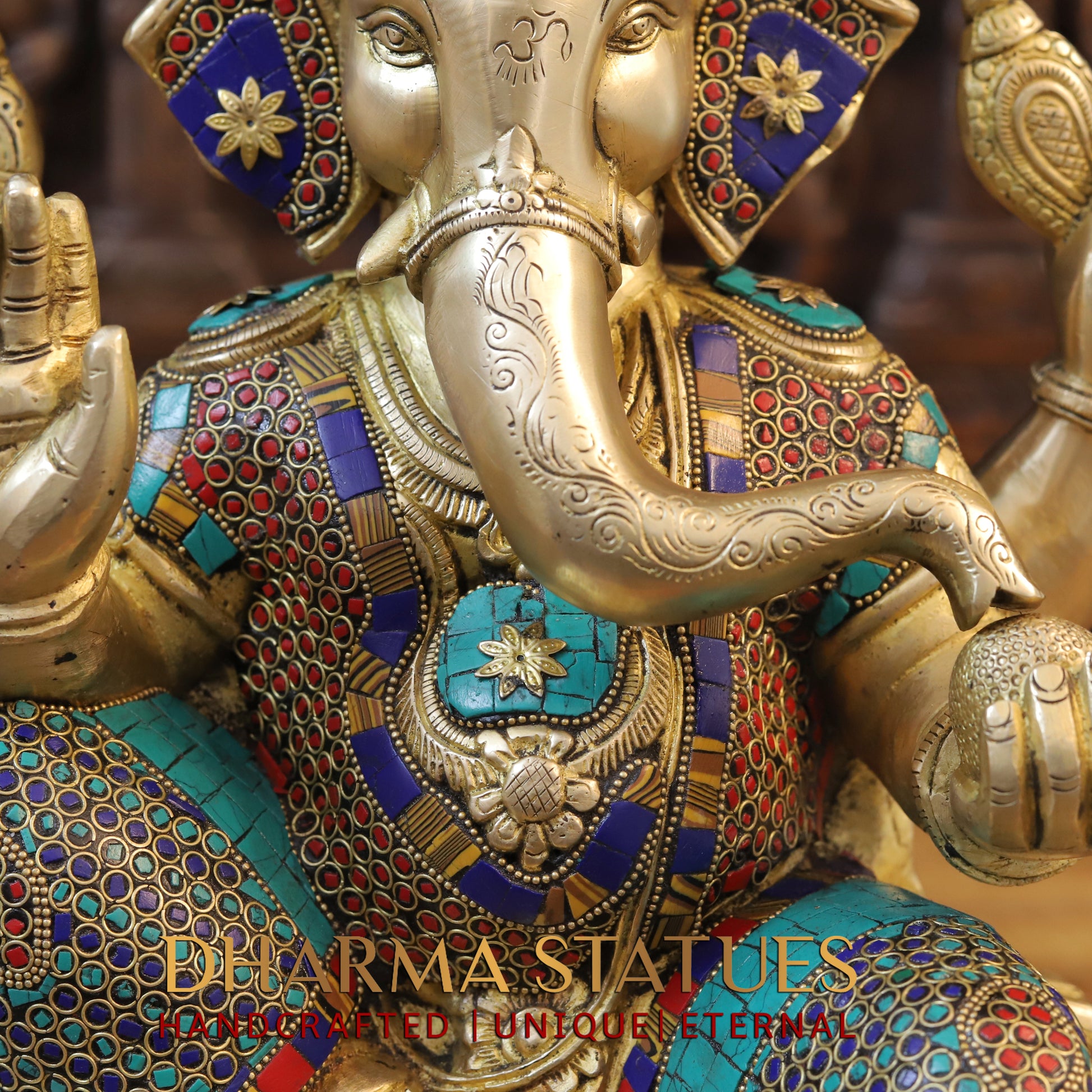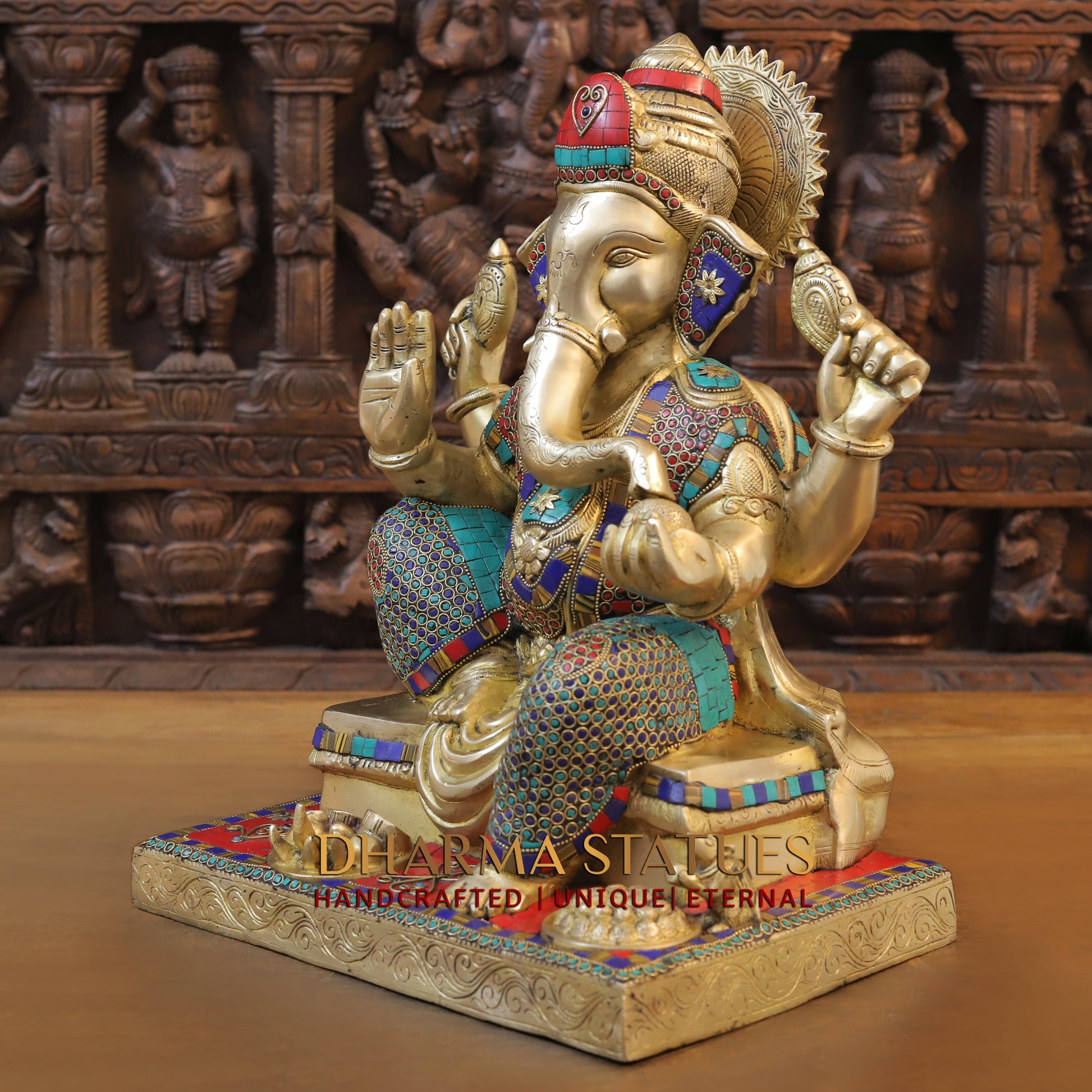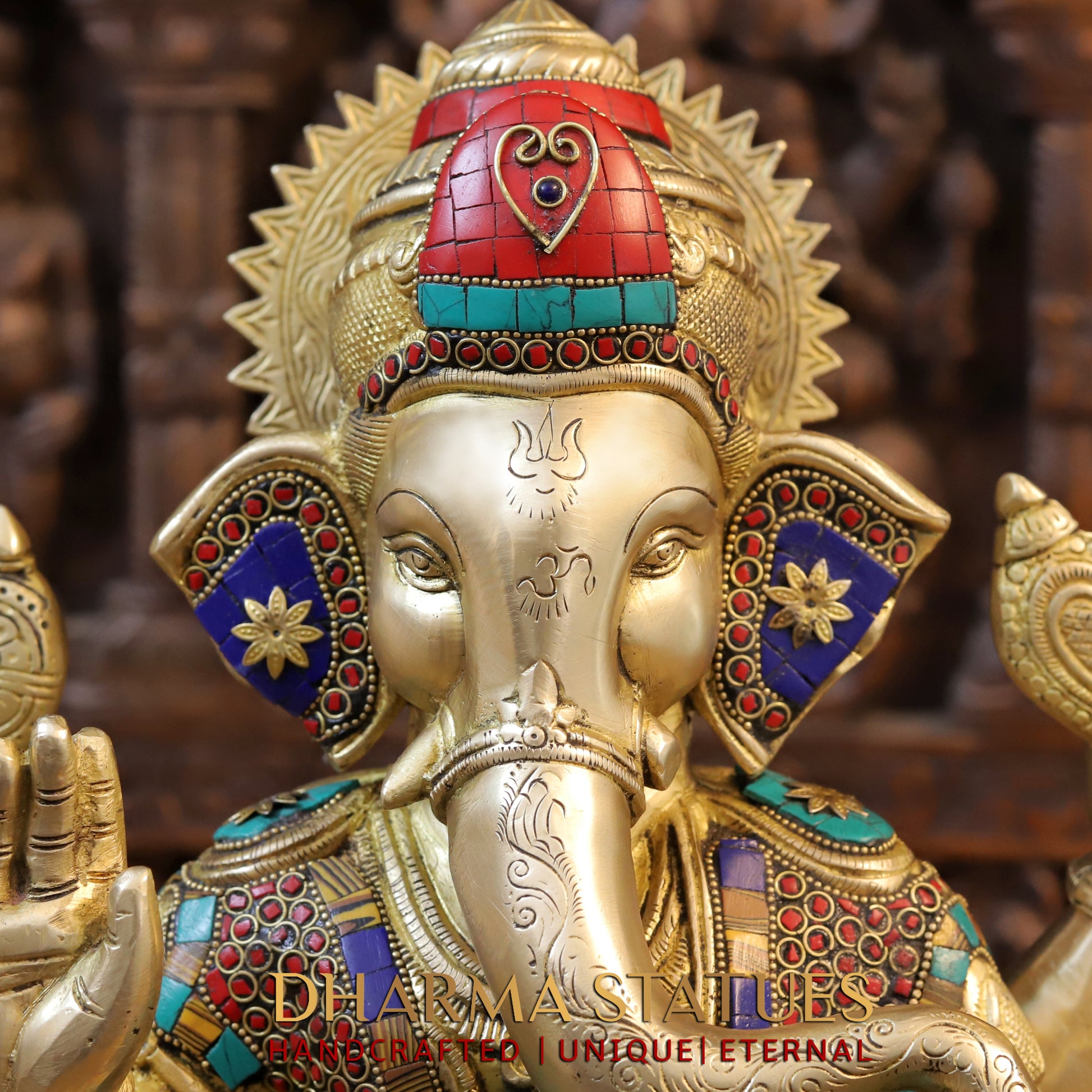 As a master craftsman, I have created this stunning 16.5" Brass Ganesh statue seated in the Blessing Posture, adorned with intricate golden and stonework. Representing success, wisdom, and protection, this piece is a beautiful addition to any home or altar. Made with precision and care, it exudes elegance and grace.