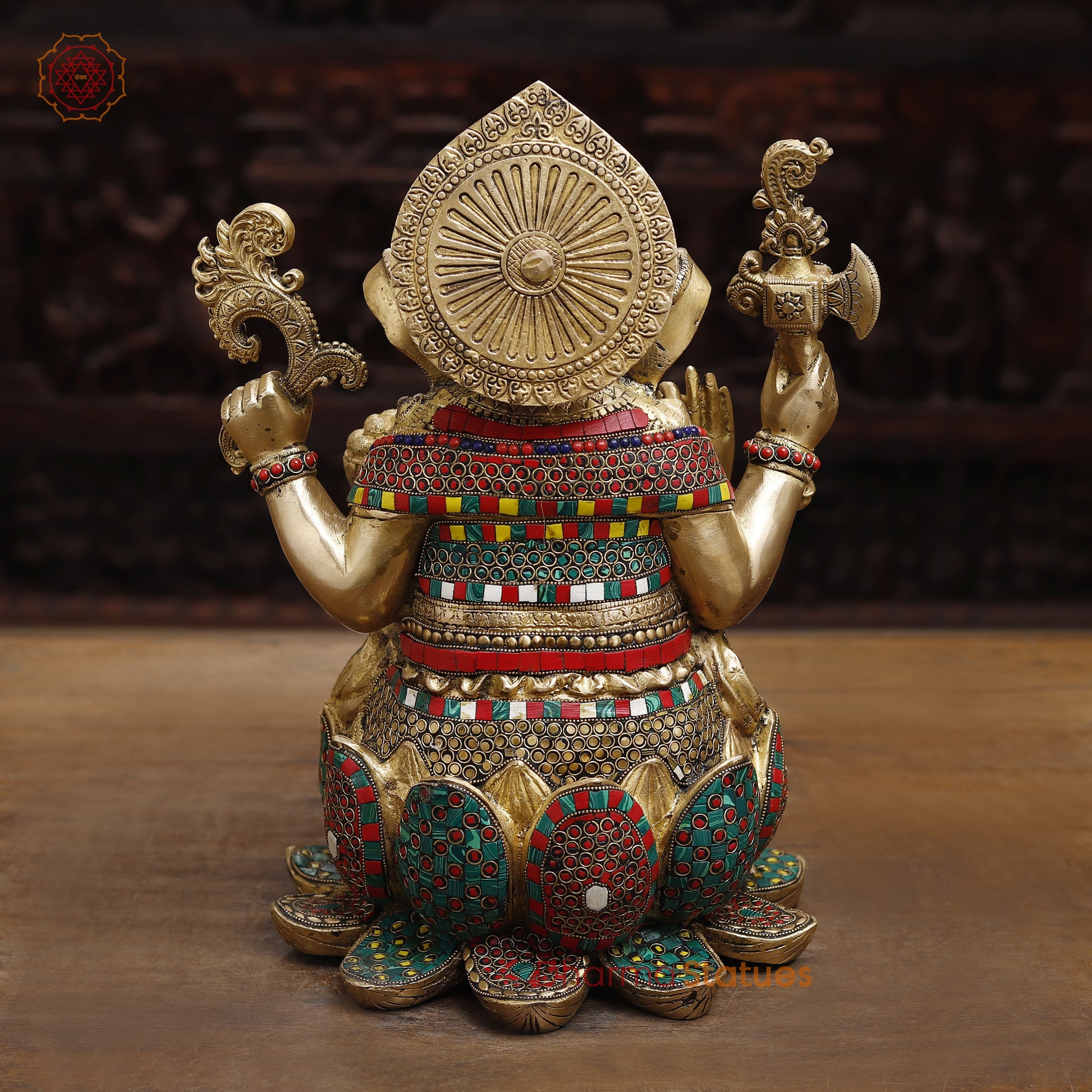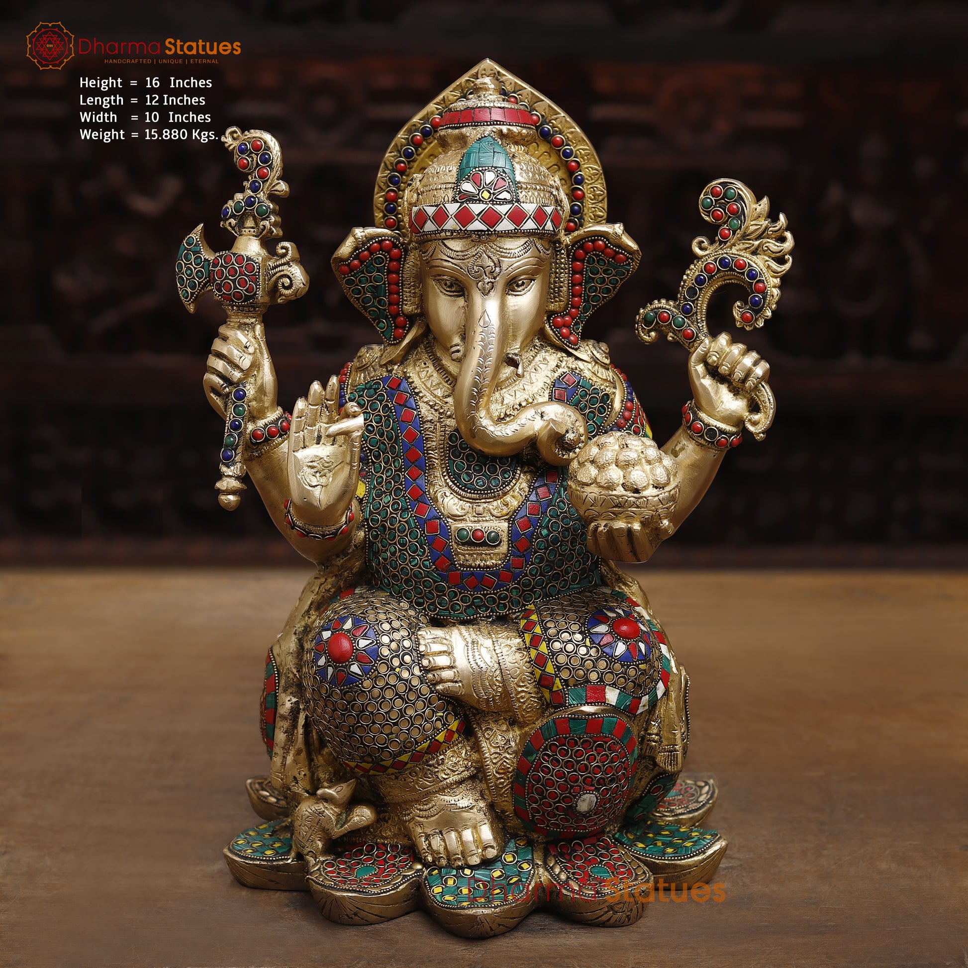 Brass Ganesh seated in Blessing Posture, Stonework & Golden Finish, 16"