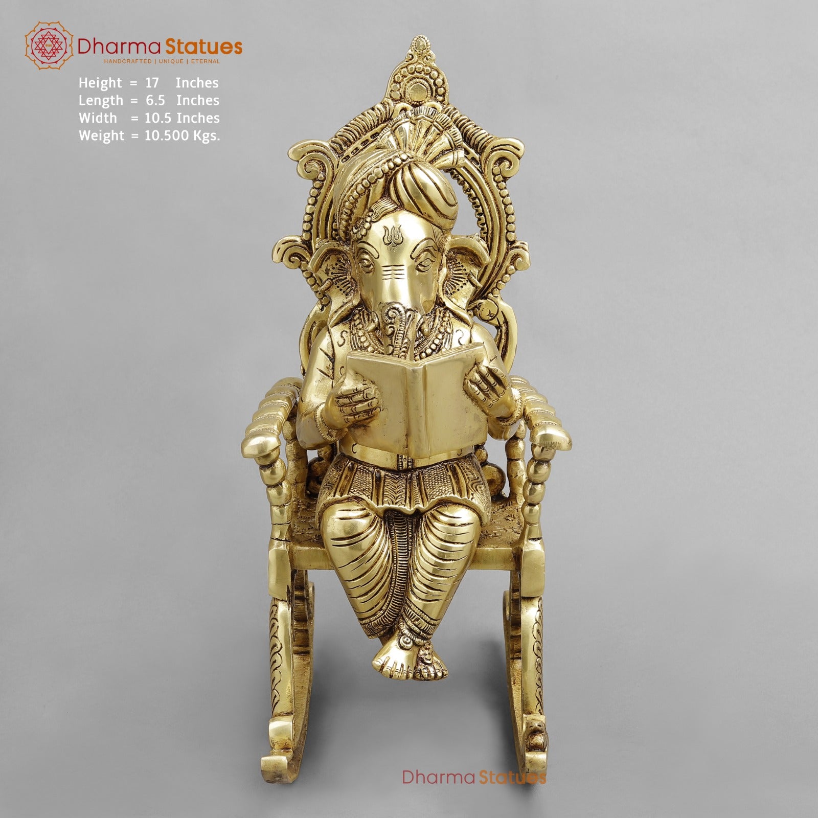 A unique and finely handcrafted brass statue of Lord Ganesha seated gracefully on a rocking chair, finished in a bright golden polish. Depicted reading a sacred text, this idol symbolizes wisdom, learning, calmness, and thoughtful guidance. Perfect for home pooja rooms, study areas, offices, and spiritual décor, it adds a charming yet auspicious presence to any space.