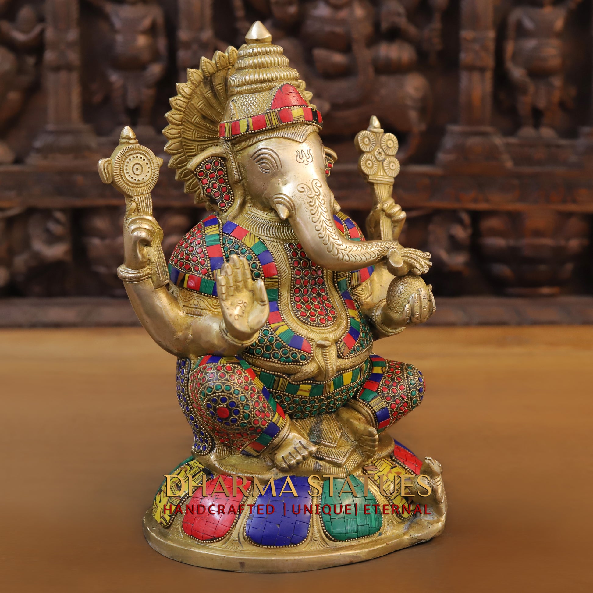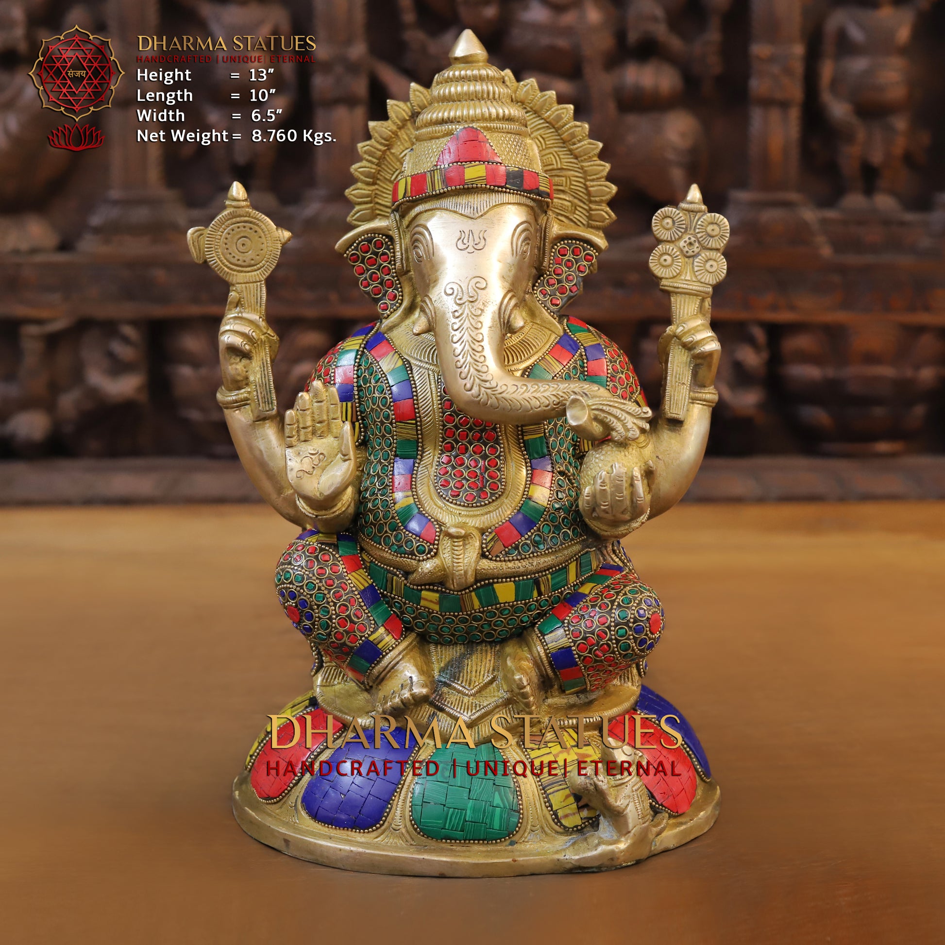 Brass Ganesh seated on Base, Blessing Posture, Golden & Stonework, 13"