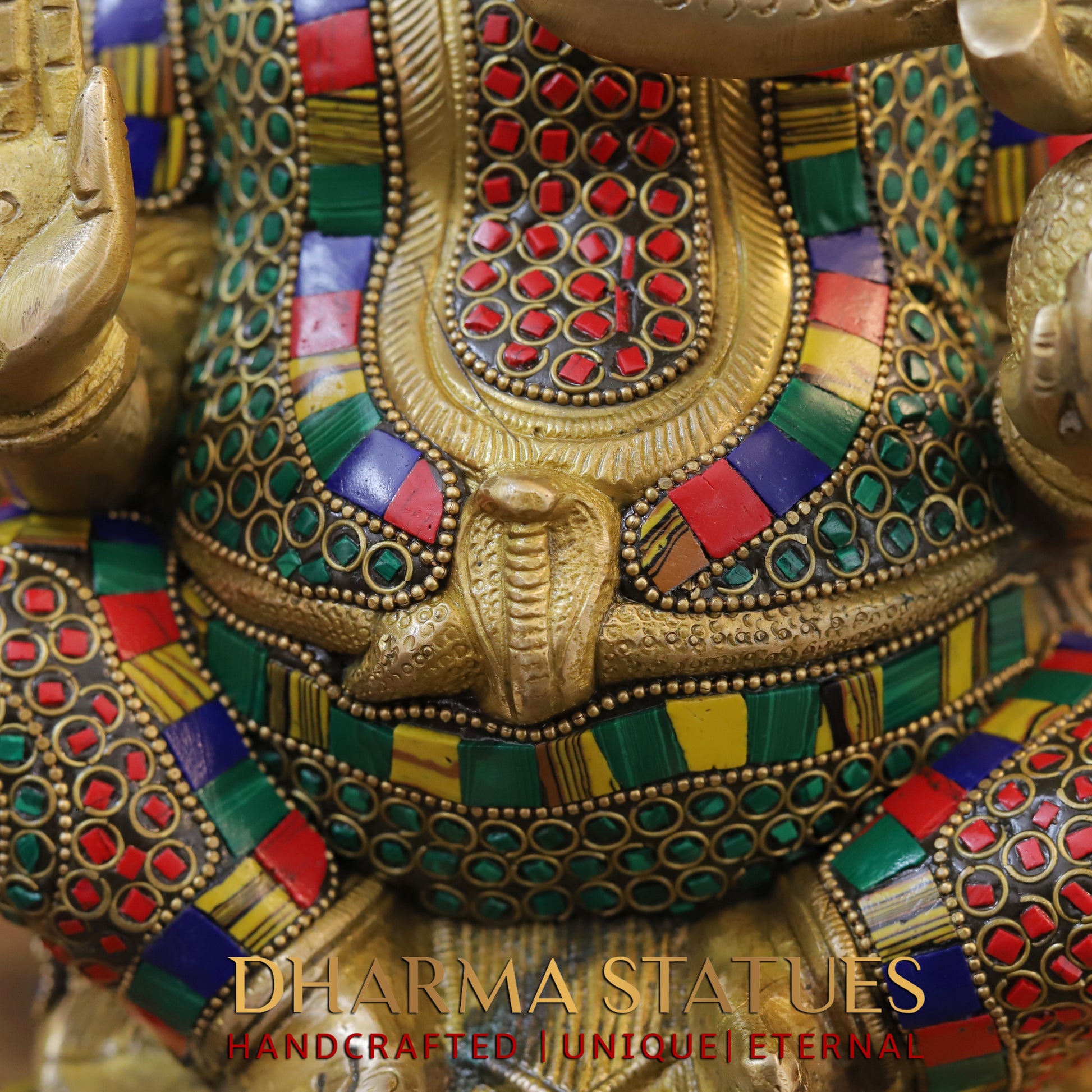 Expertly crafted from brass, this 13" Ganesh figurine showcases a blessing posture and intricate golden & stonework. With its elegant design and expert construction, it will make a beautiful addition to any space. Perfect for those seeking a touch of spiritual and cultural depth in their decor.