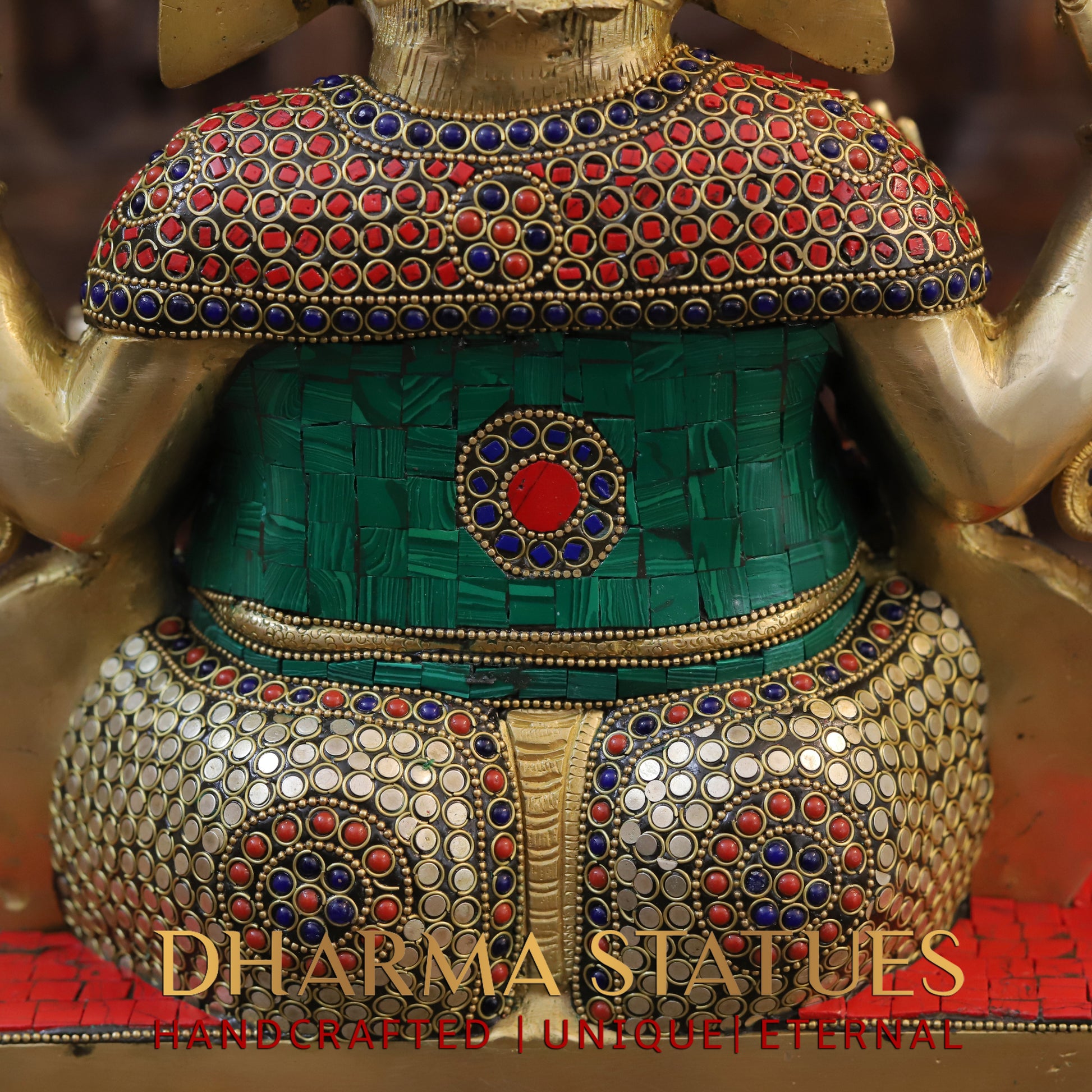 Brass Ganesh seated on Base, Blessing Posture, Golden & Stonework, 15.5"