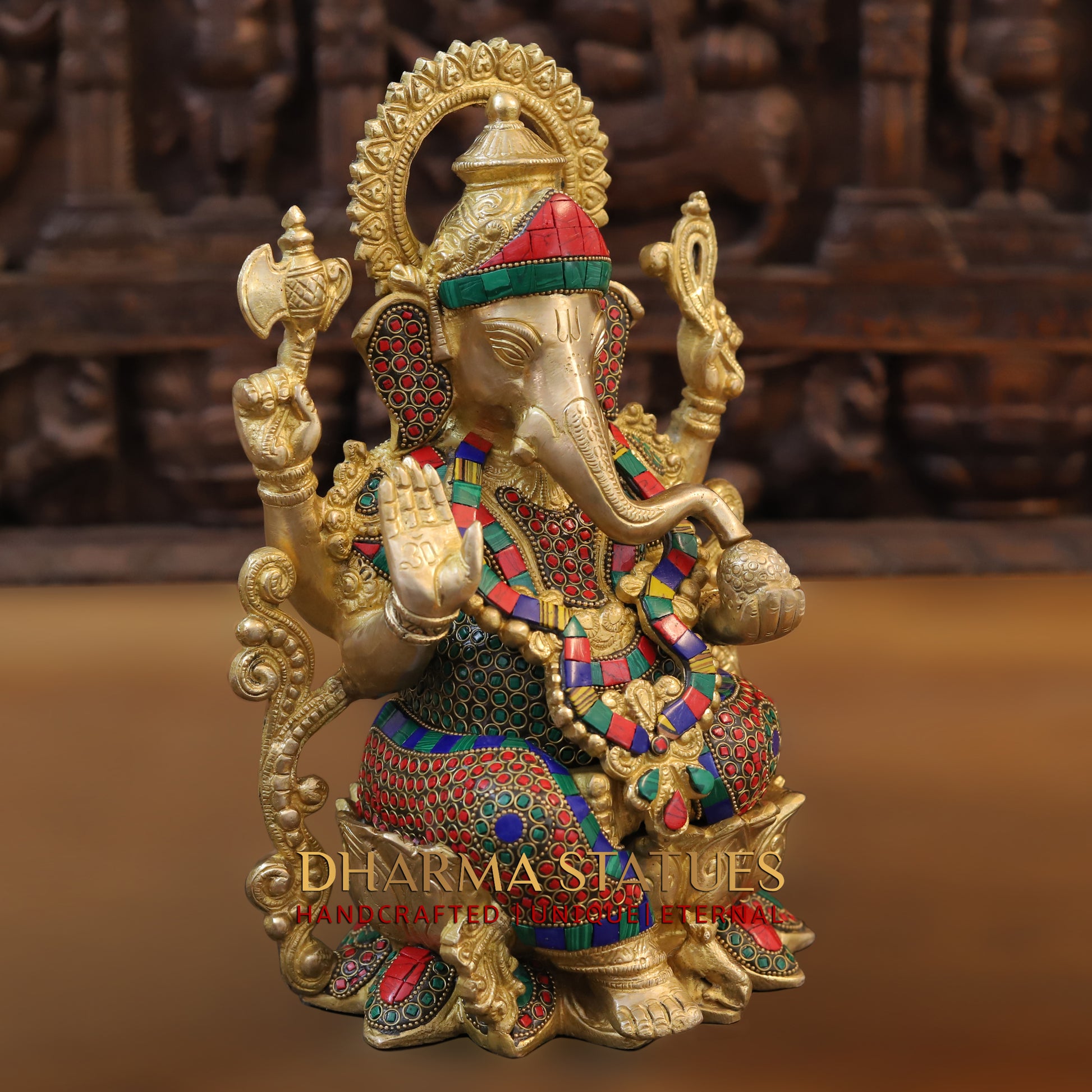 Brass Ganesh seated on Lotus, Blessing Posture, Golden & Stonework, 11.5"