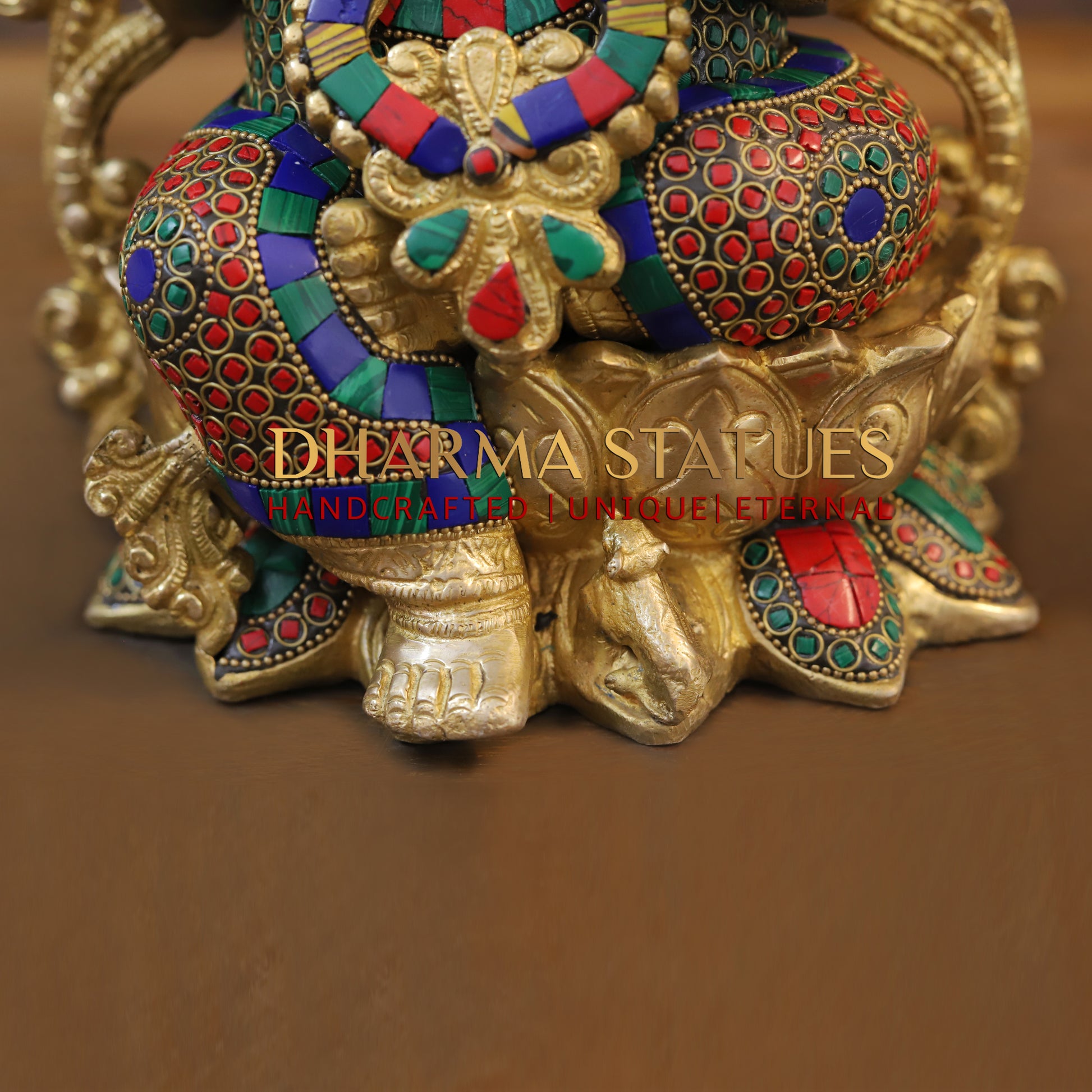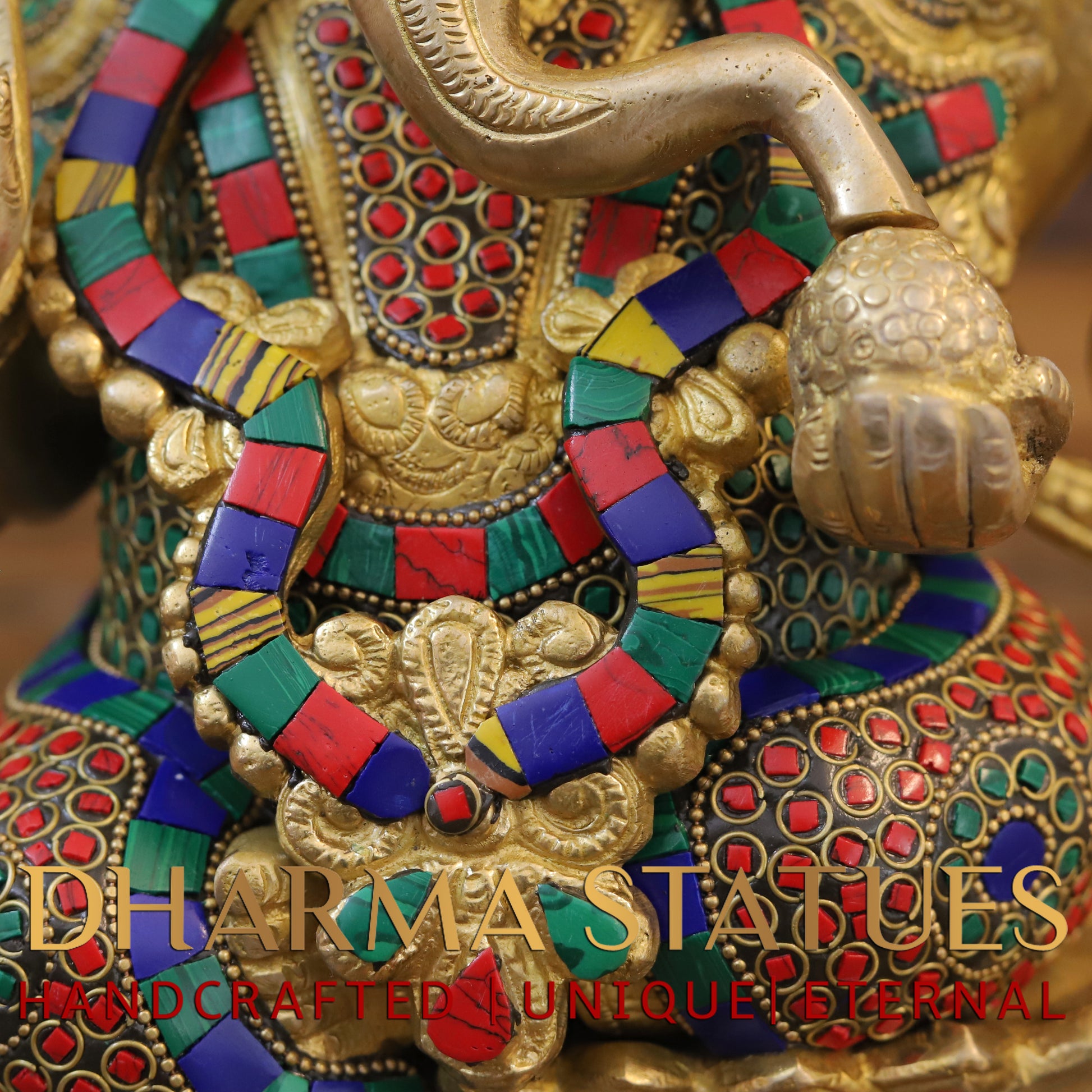 This beautiful 11.5" brass Ganesh statue is crafted with intricate golden and stonework, depicting the revered deity seated on a lotus in a blessing posture. Perfect for bringing blessings and auspicious energy to any space. A truly divine addition to your home decor or spiritual practice.