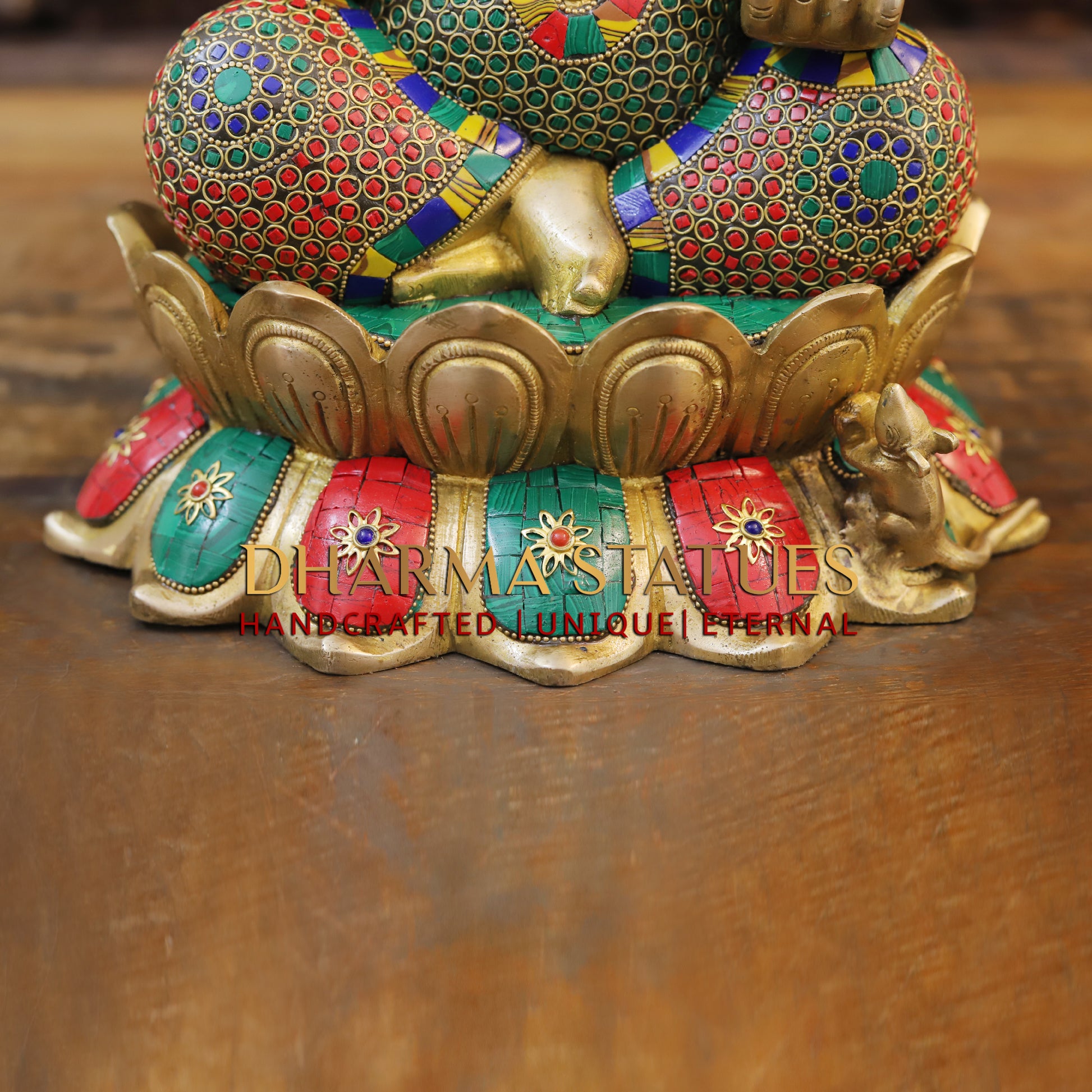 Brass Ganesh seated on Lotus, Blessing Posture, Golden & Stonework, 14.5