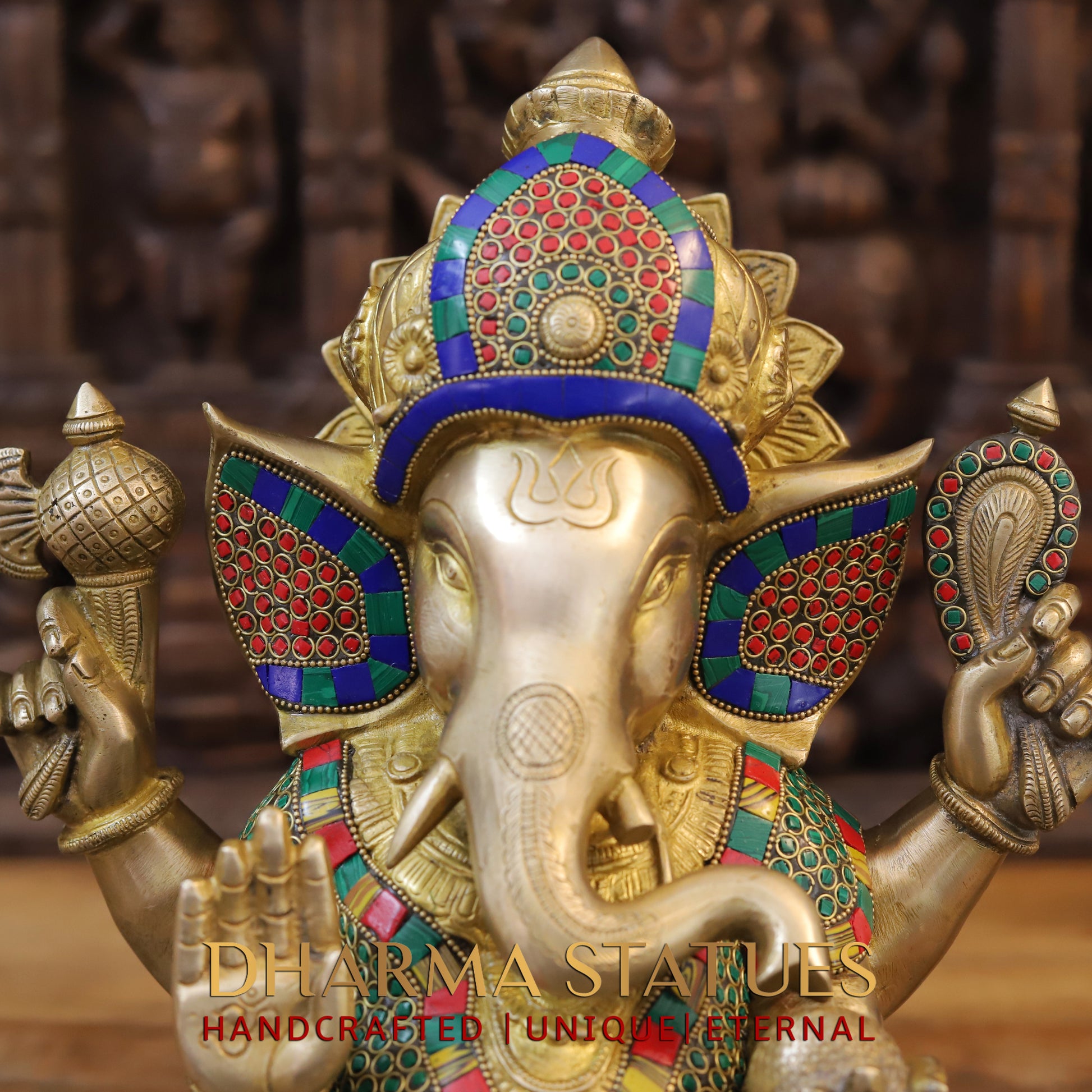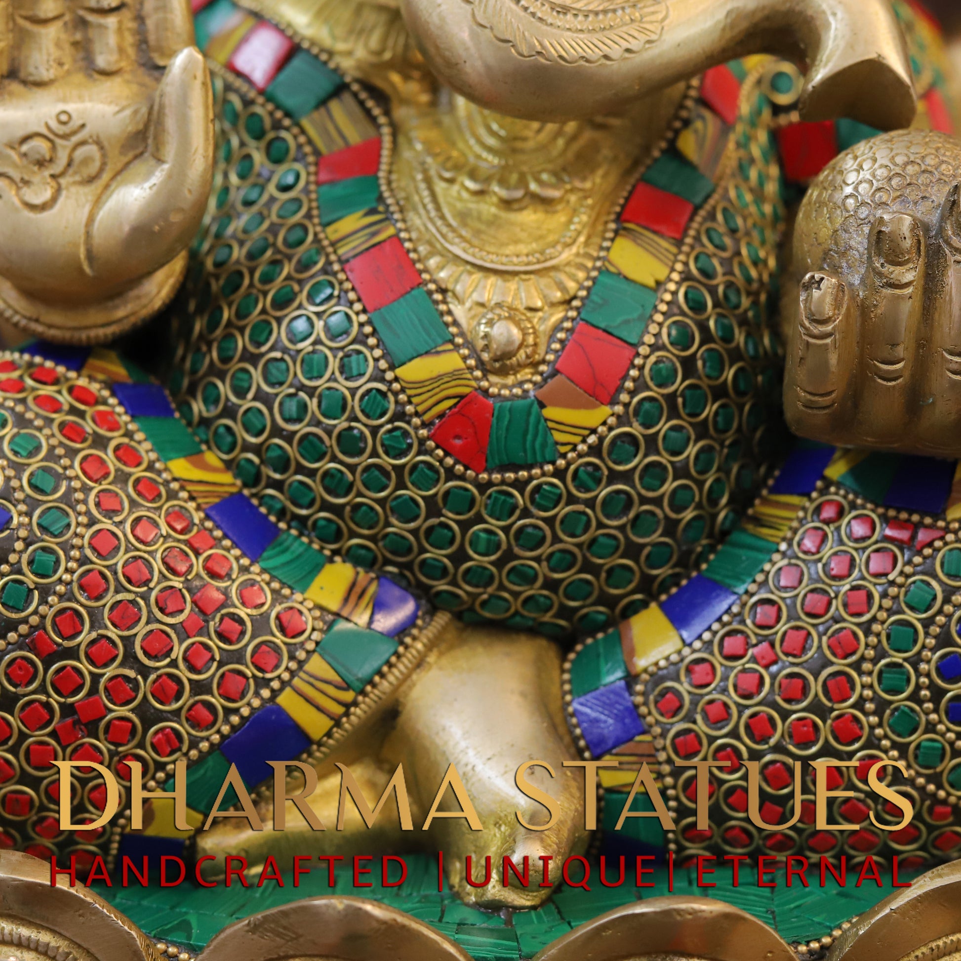 This intricately crafted Brass Ganesh statue showcases the deity's blessing posture, symbolizing good luck and prosperity. The golden and stonework detail adds to its stunning aesthetic. Perfect for home or office decor, it brings a touch of spirituality and positive energy to any space.
