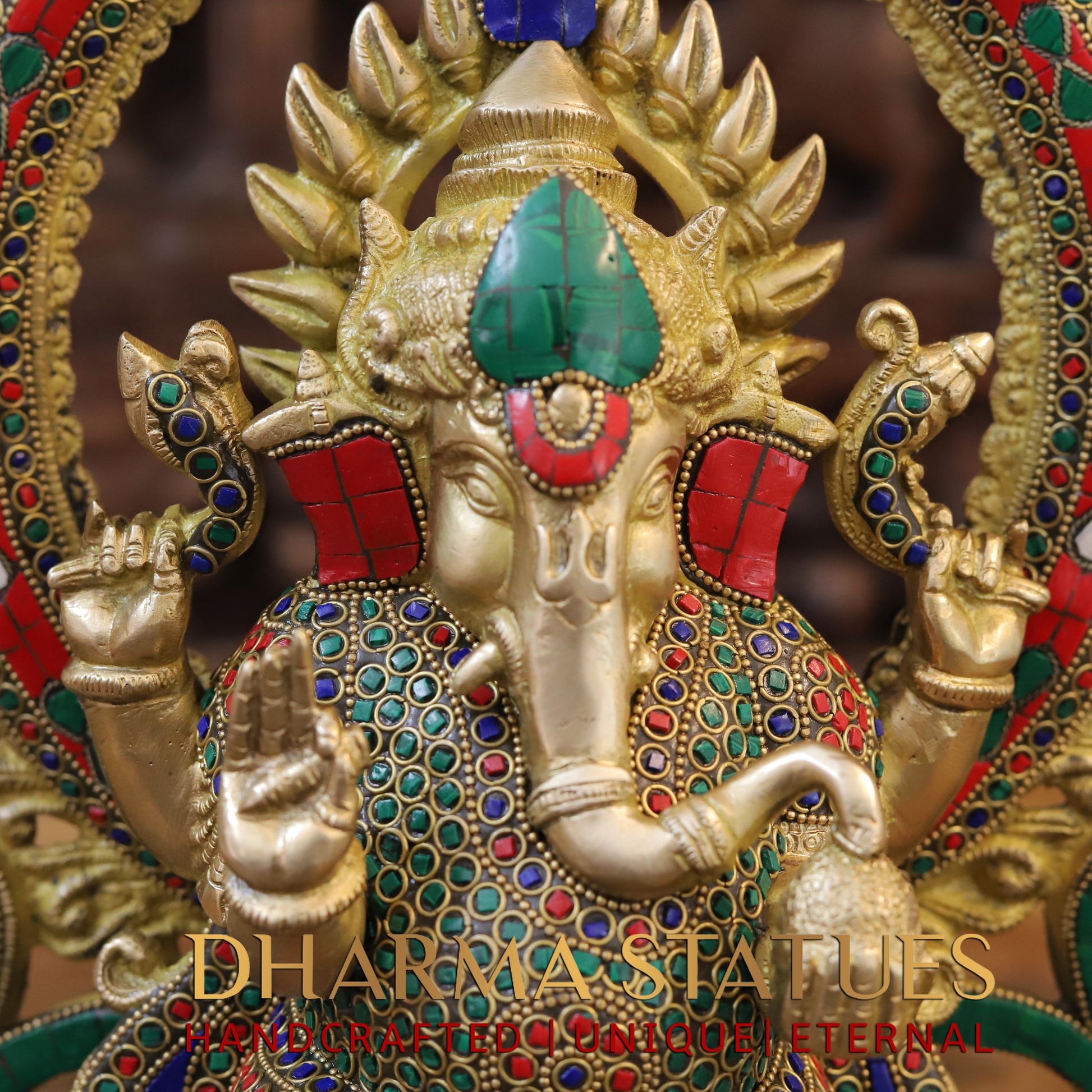 Brass Ganesh seated on Throne, Blessing Posture, Golden & Stonework, 16"