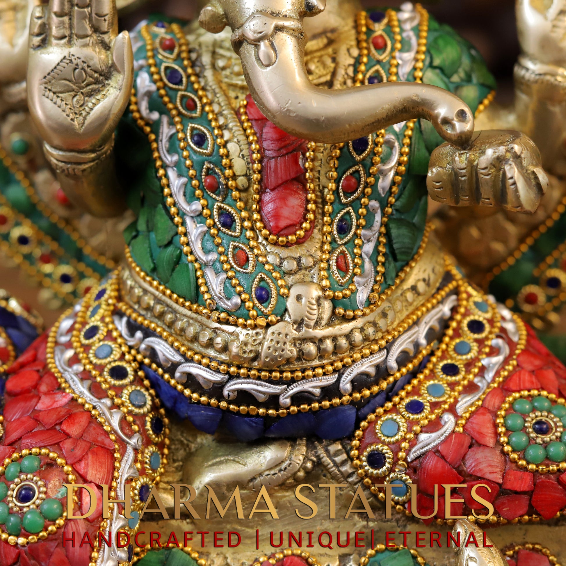 Expertly crafted from brass, this 17.5" Ganesh figurine is adorned with exquisite stonework and a golden finish. The seated posture and intricate details of this religious symbol exude a sense of tranquility and wisdom. Perfect for adding a touch of spirituality to any space.