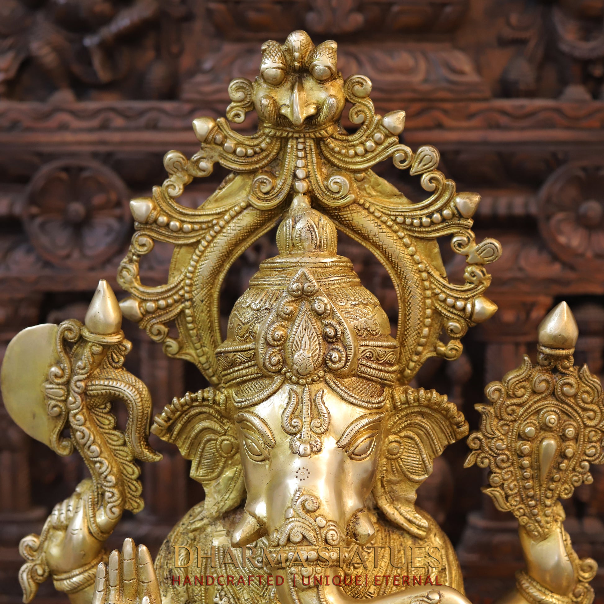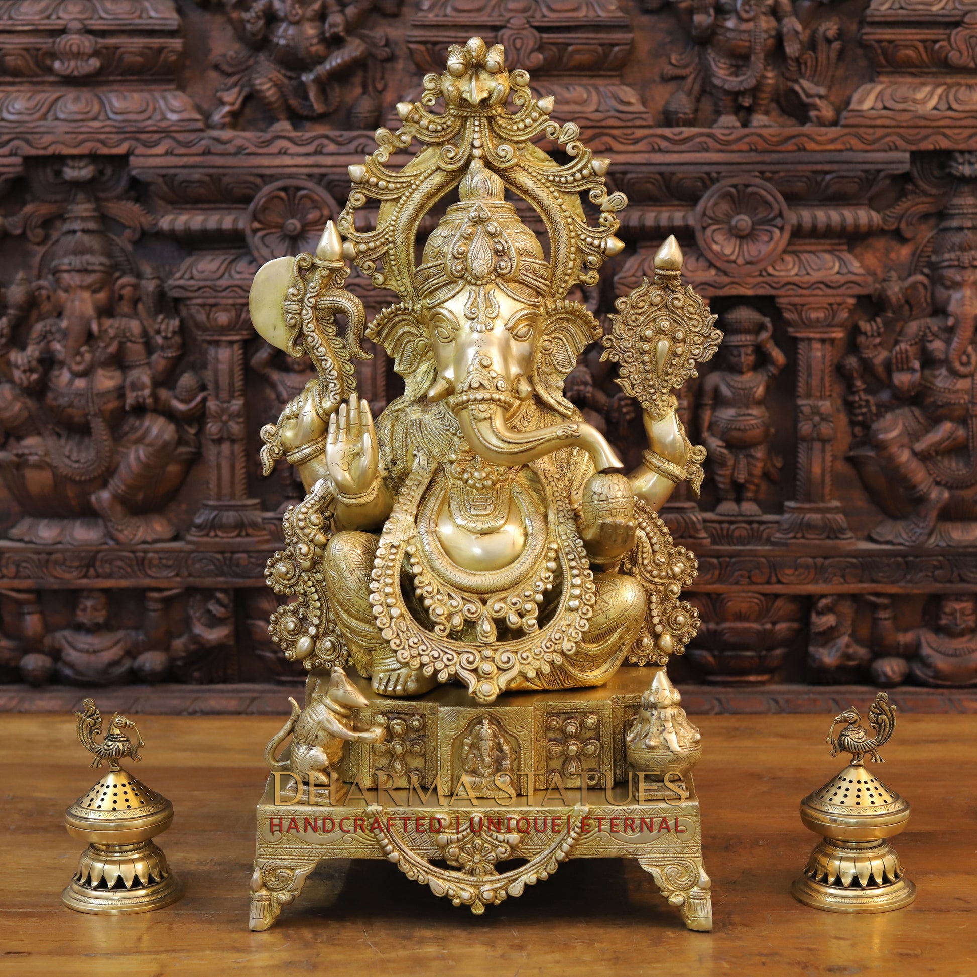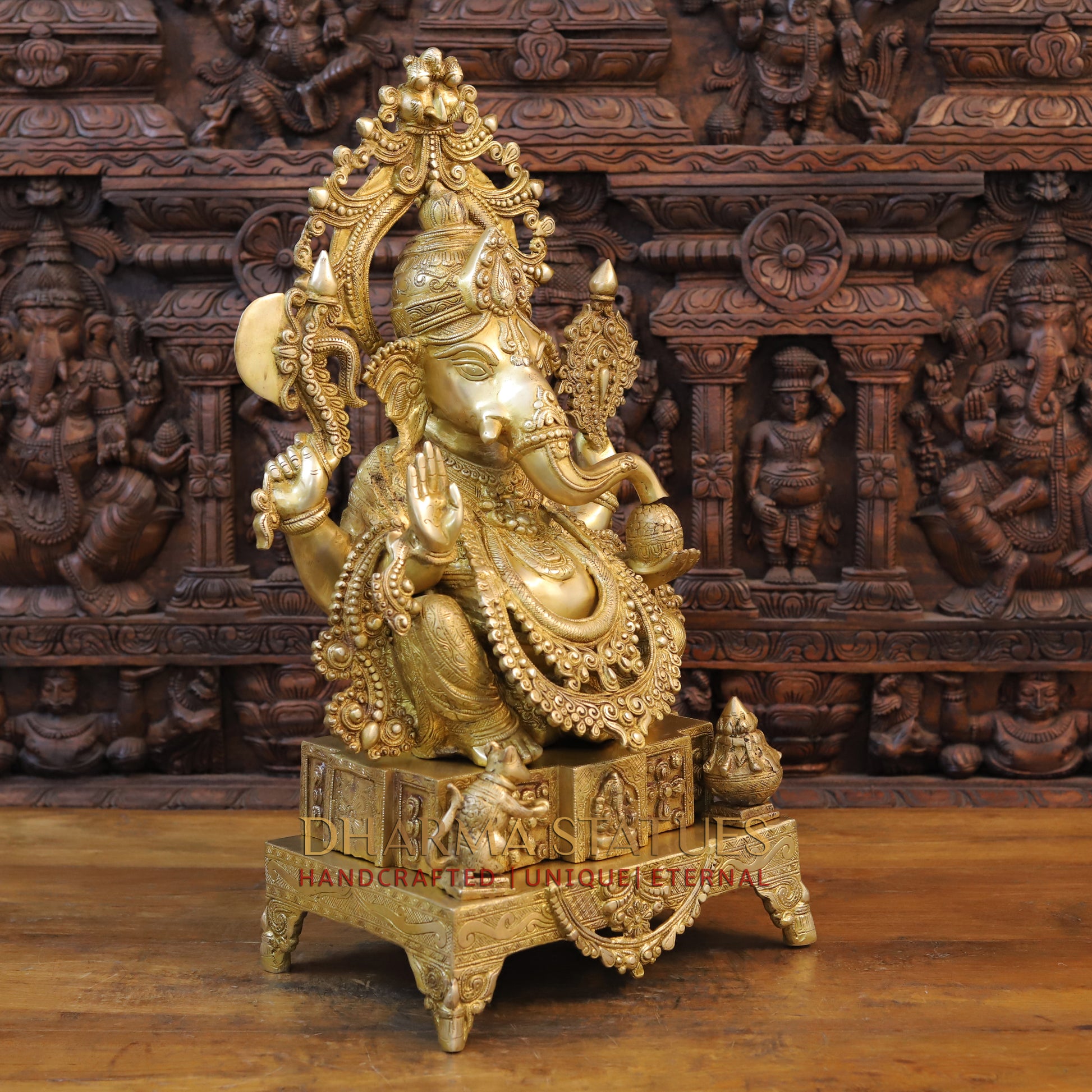 Brass Ganesh seated on Throne with Fine Carved jewelry, Golden Finish, 27"
