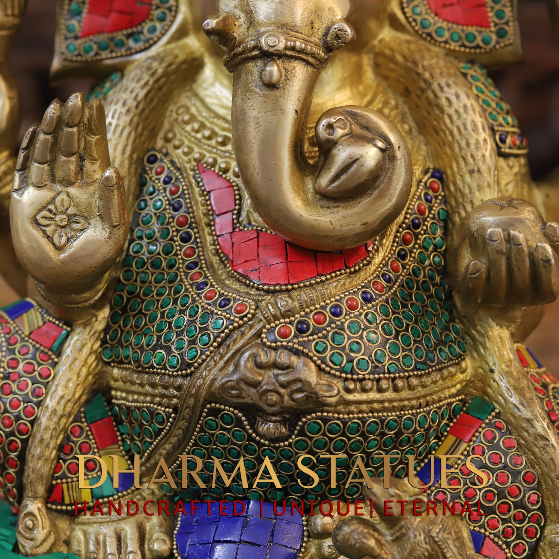 Elevate your space with the elegant and divine Brass Ganesh Seated with Rat. This 13" masterpiece features intricate golden and stonework, depicting Lord Ganesh in his blessing posture. Made of high-quality brass, this statue exudes a sense of grace, luck, and protection.