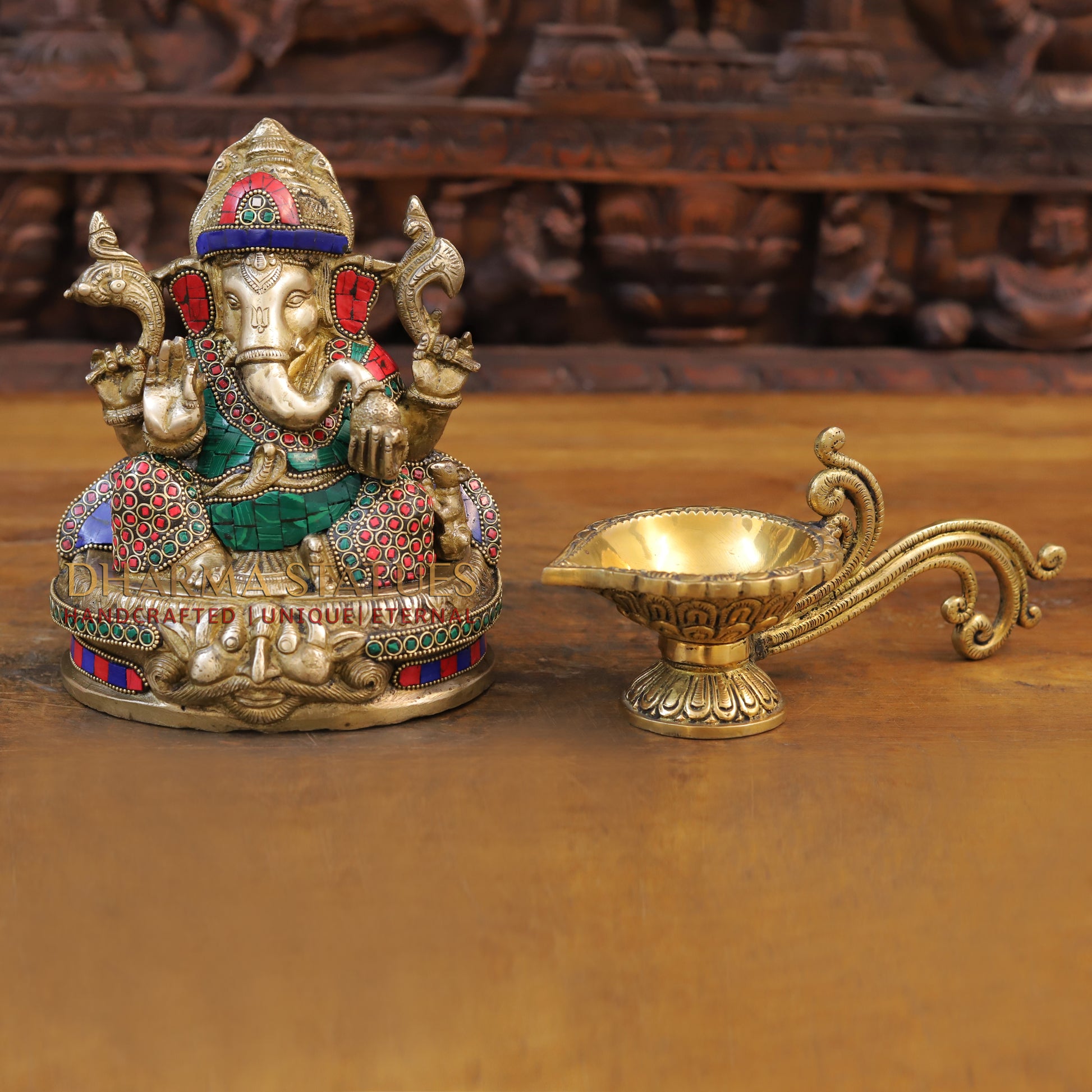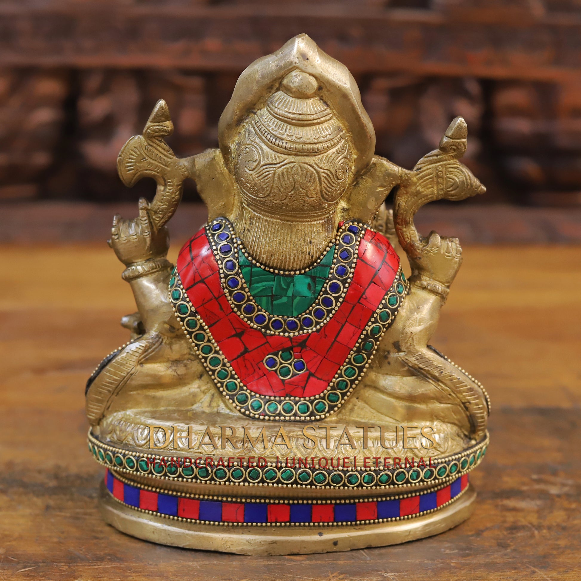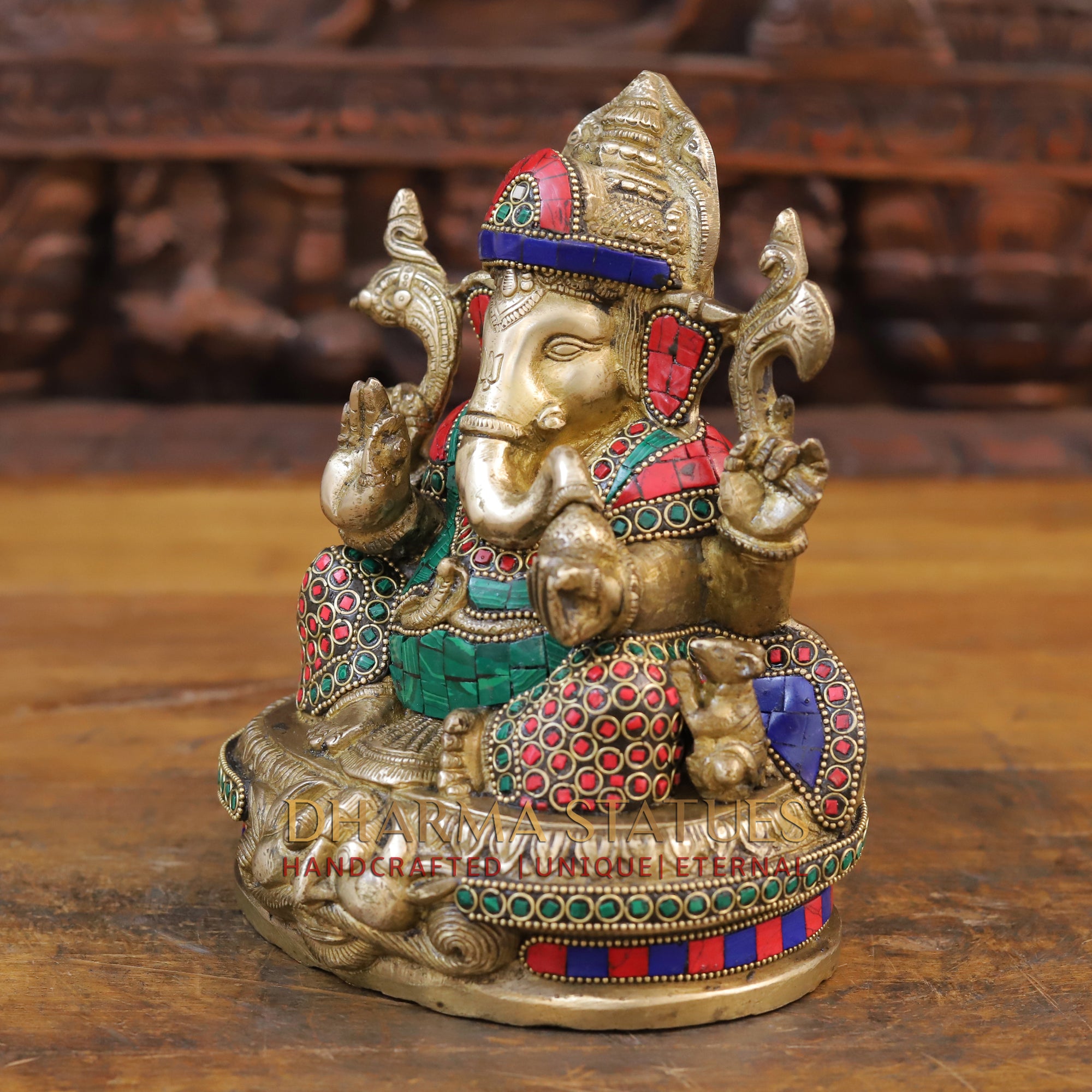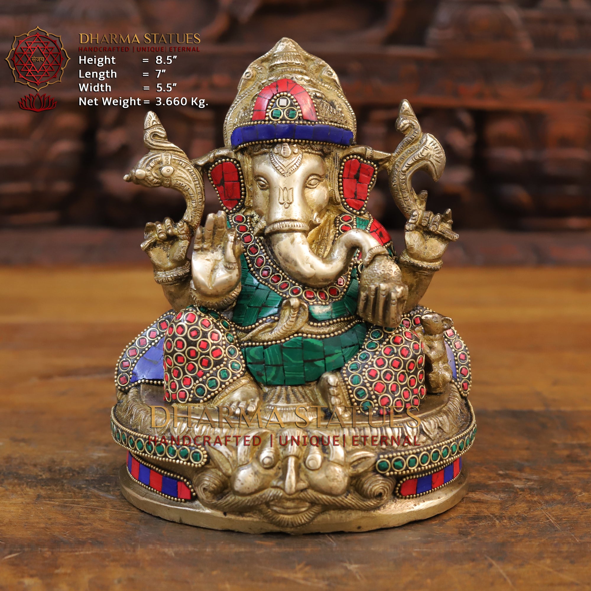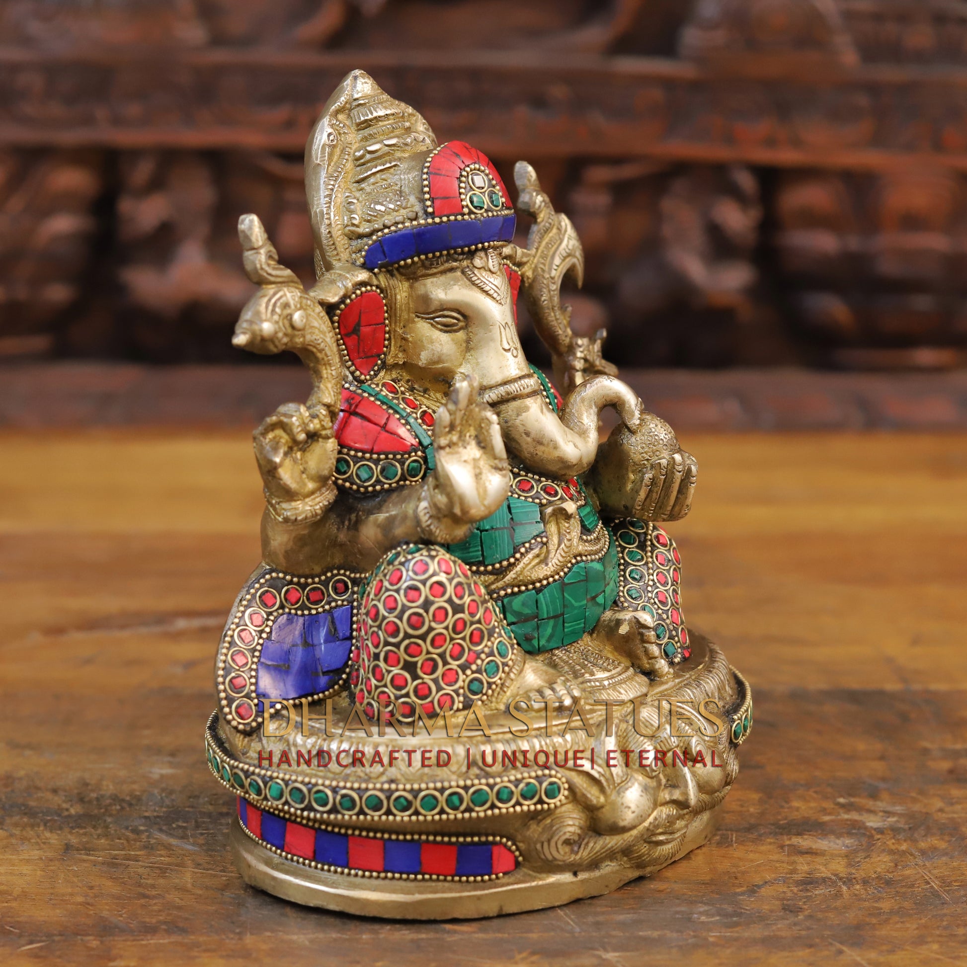 Brass Ganesh Statue, Seated in a Blessing Posture, Golden & Stone work 8.5"