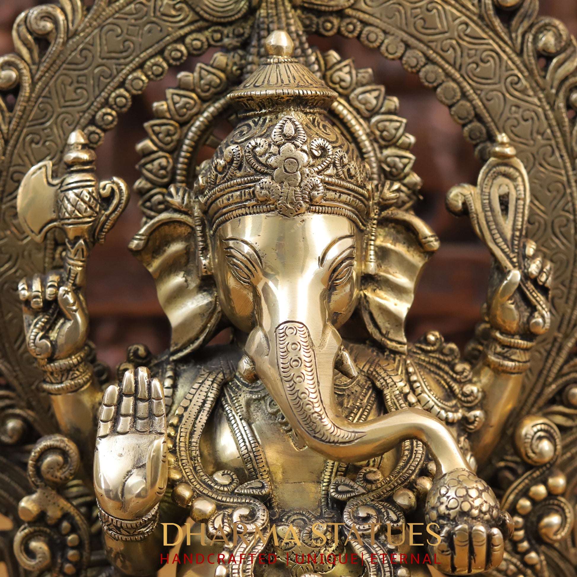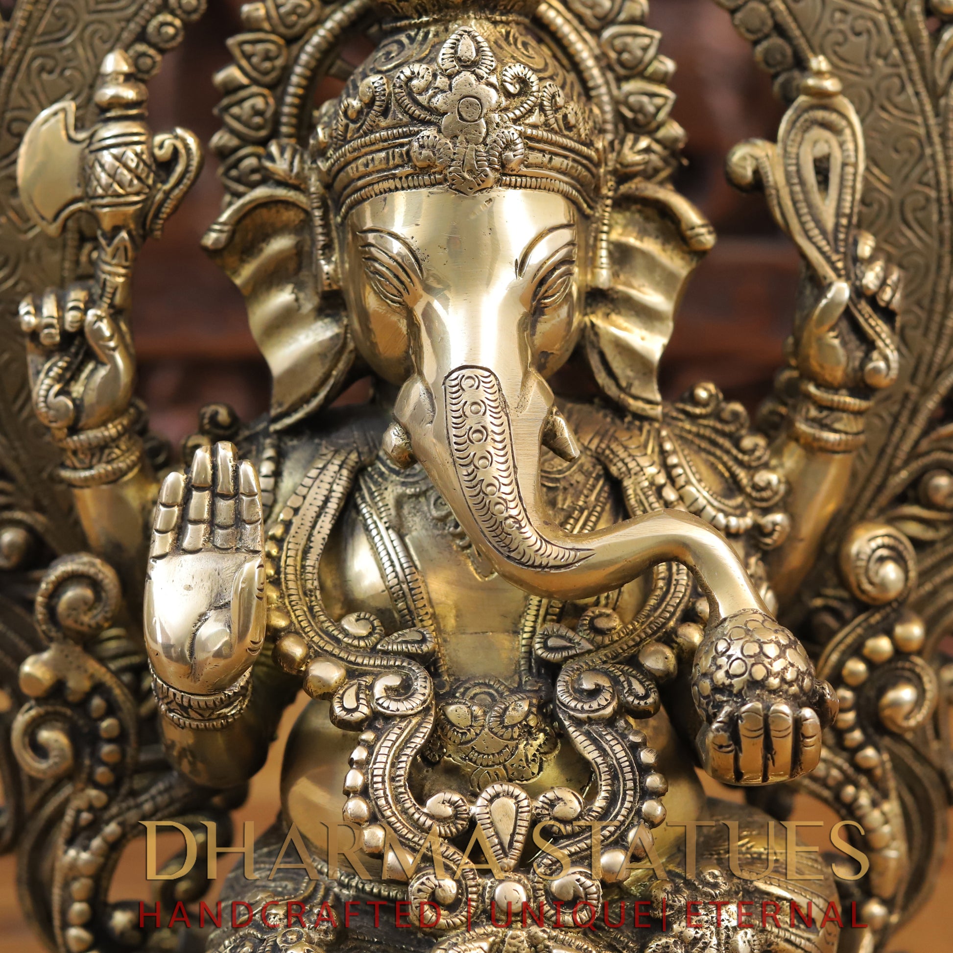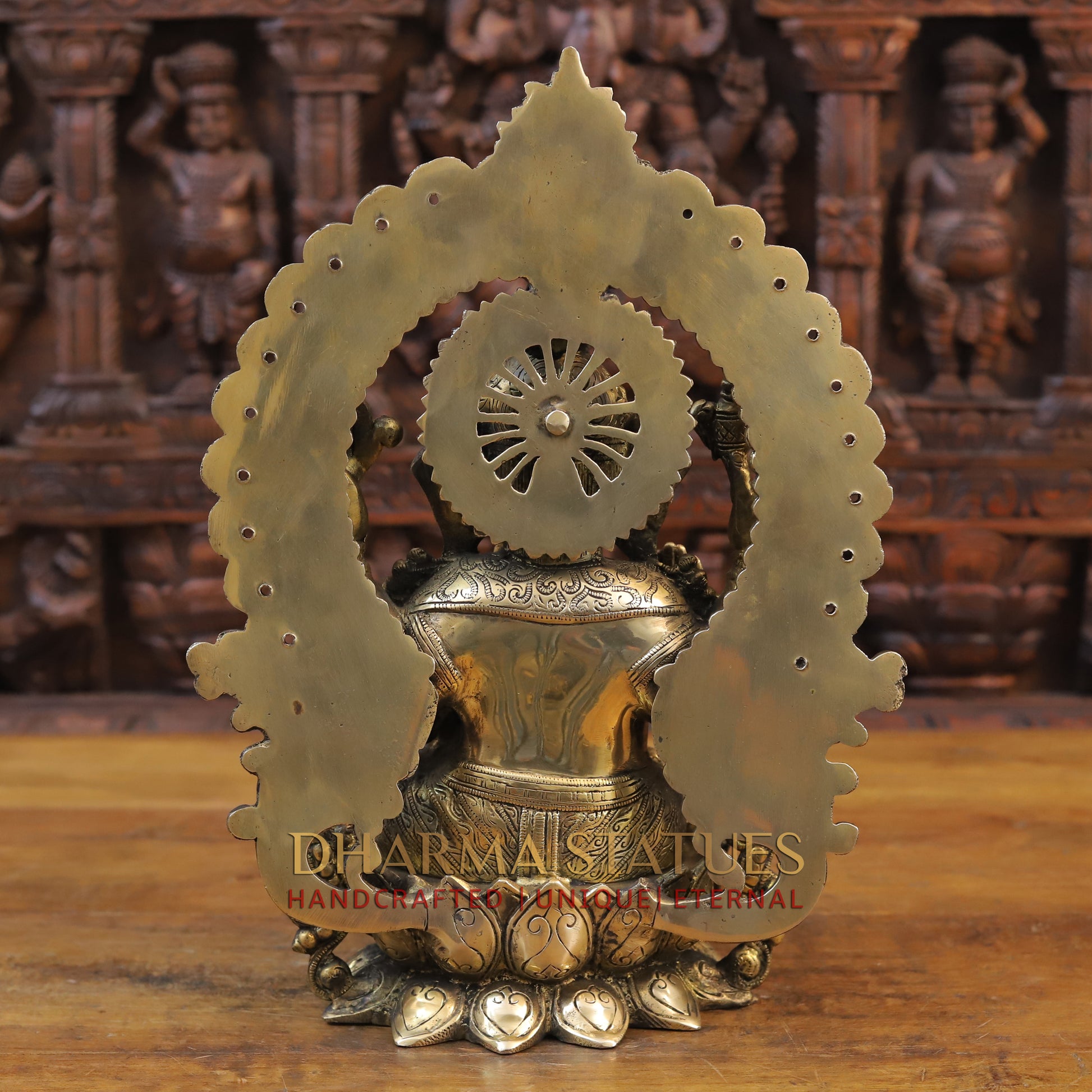 Brass Ganesh Statue, Seated on a Lotus, Fine Golden Work 16"