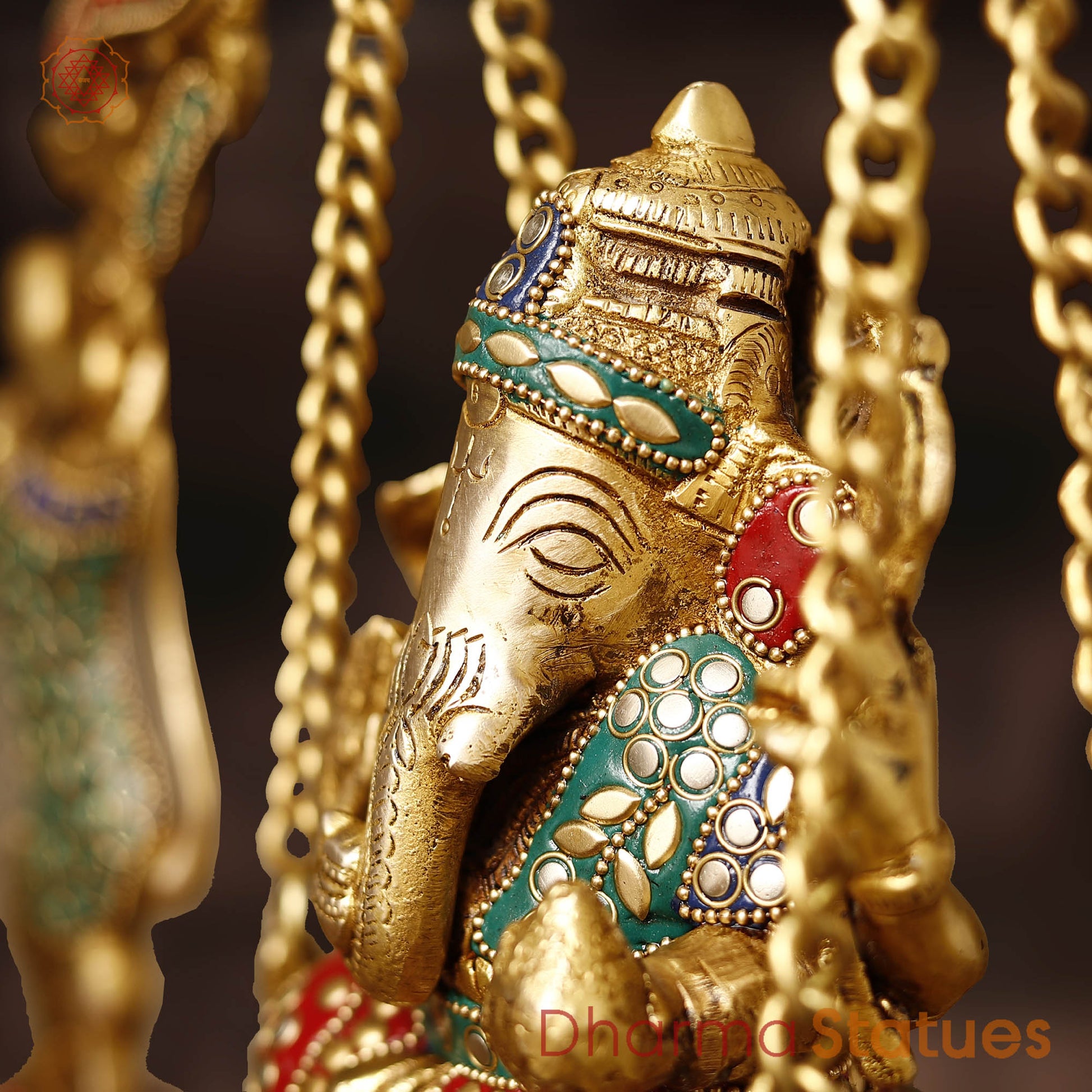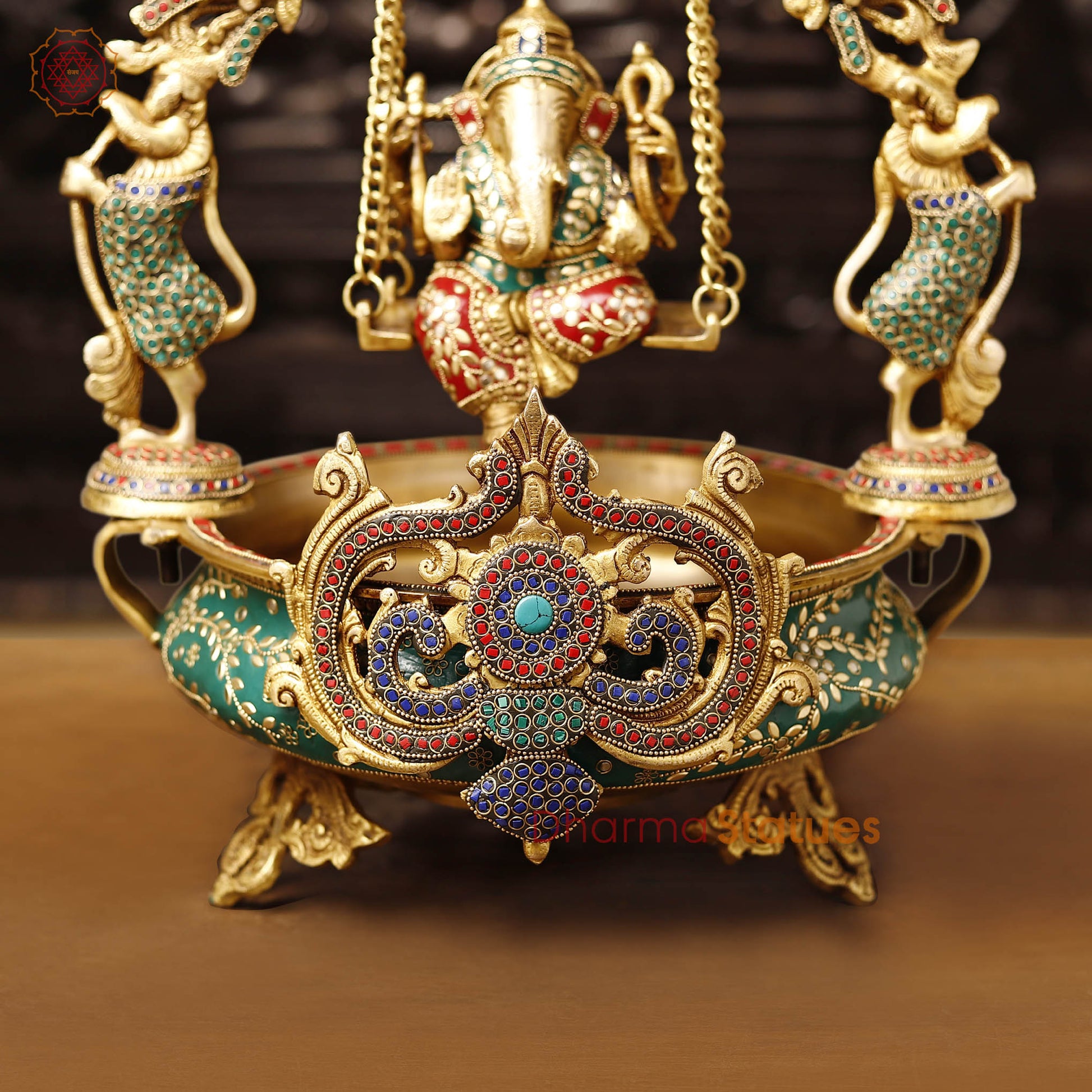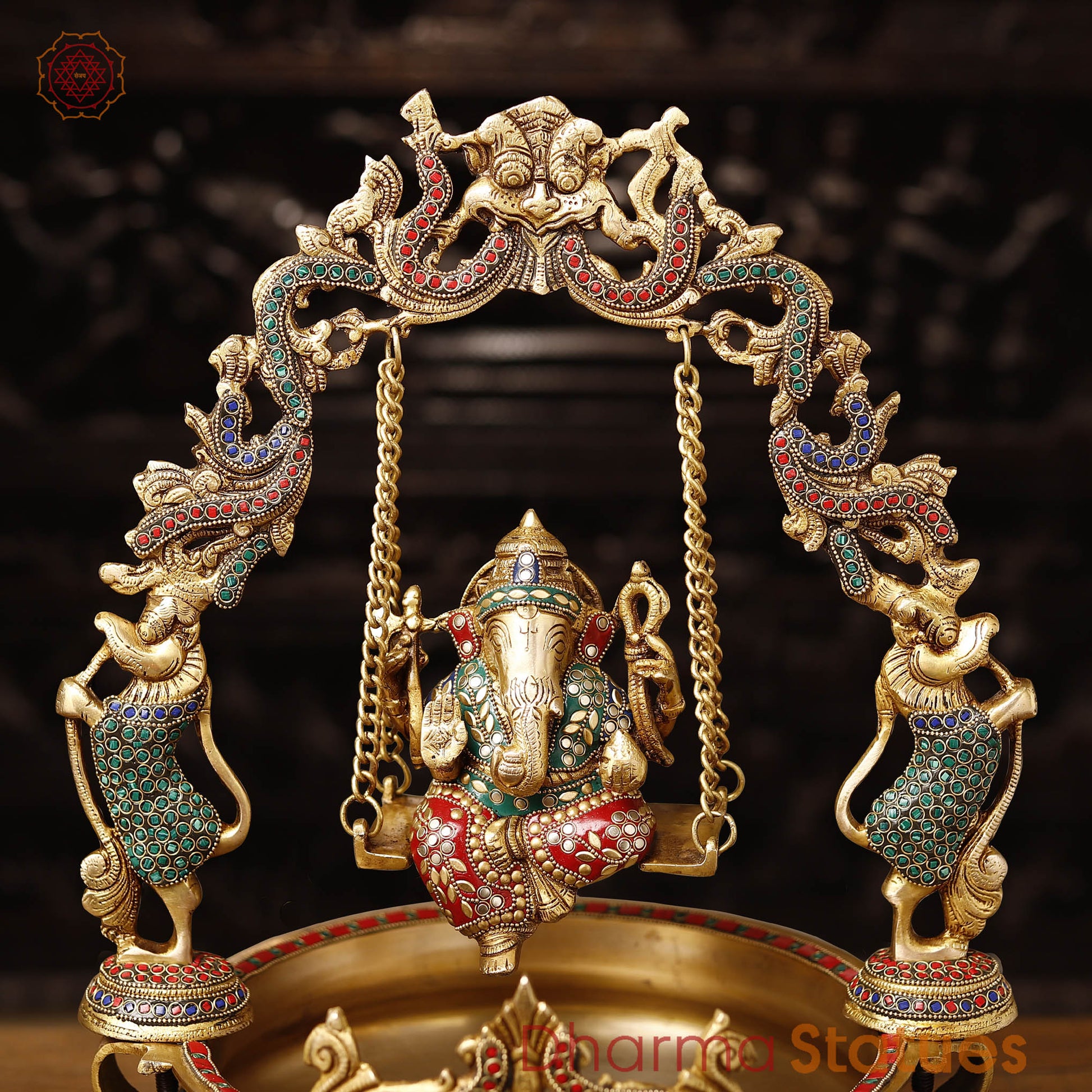 Brass Ganesh Urli With Swing, Golden finish with Stone Work, 20"