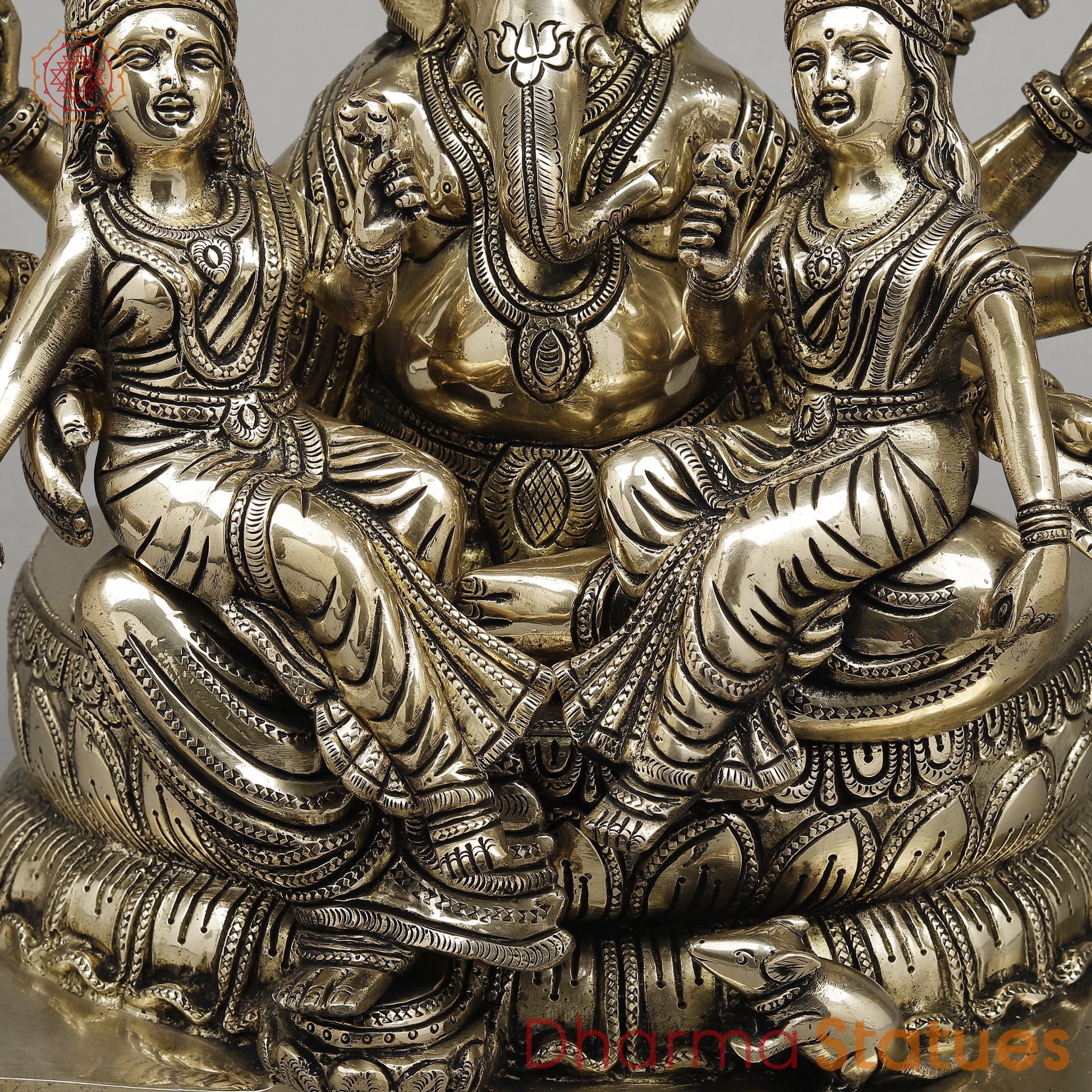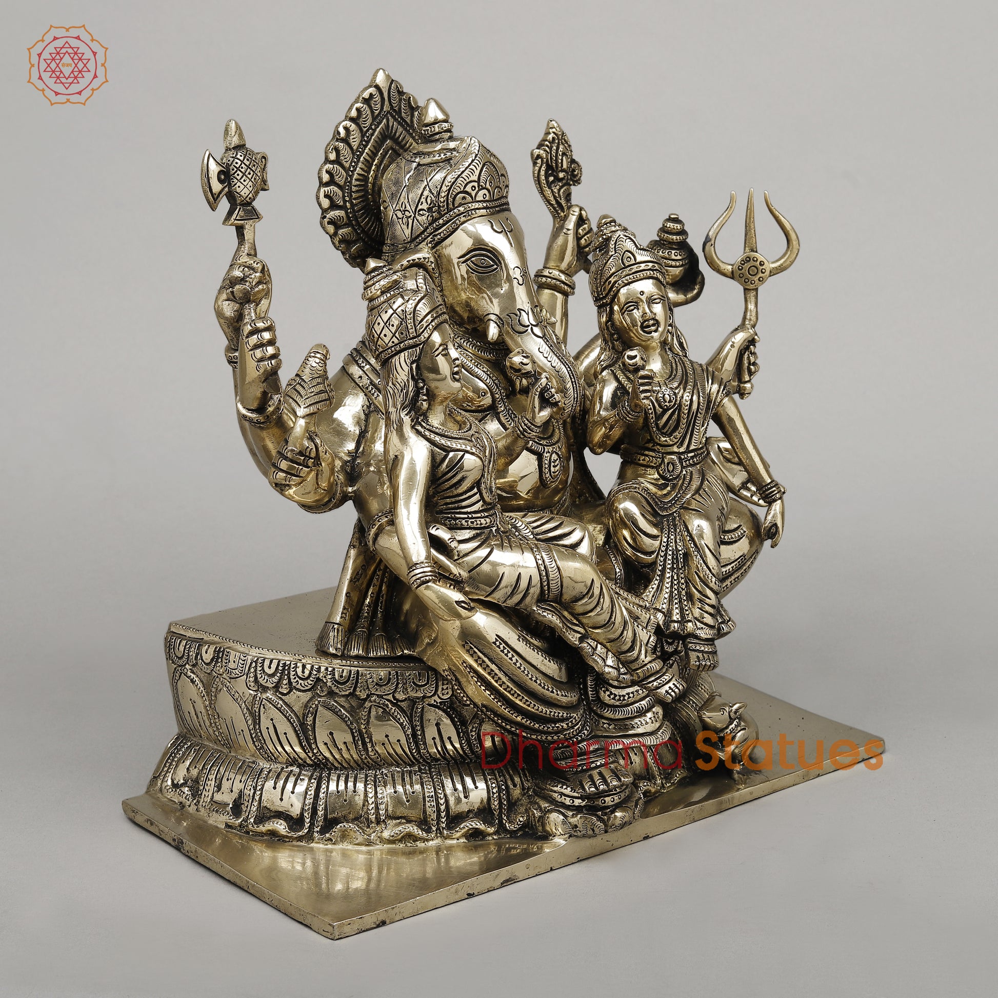 Brass Ganesh statue depicts the deity seated on a lotus flower, adorned with a fine golden finish. With intricate details, this 13" statue showcases the blessings of wealth and prosperity through Riddhi and Siddhi. Perfect for meditation or as a decorative piece.