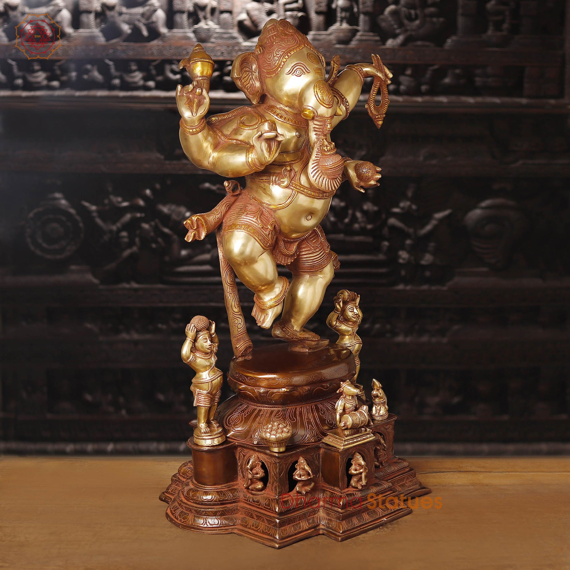 Lord Ganesha is captured in an energetic dancing posture. One leg is gracefully lifted off the pedestal, symbolizing the act of cosmic dance, often interpreted as a joyous and divine activity that balances creation and destruction in the universe.