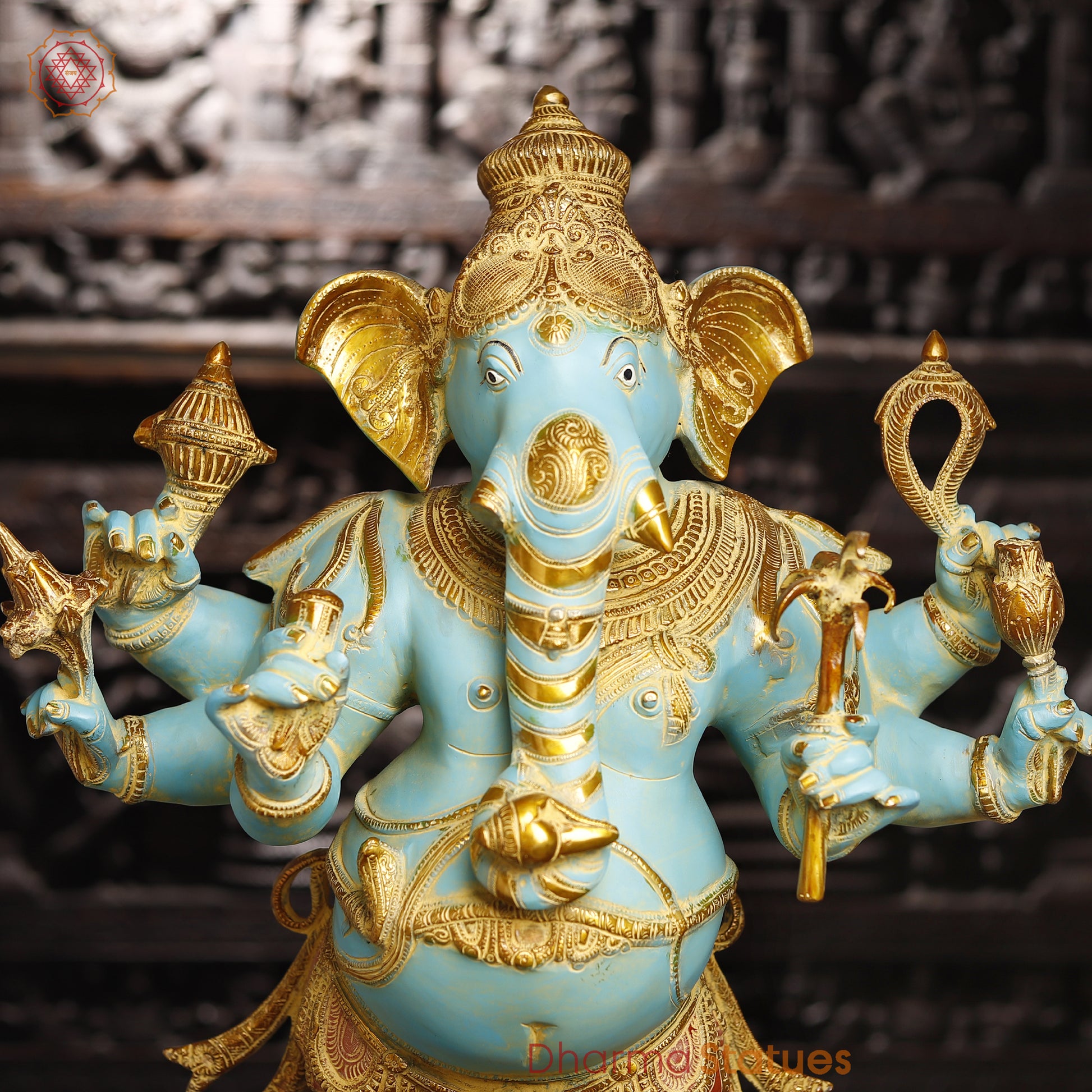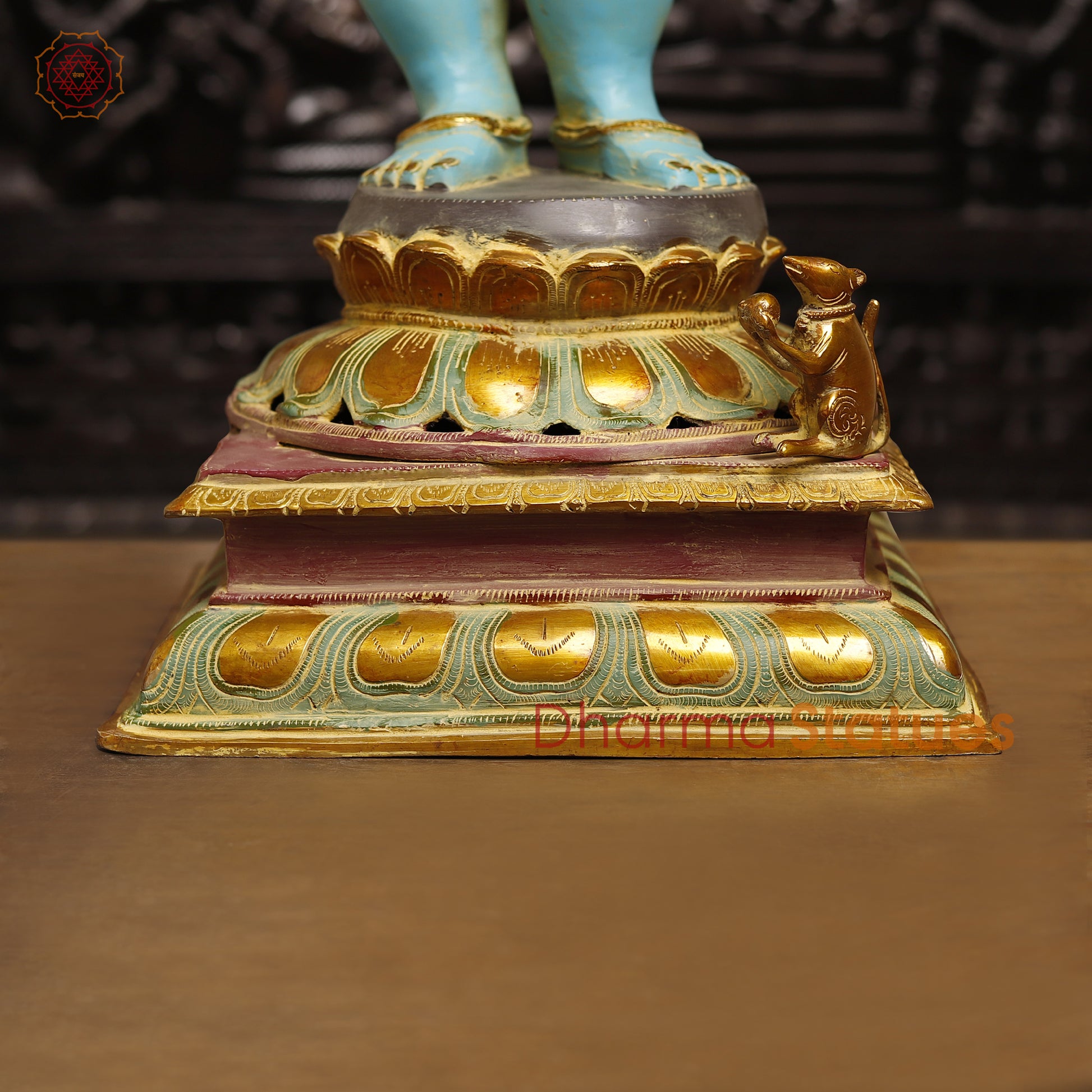 The Brass Ganeshji statue features Lord Ganesha standing gracefully on a platform, adorned with a stunning golden and sky blue finish. This exquisite piece captures the essence of Ganesha, the beloved Hindu deity known for removing obstacles and bestowing wisdom and prosperity. The golden finish adds a touch of opulence, while the sky blue accents bring a sense of tranquility and divine elegance. The intricate detailing showcases Ganesha's elephant head, serene expression, and traditional iconography, making this statue a captivating and meaningful addition to any space. The combination of colors and craftsmanship ensures that this piece stands out as a unique and beautiful representation of Lord Ganesha. Best for Wedding Gift | Diwali Gift | Gift purpose | Temple | worshipping | Perfect for Home decoration | Office decoration.