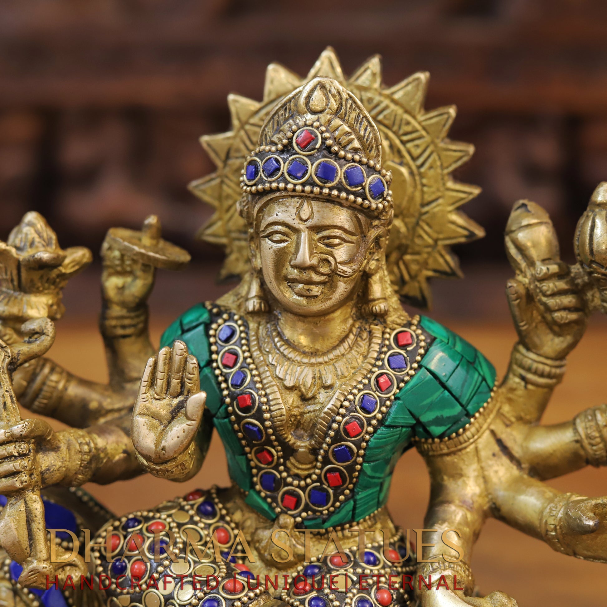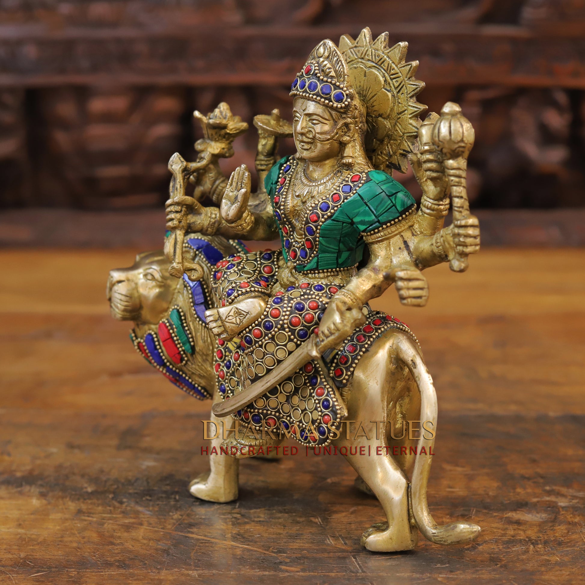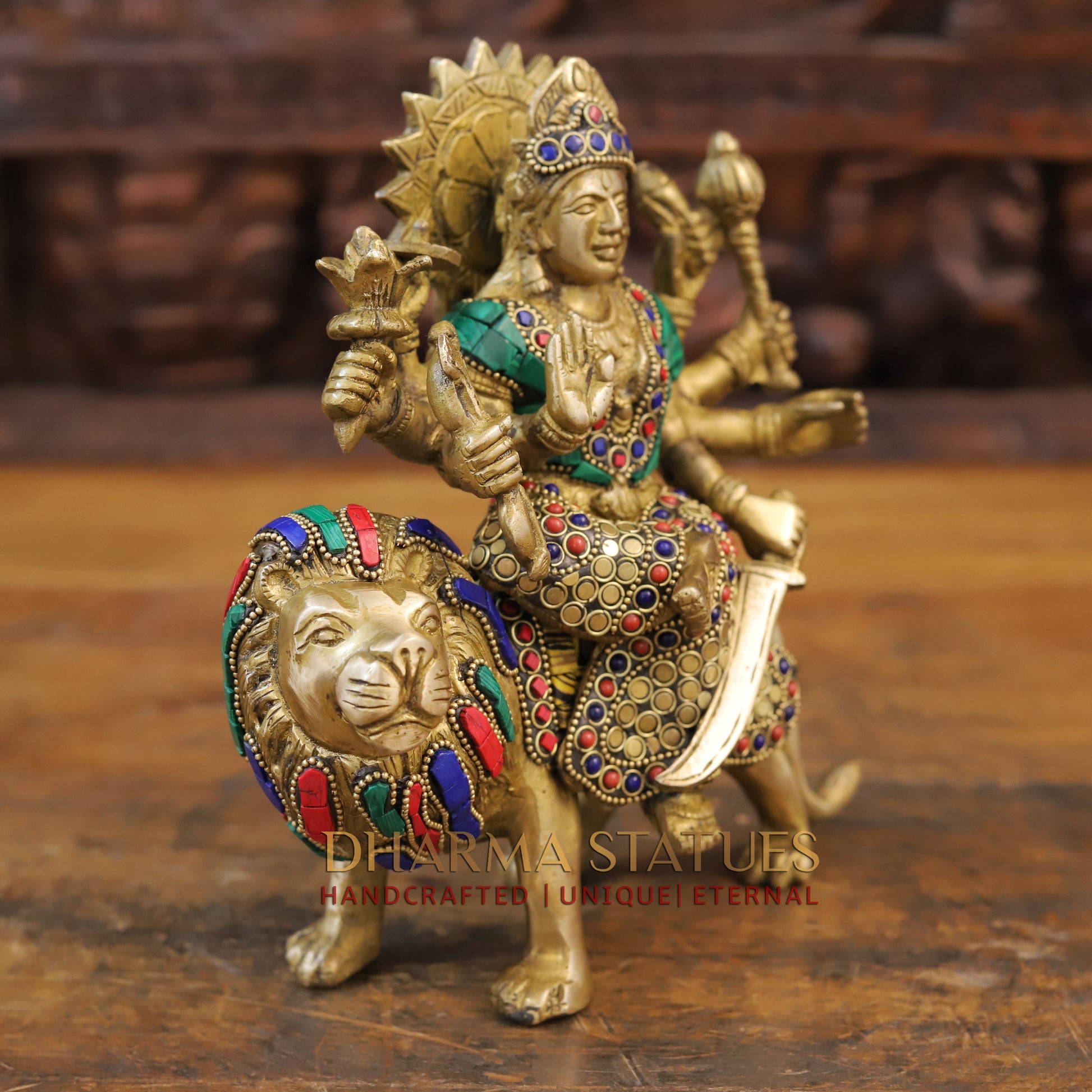 Brass Goddess Durga Statue, Golden Finish with Intricate Stone work, 9"