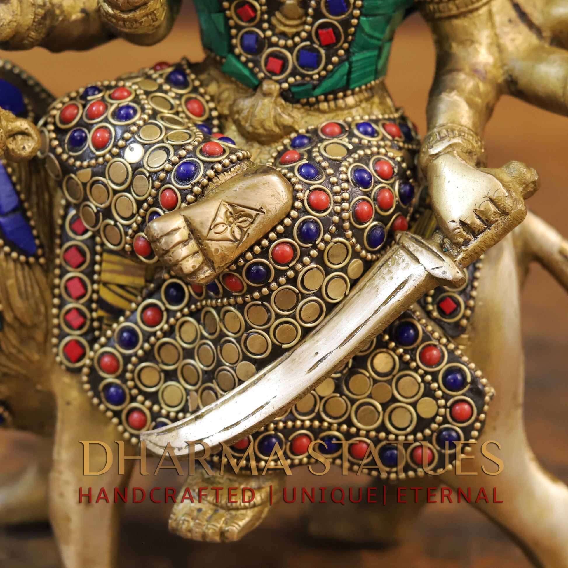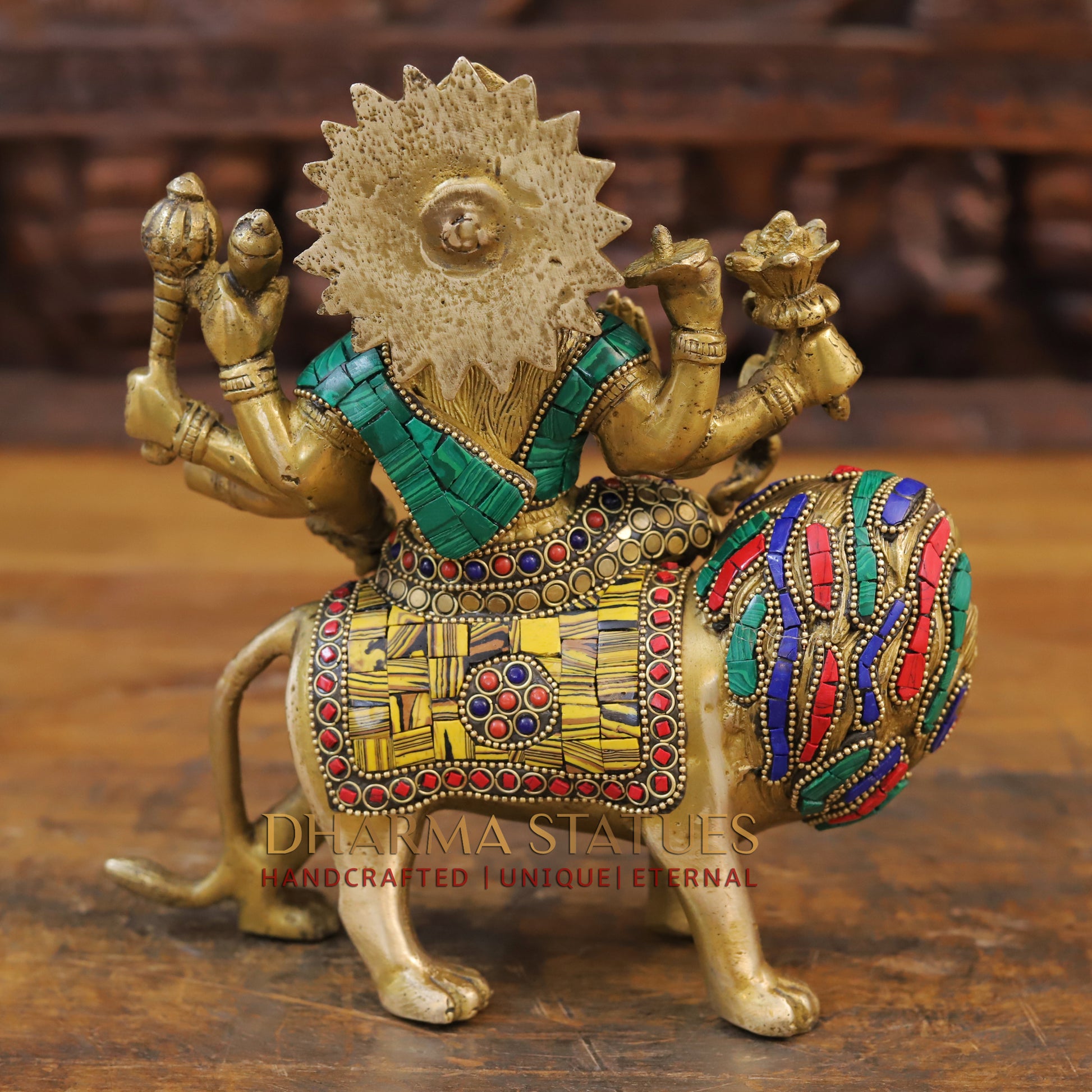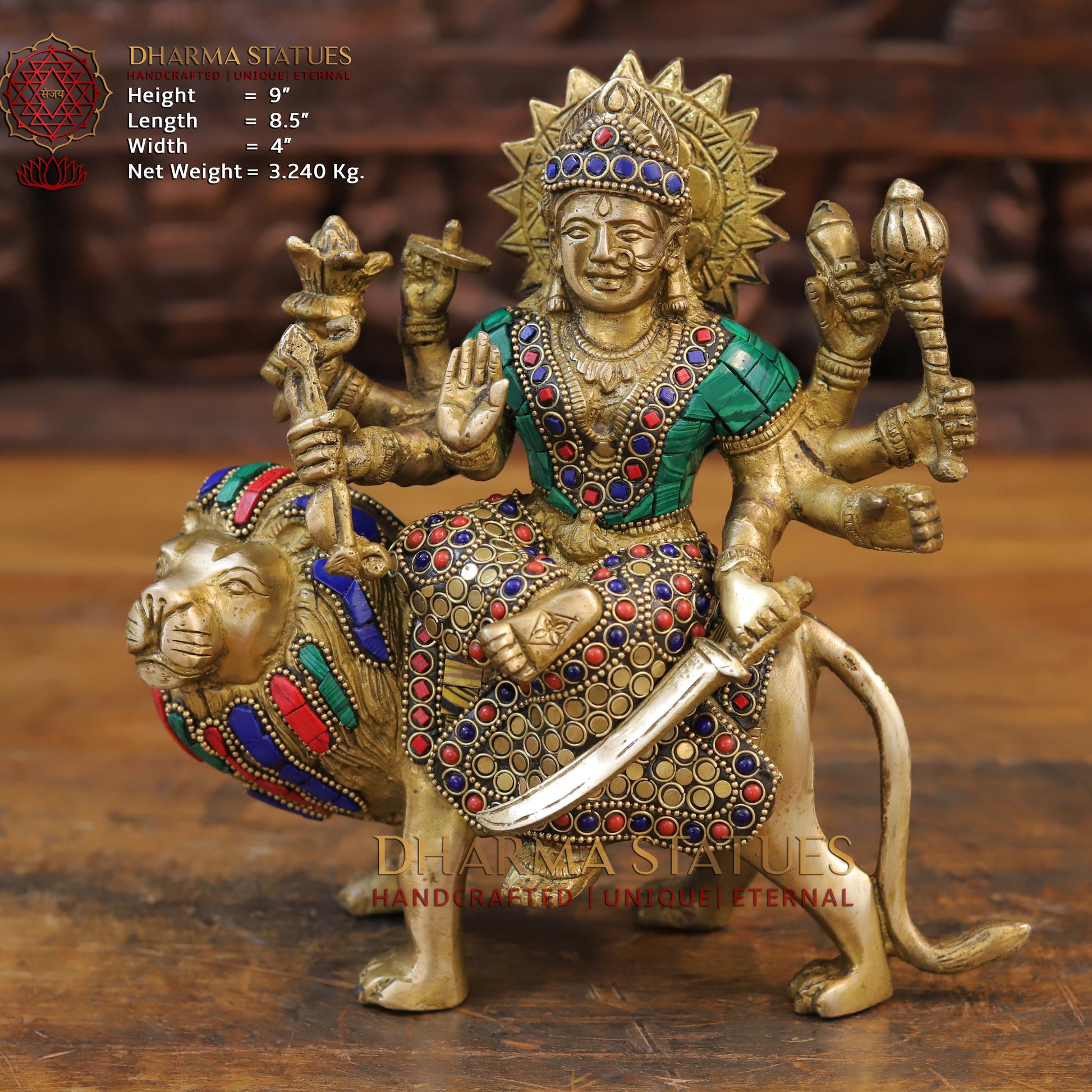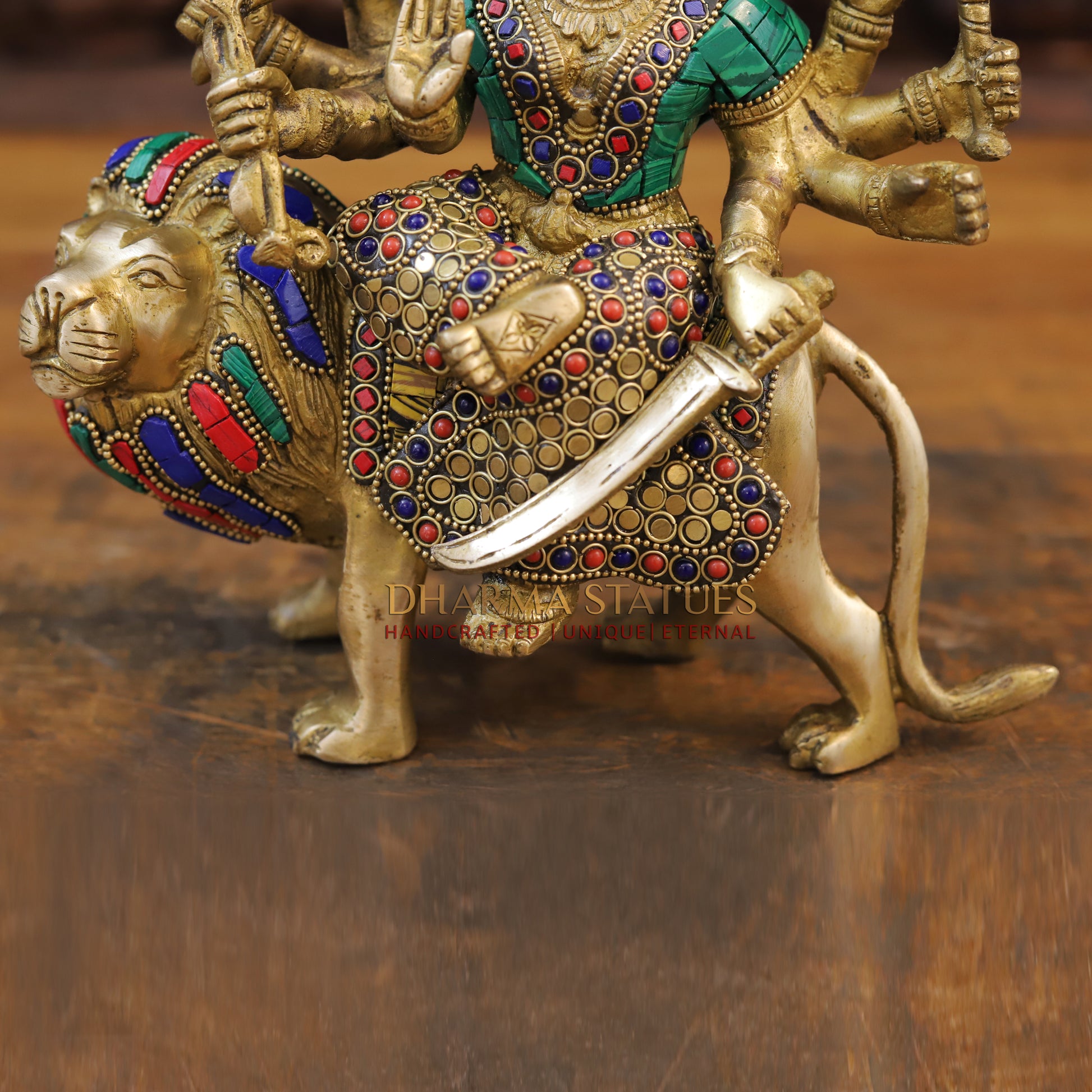 Brass Goddess Durga Statue, Golden Finish with Intricate Stone work, 9"