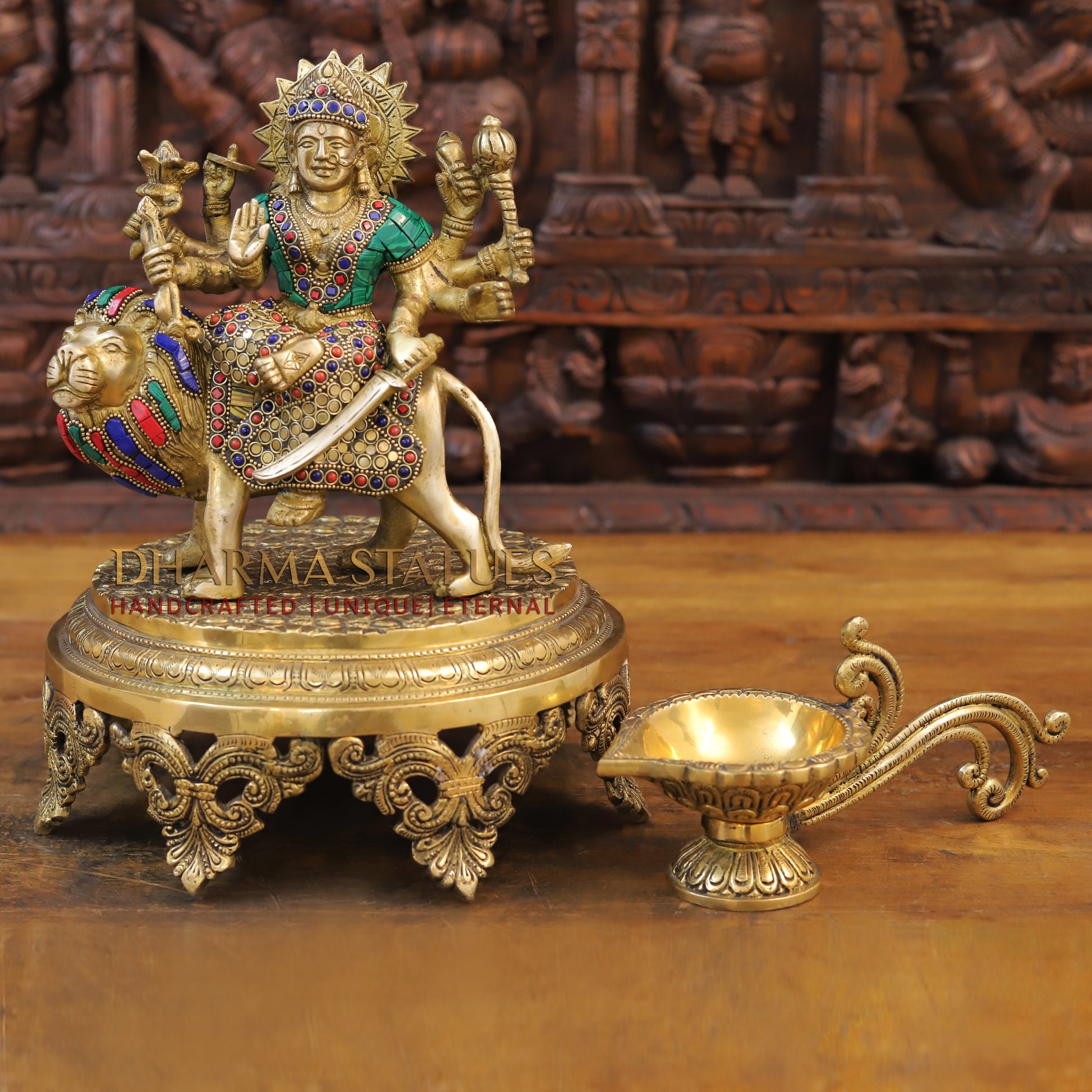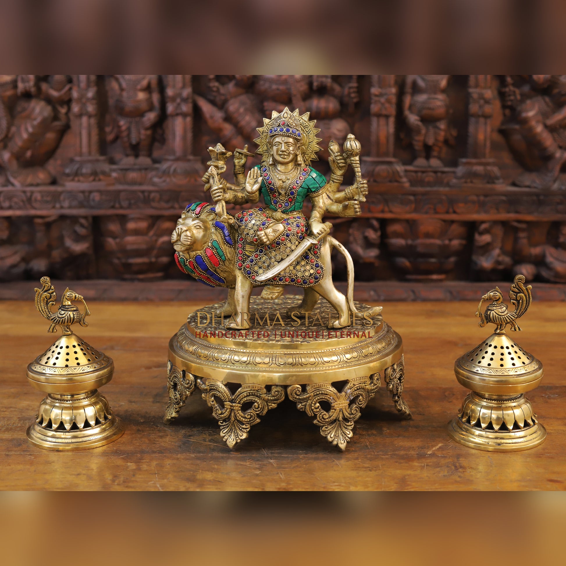 This exquisite Brass Goddess Durga Idol features intricate golden and stone work, adding a touch of elegance to any space. Its craftsmanship showcases expertise in brass and stone materials. It represents power, protection, and femininity. The perfect addition to your collection Best for Wedding Gift | Diwali Gift | Gift purpose | Temple | worshipping | Perfect for Home decoration | Office decoration.
