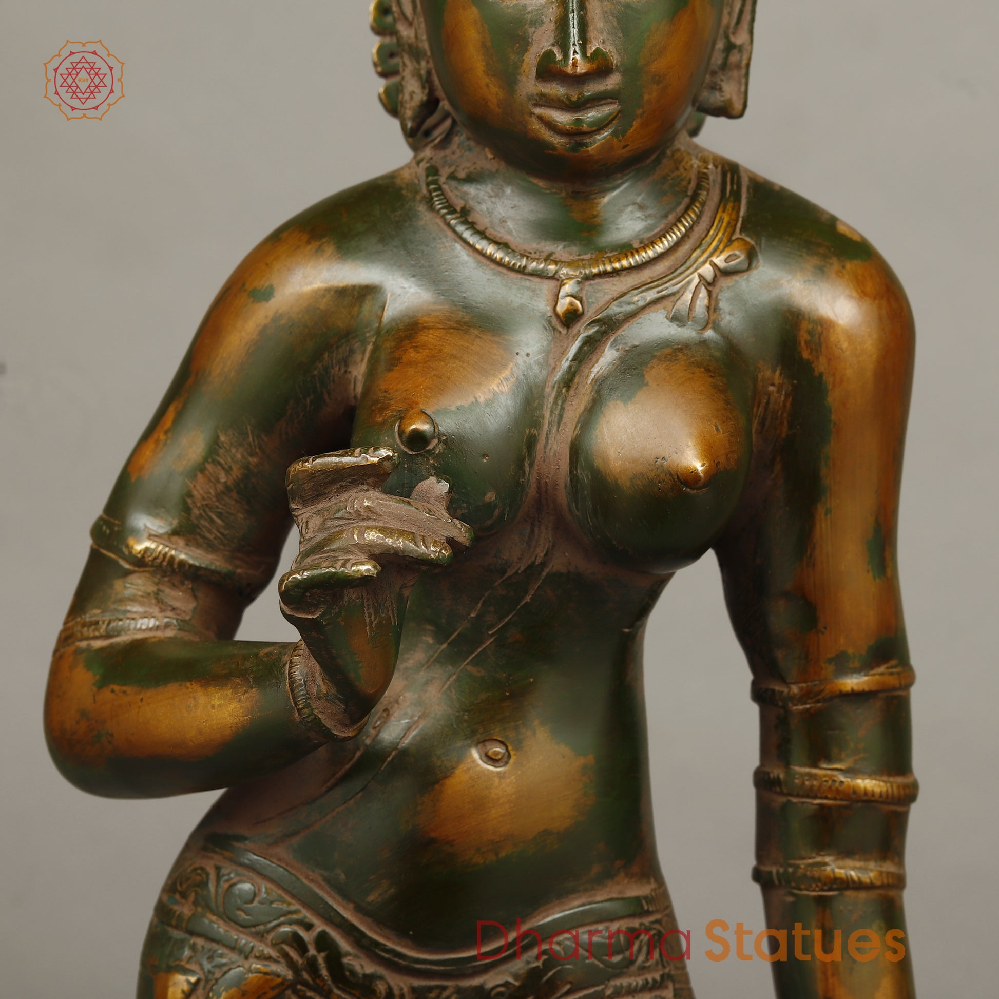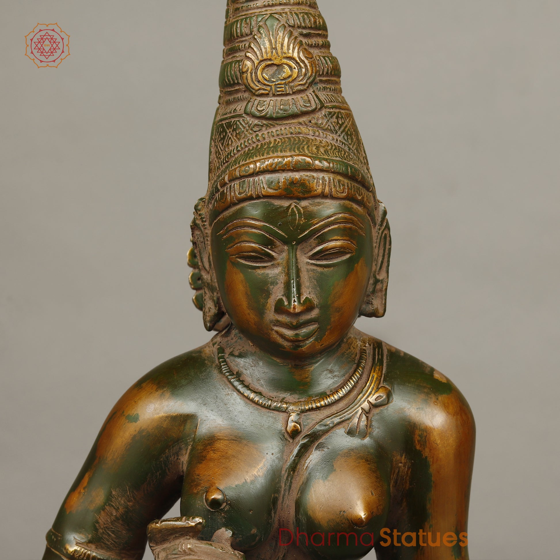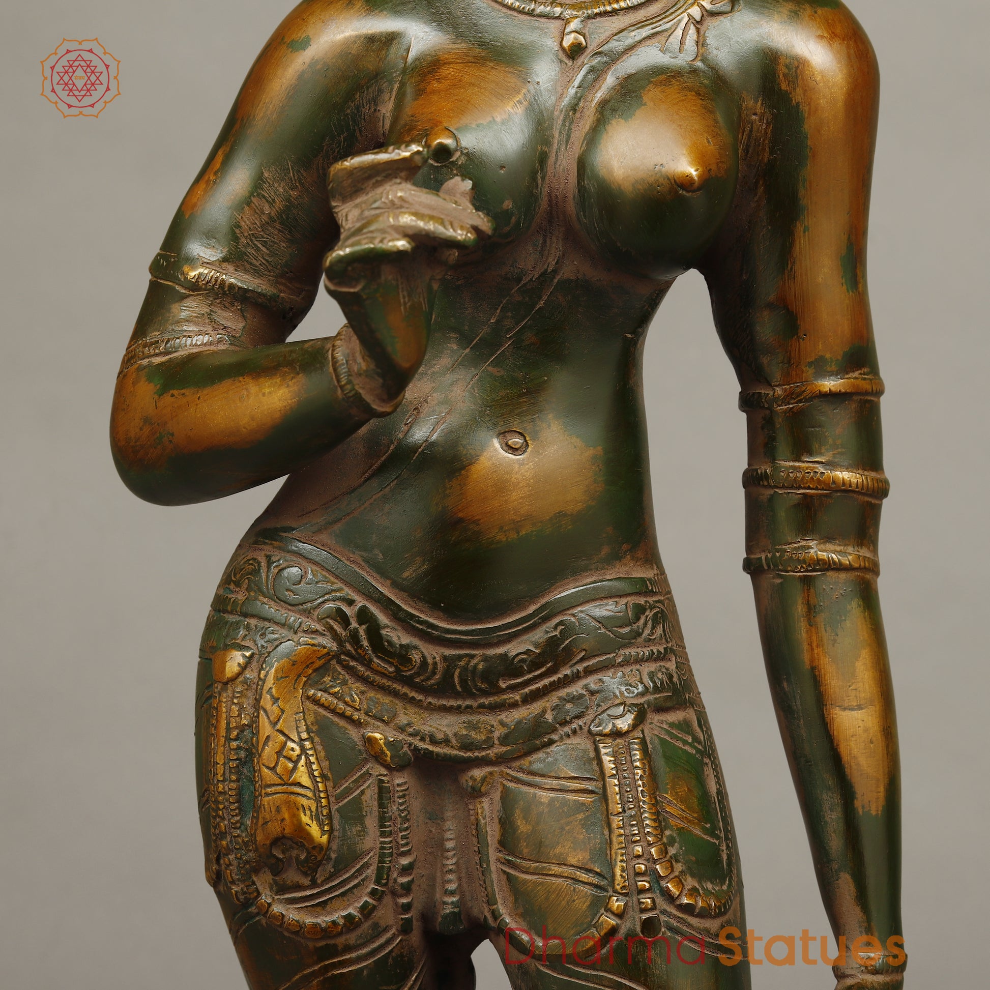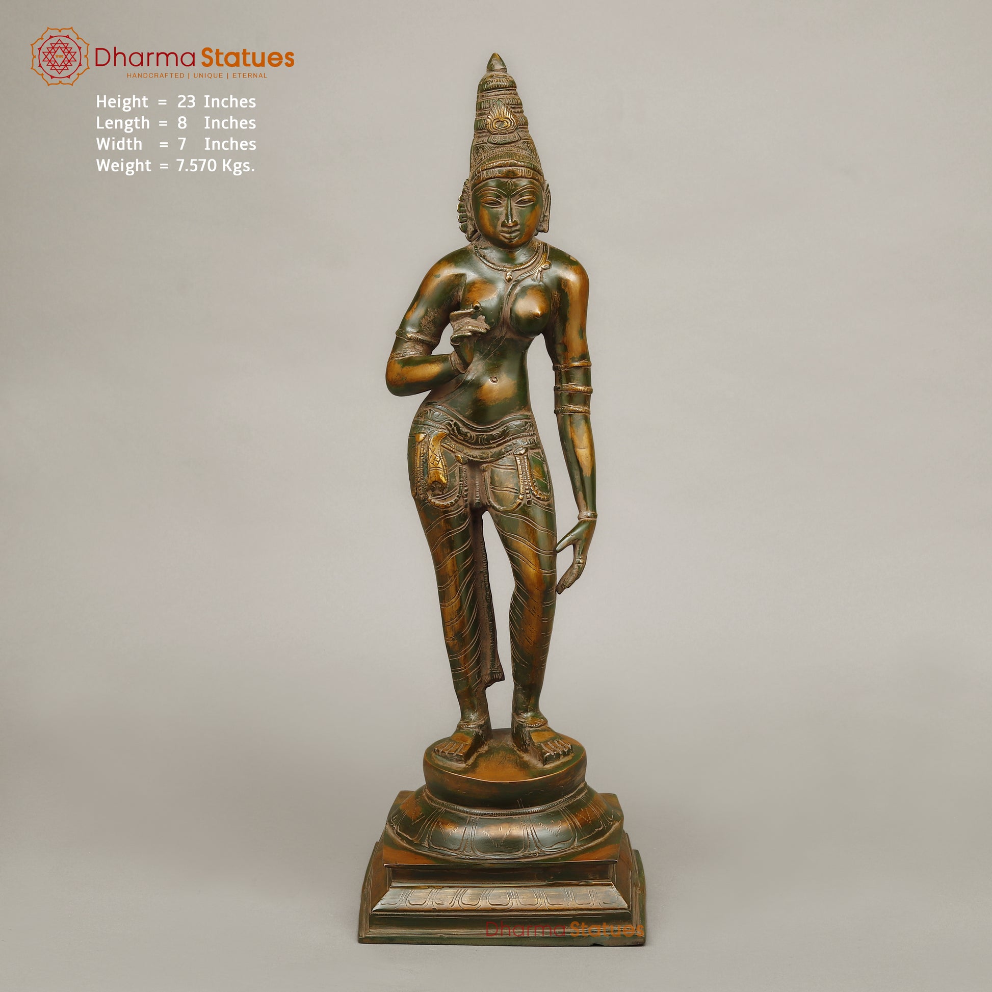 The Brass Goddess Uma stands at 23 inches tall and features a vibrant, multi-color finish. Crafted from durable brass, this statue embodies the beauty and strength of the goddess herself. Bring a touch of divinity and grace to your space with this stunning piece.